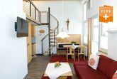 Es gibt einen Schlafraum mit Doppelbett, eine offene Galerie mit Doppelbett, einen Wohnraum mit Polstersitzgruppe, Essecke und Kochnische und ein Bad mit Dusche, Waschtisch und WC.