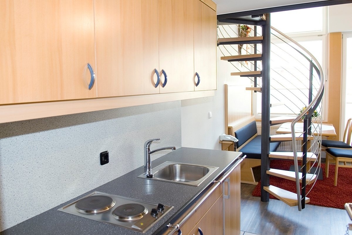 Die Kochnische verfügt über einen Kühlschrank, einen 2-Platten-Herd, eine Kaffeemaschine und eine Mikrowelle, die mit einem Grill ausgestattet ist.