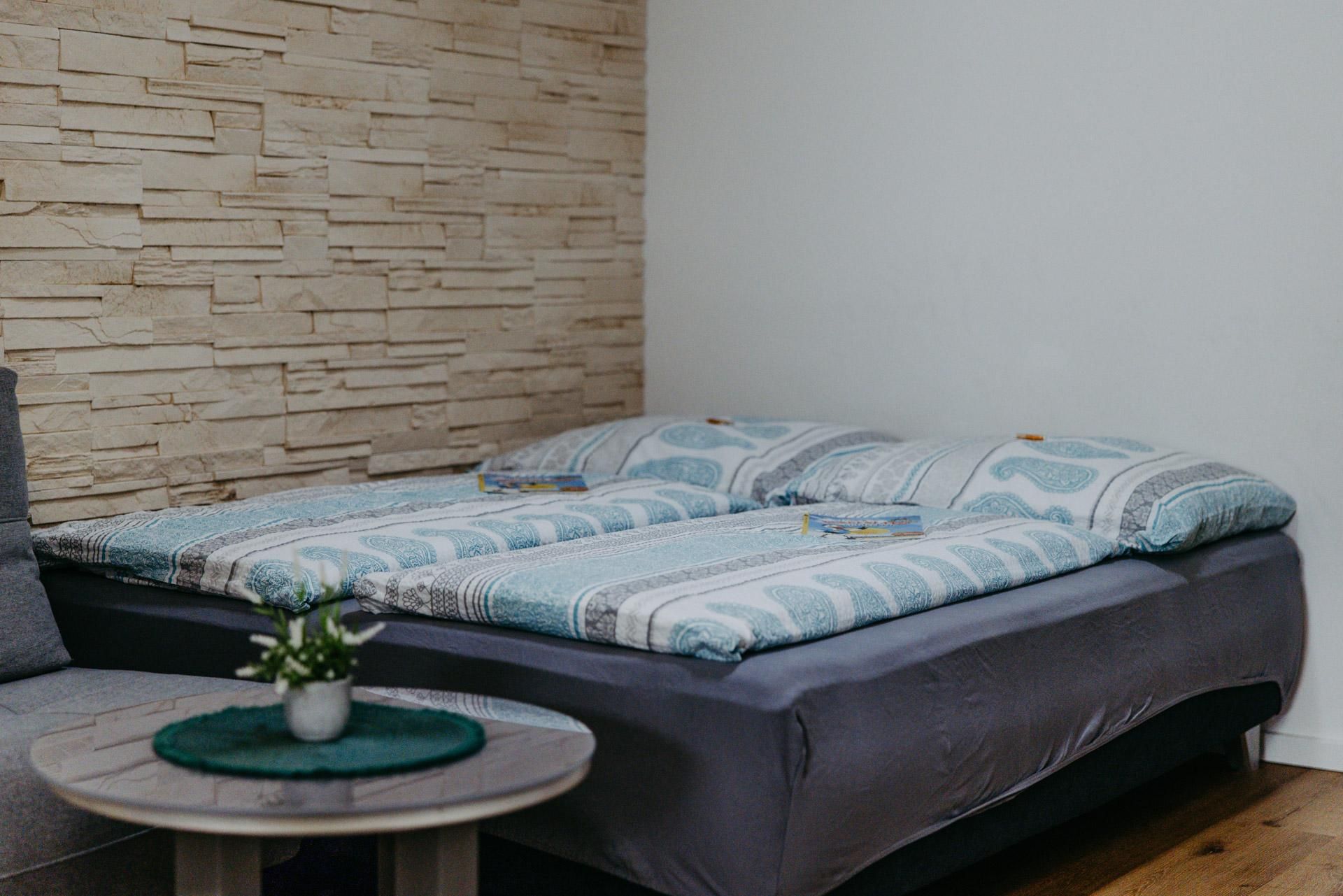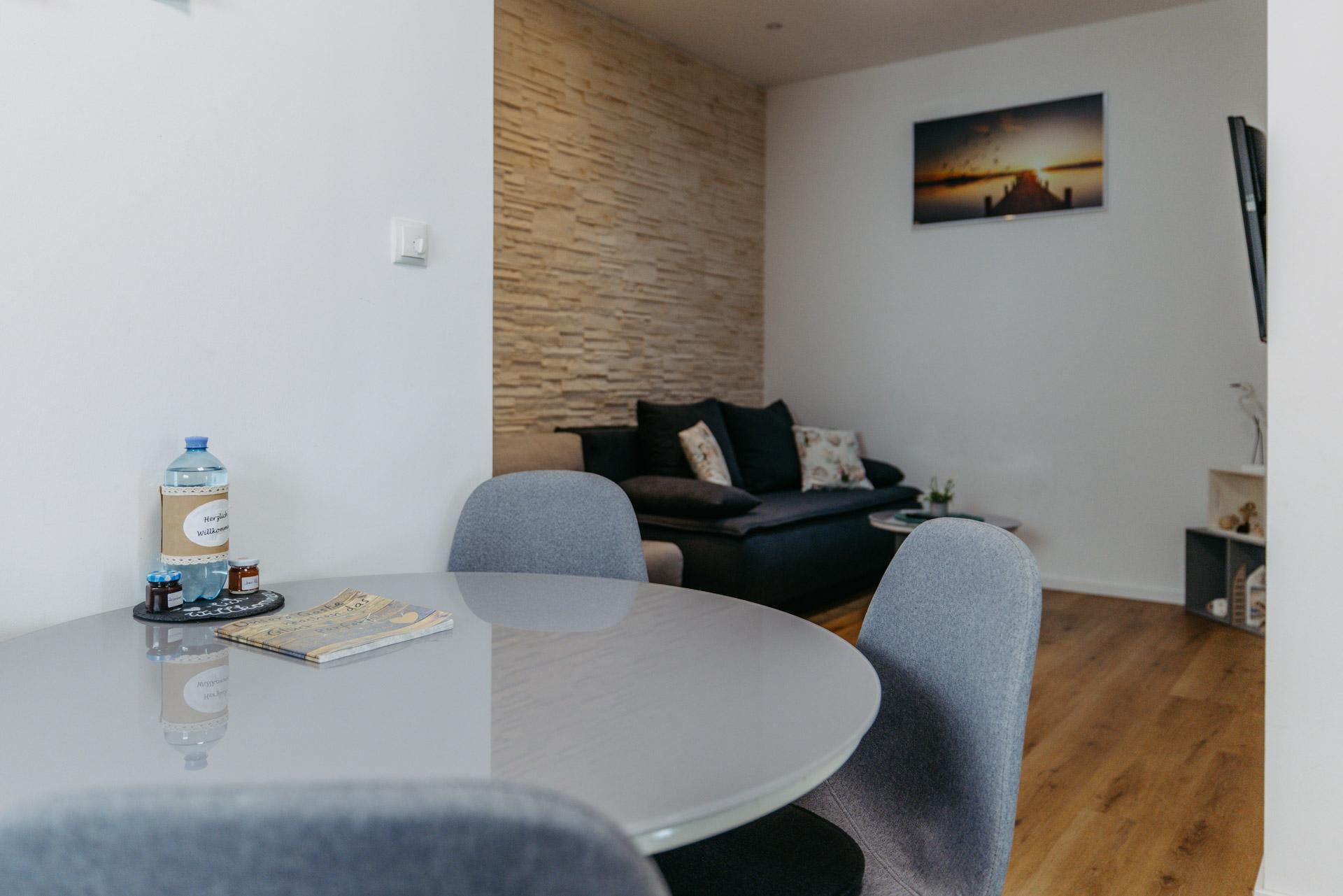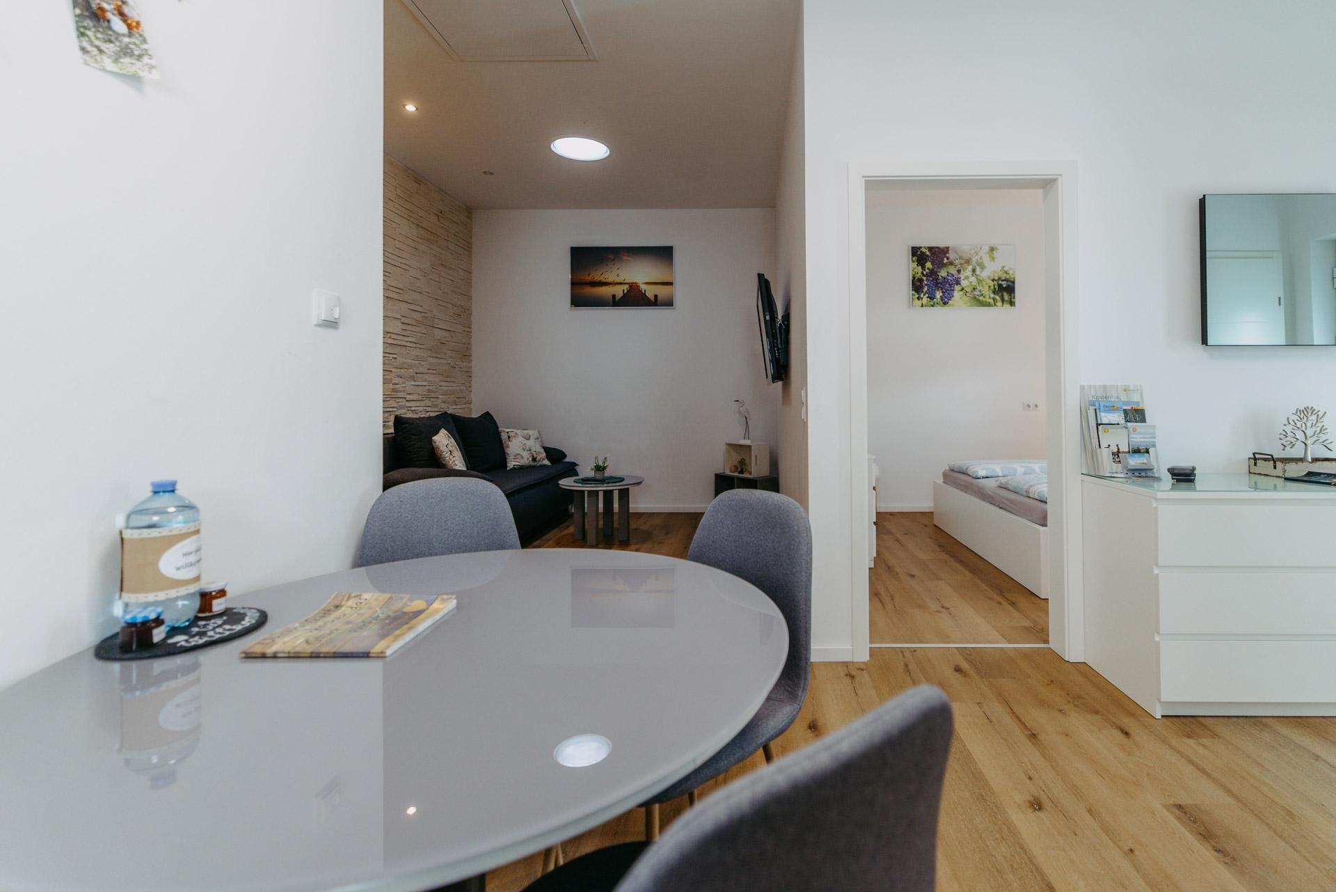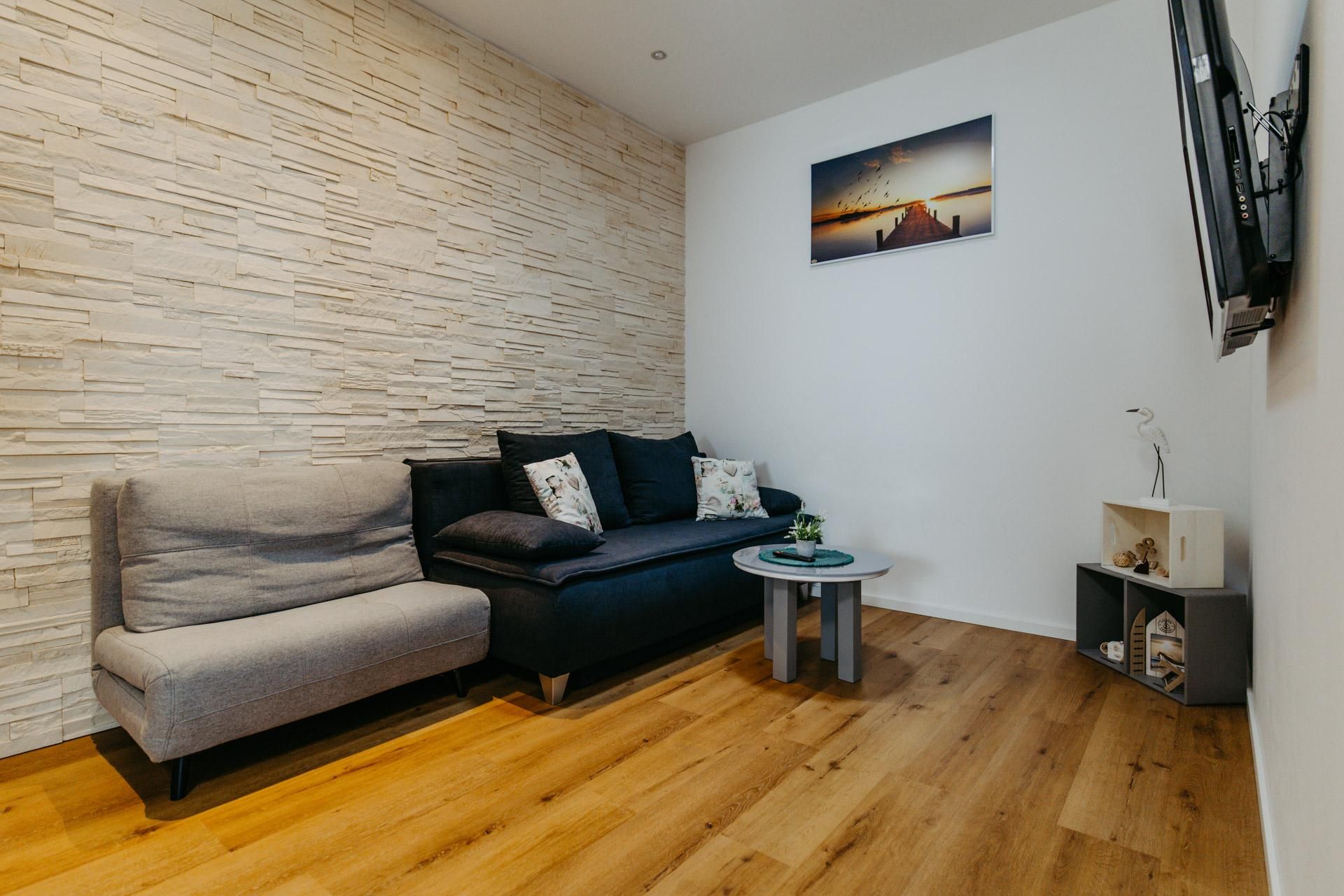 Unsere 45 m² Ferienwohnung Marlena unterteilt sich in einen sehr gemütlichen und mit viel Liebe eingerichteten Wohn-Essbereich. Die erstklassig ausgestattete offene Wohnküche bietet alles für ein gemeinsames Frühstück, Mittag- und Abendessen mit der ganzen Familie. Die Couch kann zum Schlafen von einer Person genutzt werden, aber auch ausgezogen für zwei Personen. Der große Flat-TV und das kostenlose WLAN sorgen für Unterhaltung bei Groß und Klein. Ein separates Schlafzimmer mit Doppelbett lädt zum gemütlichen Schlaf ein. Das modern eingerichtete Badezimmer ist mit WC und Dusche ausgestattet.