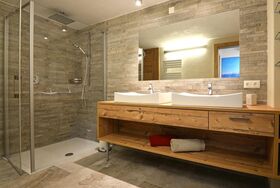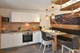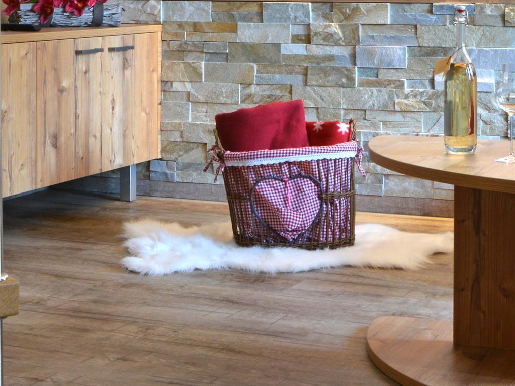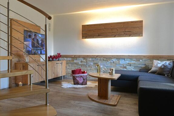 Das stilvoll eingerichtete Appartement verbindet luxuriösen Wohnkomfort mit alpenländischer Tradition. Im Erdgeschoß erwartet Sie ein großzügiger Wohnbereich mit gemütlicher Sitzgruppe und Flat-TV. Die moderne, offene Wohnküche mit integrierter, maßgefertigter Essgruppe für fünf Personen lädt zum Verweilen und Zusammensitzen ein. Im Obergeschoß der Maisonette befinden sich zwei getrennte Schlafräume. Genießen Sie die besondere Atmosphäre des urigen Doppelzimmers mit Hüttencharme! Erholsame Ruhestunden erwarten Sie auch im zweiten Zimmer – inkl. Flat-TV: Hier stehen Ihnen ein großzügiges, bequemes Doppelbett (200 x 200 cm) und ein gemütliches Einzelbett (80 x 175 cm) zur Verfügung. Im großen Wohlfühlbadezimmer mit Regendusche und Doppelwaschbecken lässt sich wunderbar entspannen – wie im eigenen Spa! Das WC ist separat. Viel Stauraum finden Sie im großzügigen Garderoben- und Eingangsbereich, wo Sie die Möglichkeit haben, Ihr Sport- und Skimaterial abzulegen.