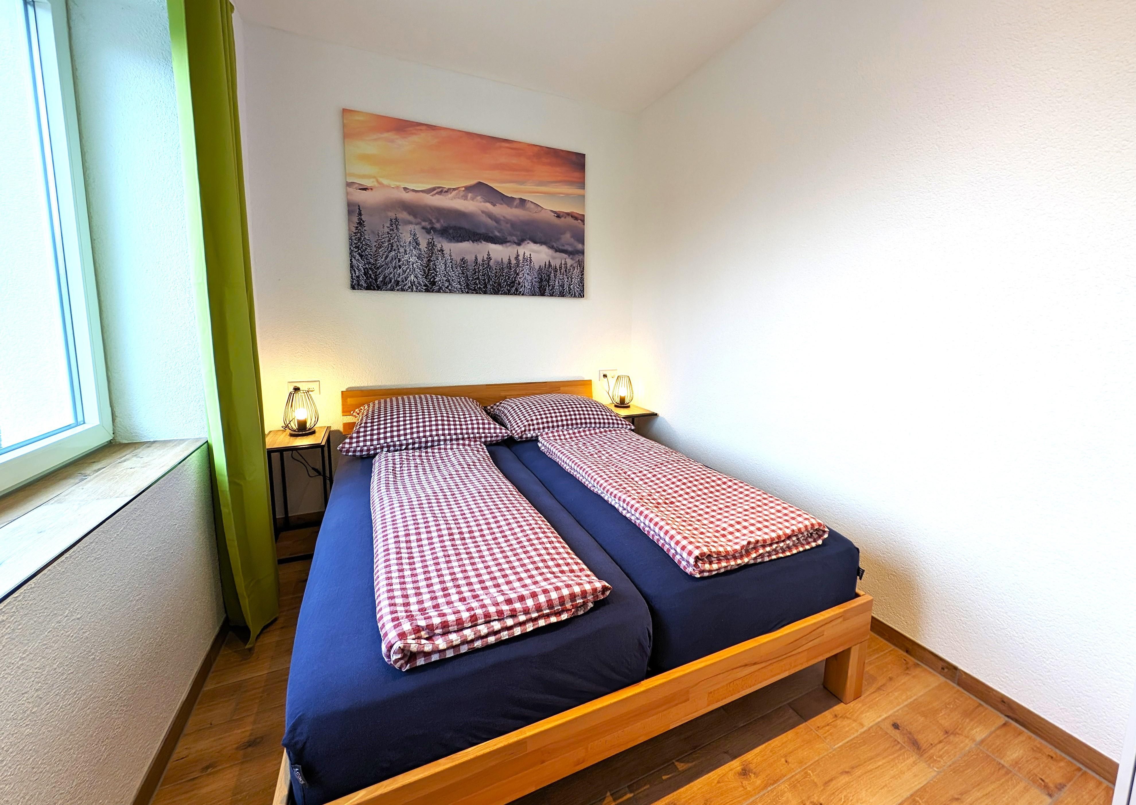 SZ1 (Doppelbett und zwei Einzelbetten), SZ2 (Doppelbett), im Wohnbereich zwei weitere Einzelbetten (90×200 als Wand/Schrankbett ausklappbar)