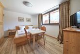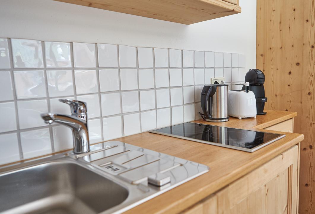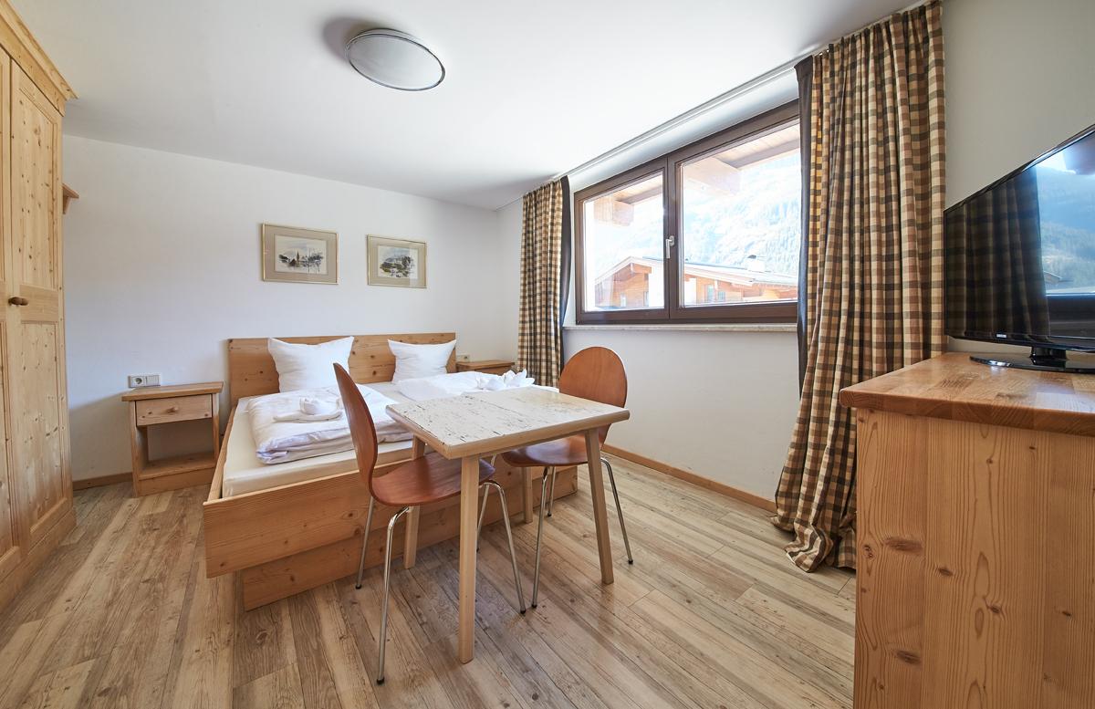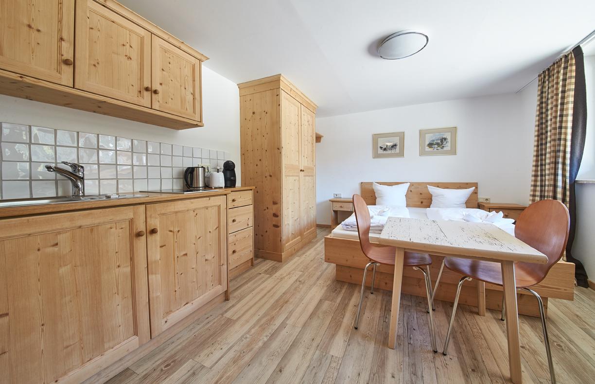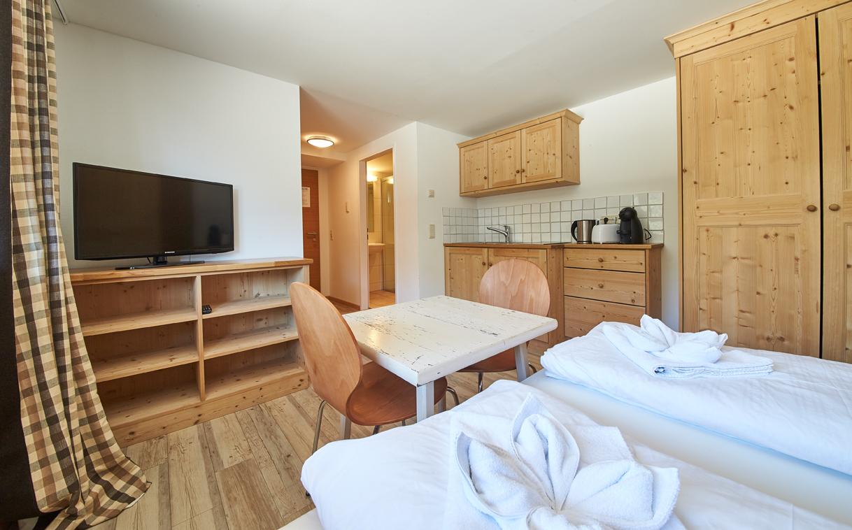 Kleines, gemütliches 22 m² Studioappartement für bis zu zwei Personen. Das Appartement enthält ein Badezimmer mit offener Dusche, separater Toilette sowie einer Küchenzeile und einem Doppelbett. Weiters befindet sich im Gebäude ein Wellnessbereich mit Ruheraum, separatem Duschbereich und Sauna. Im Skiraum befindet sich für jedes Appartement ein Kasten mit Schuhheizung, in dem das gesamte Skiequipement verstaut werden kann.