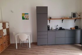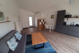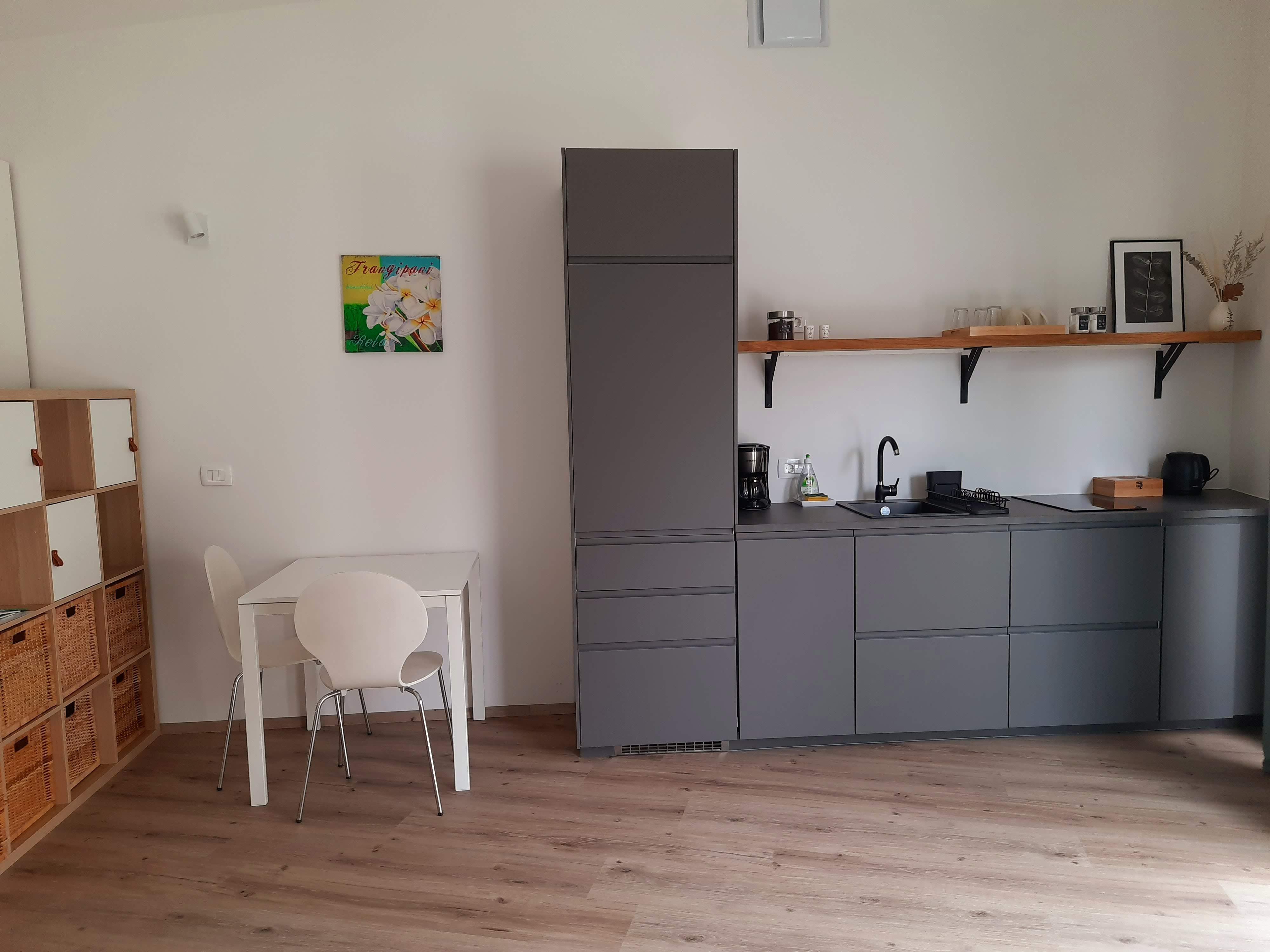 Eine voll ausgestattete Küche mit Mikrowelle, Kaffeemaschine, Wasserkocher und Geschirrspüler bietet den Komfort eigene Speisen zubereiten zu können. Sämtliche Supermärkte, der Bahnhof sowie die Therme sind bequem fußläufig erreichbar.