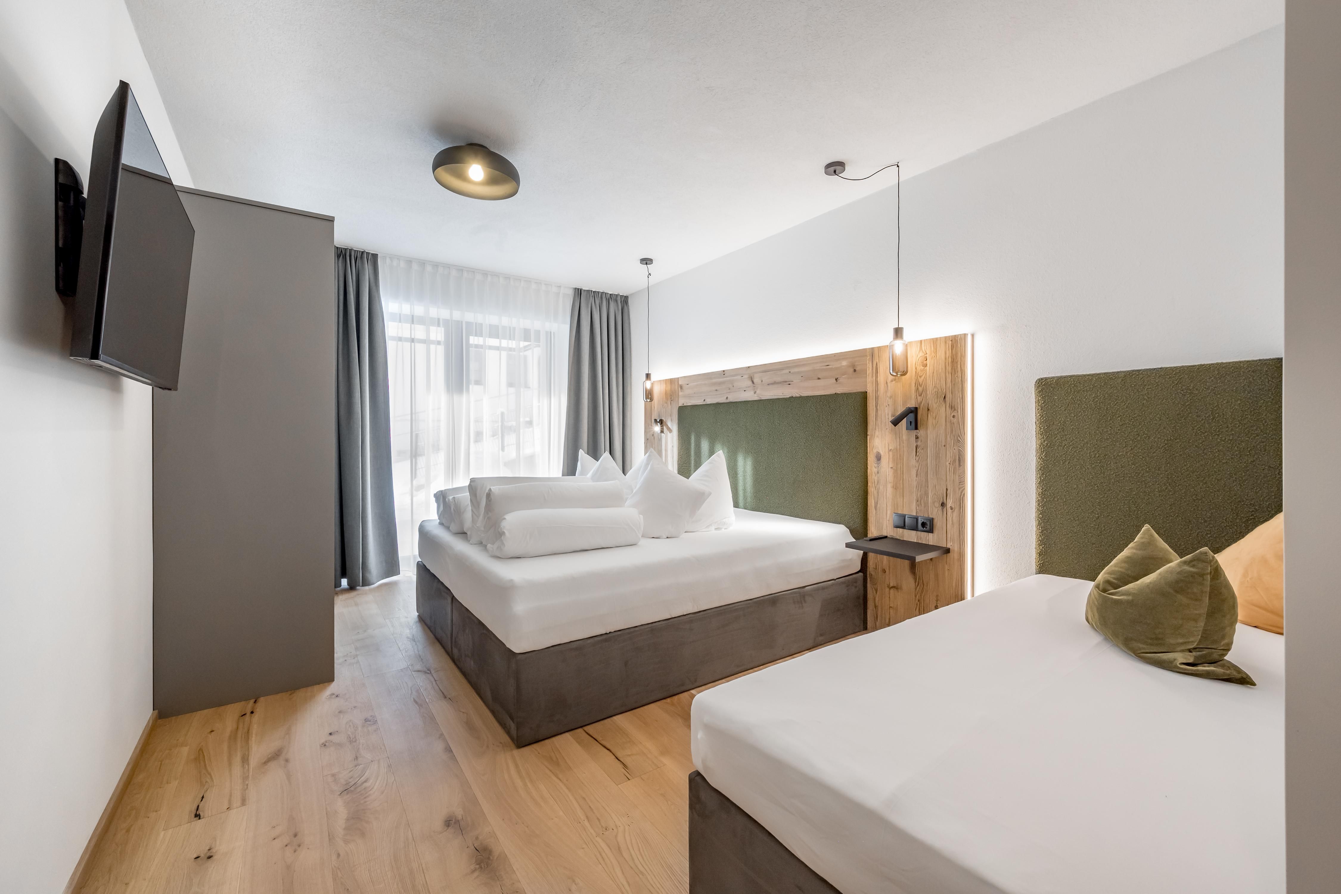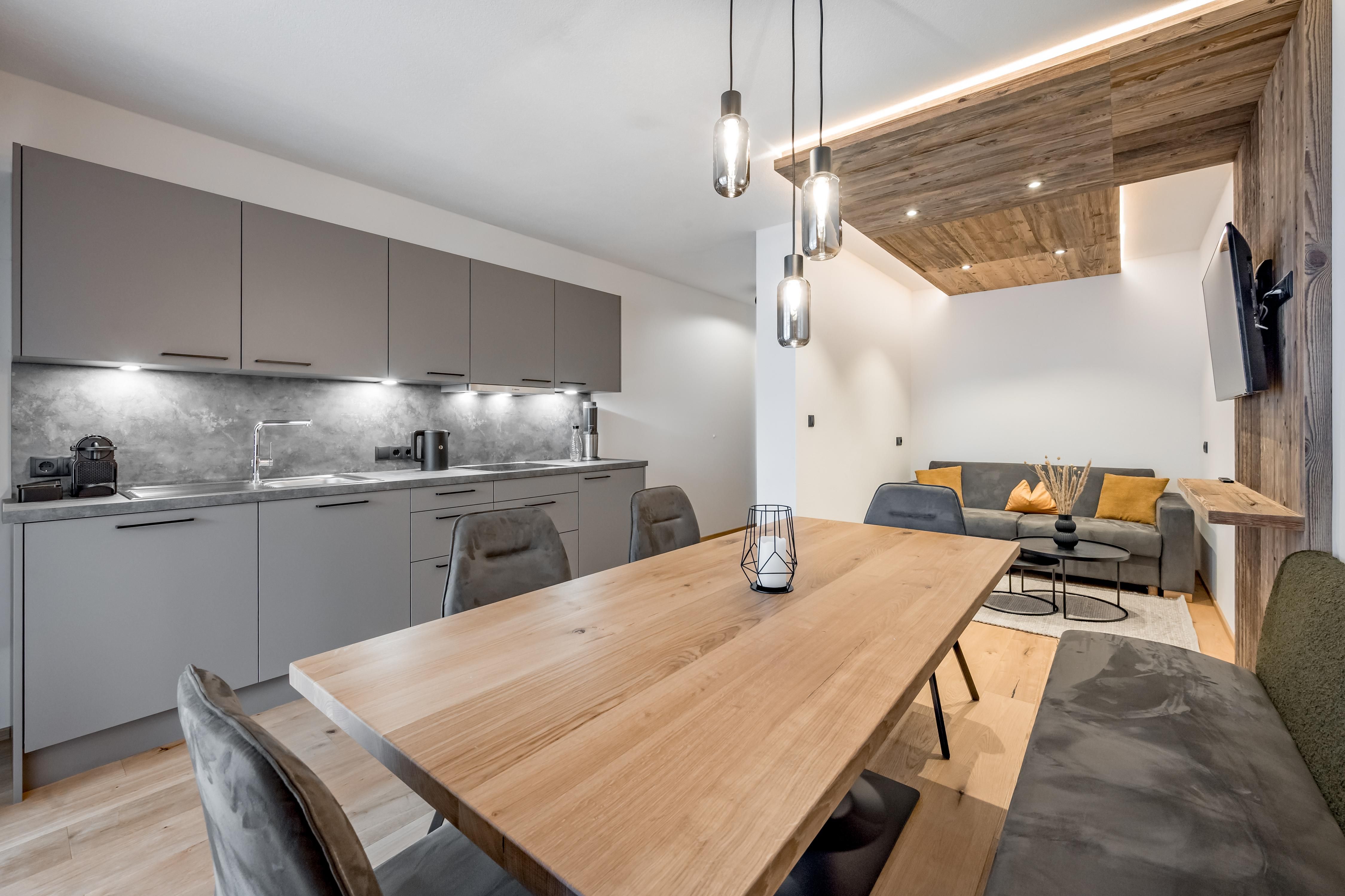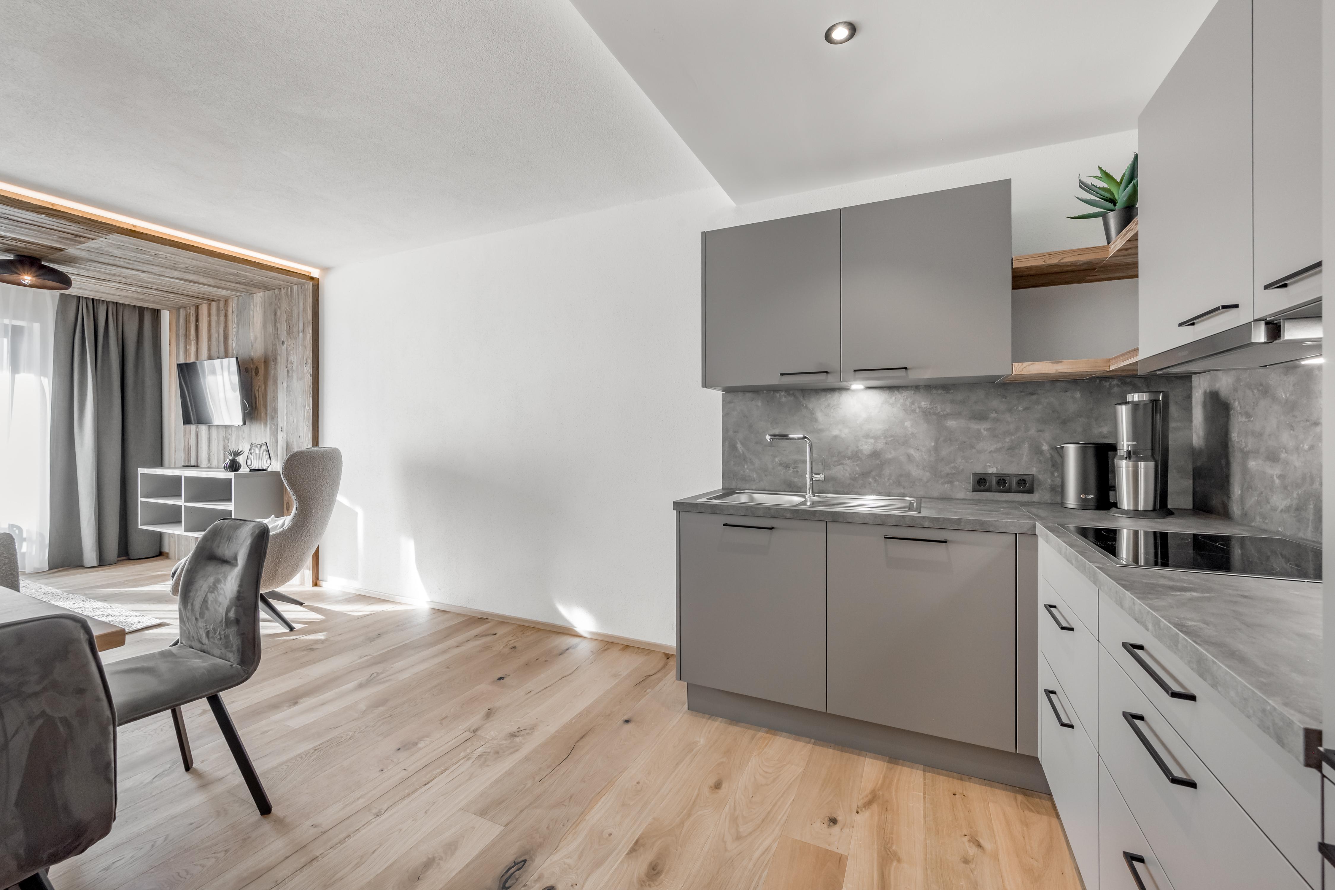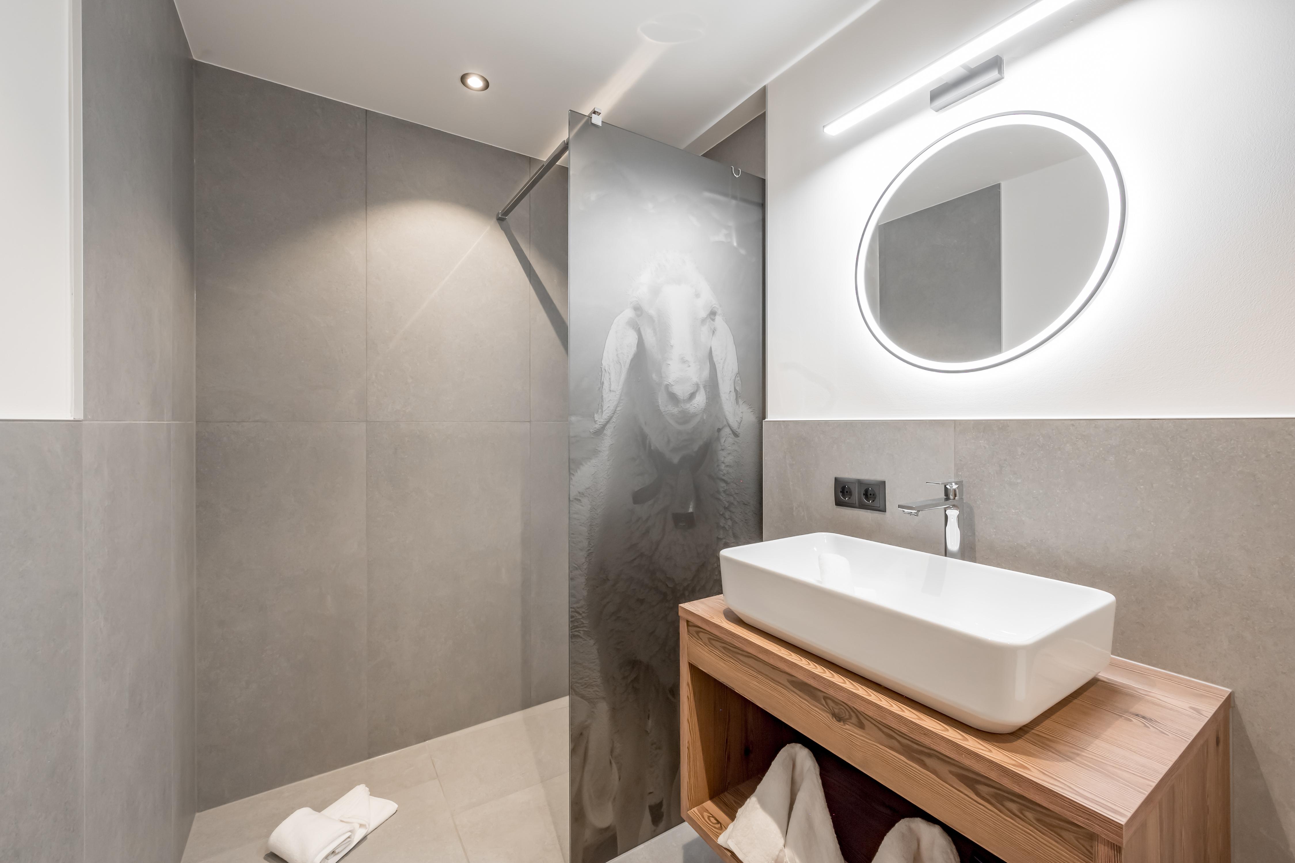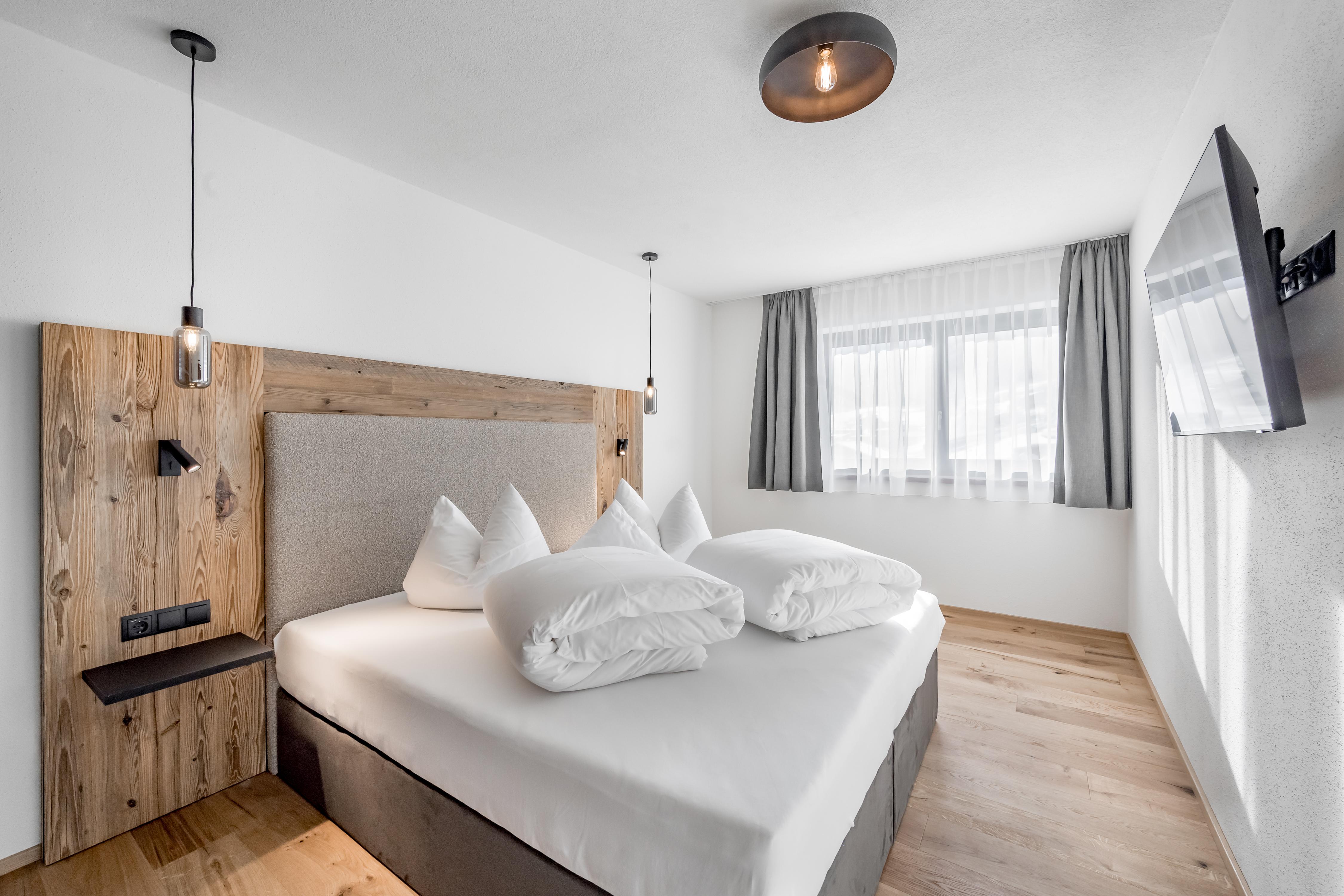 Apart Bergschaf im 1. Obergeschoss mit ca. 50 m²: 1 Doppelzimmer mit Boxspringbetten; 1 Wohnschlafraum mit Ausziehcouch für 2 weitere Personen, grundausstattung Kochutensilien, Mikrogrill, Kühlschrank mit Gefrierfach, Wasserkocher, Toaster, Soda Stream, Kaffeemaschine/ Nespresso Maschine (Kapseln bei uns erhältlich), Spülmaschine inkl. Tabs, 4-Platten Kochfeld uvm; 1 Badezimmer mit ebenerdiger Dusche und WC; Balkon; 1 Stellplatz in unserer Tiefgarage