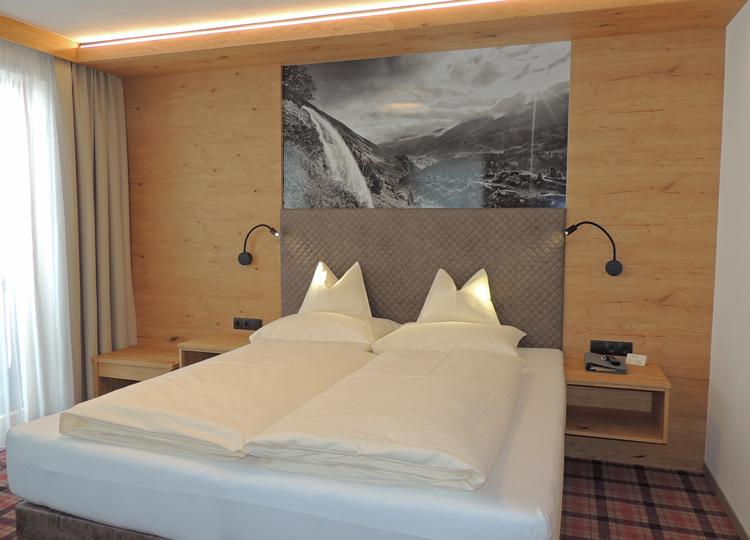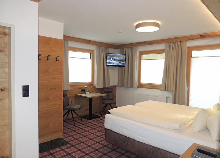 Doppelzimmer Festkogel ca. 22 m²: Doppelzimmer mit Boxspringbett, kleine Sitzecke, Kabel-TV, Safe, kleiner Balkon, Tageslichtbadezimmer mit Dusche/WC, Fön, Kosmetikspiegel.