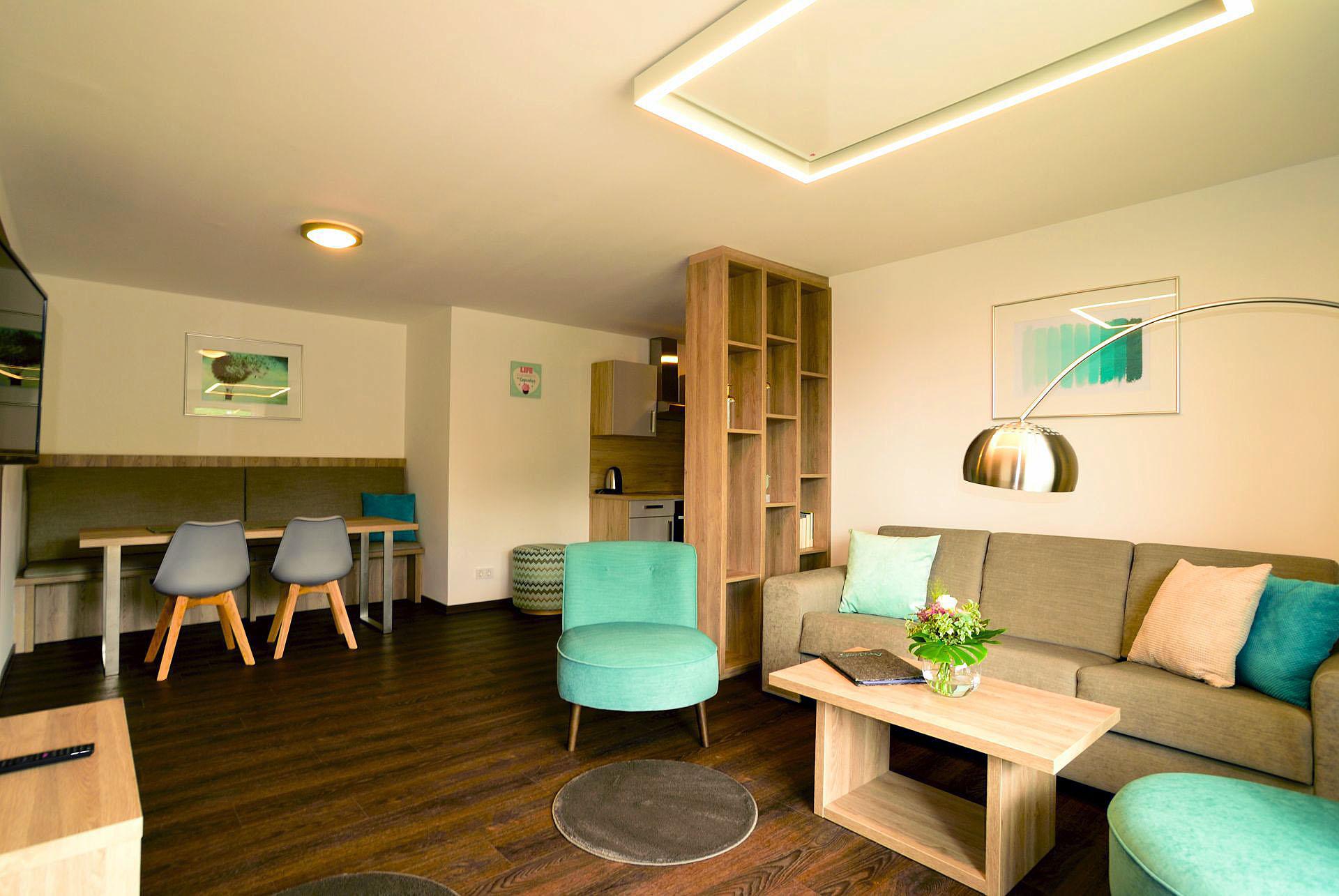 Die komfortablen und hochwertig eingerichteten Apartments sind mit funktionaler Küche, gemütlichen Ess- sowie Wohnbereich, Schlafzimmer sowie modernen Bad und separater Toilette ausgestattet. WLAN und SAT-TV sind im Preis inkludiert, ebenso wie unsere ausreichend zur Verfügung stehenden Parktplätze.