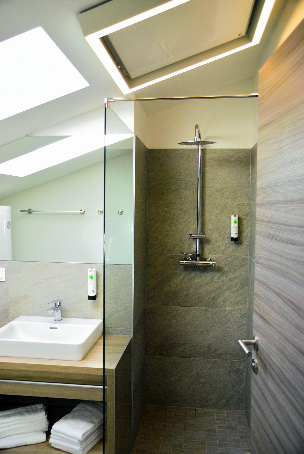 - Badezimmer mit Waschtisch, Dusche, Hand- und Duschtücher, Vorleger, Föhn, Seife, Duschgel und Kosmetiktücher