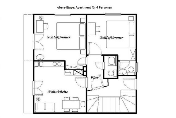 Wohnung im 1. Stock bestehend aus Wohnküche, 2 Schlafzimmer, davon eins mit separater Toilette, Nasszelle und Balkon mit Seeblick