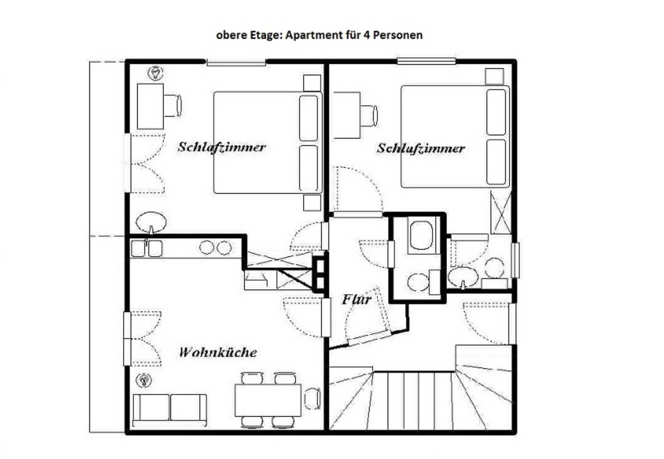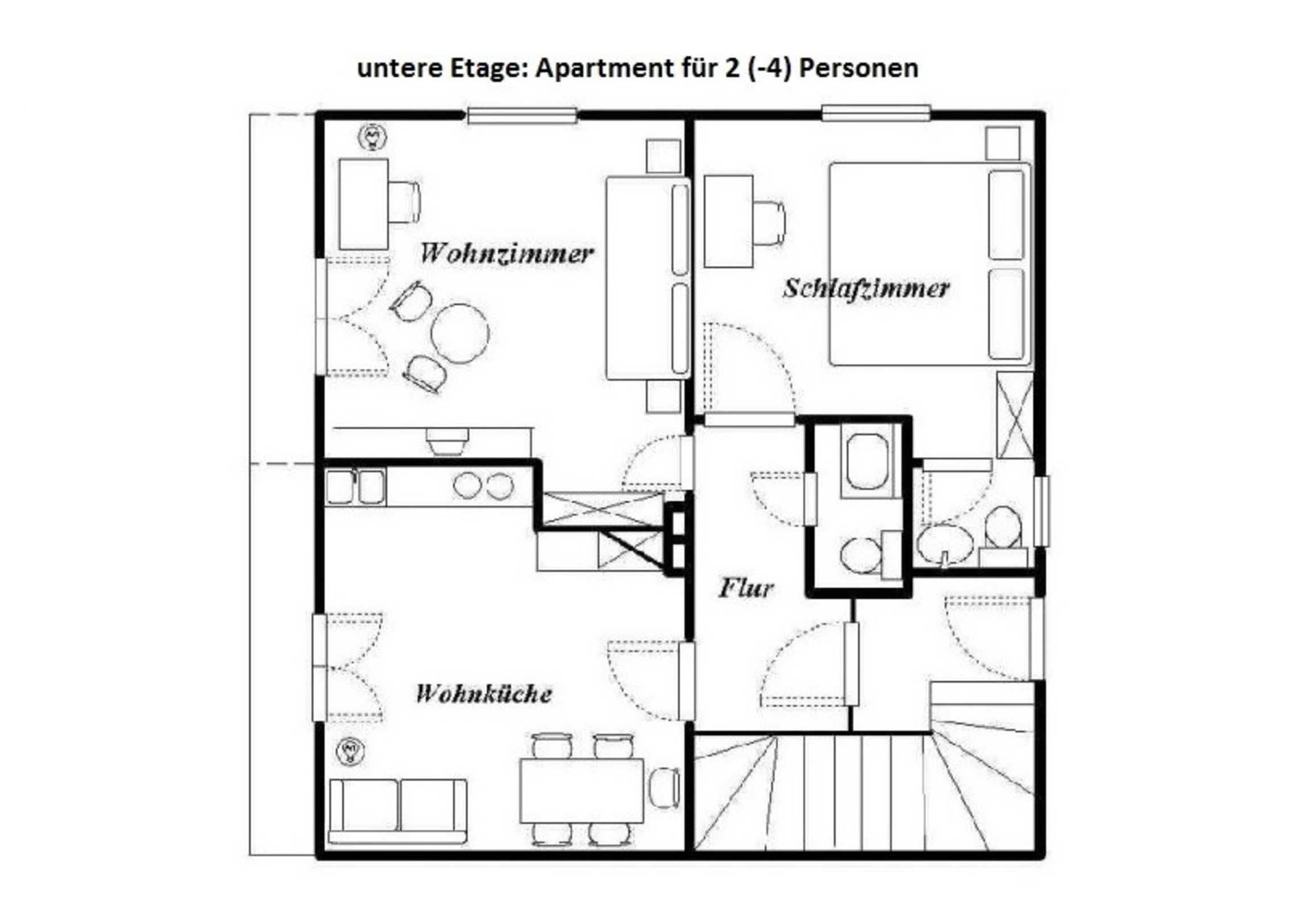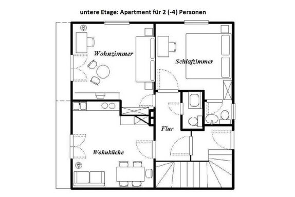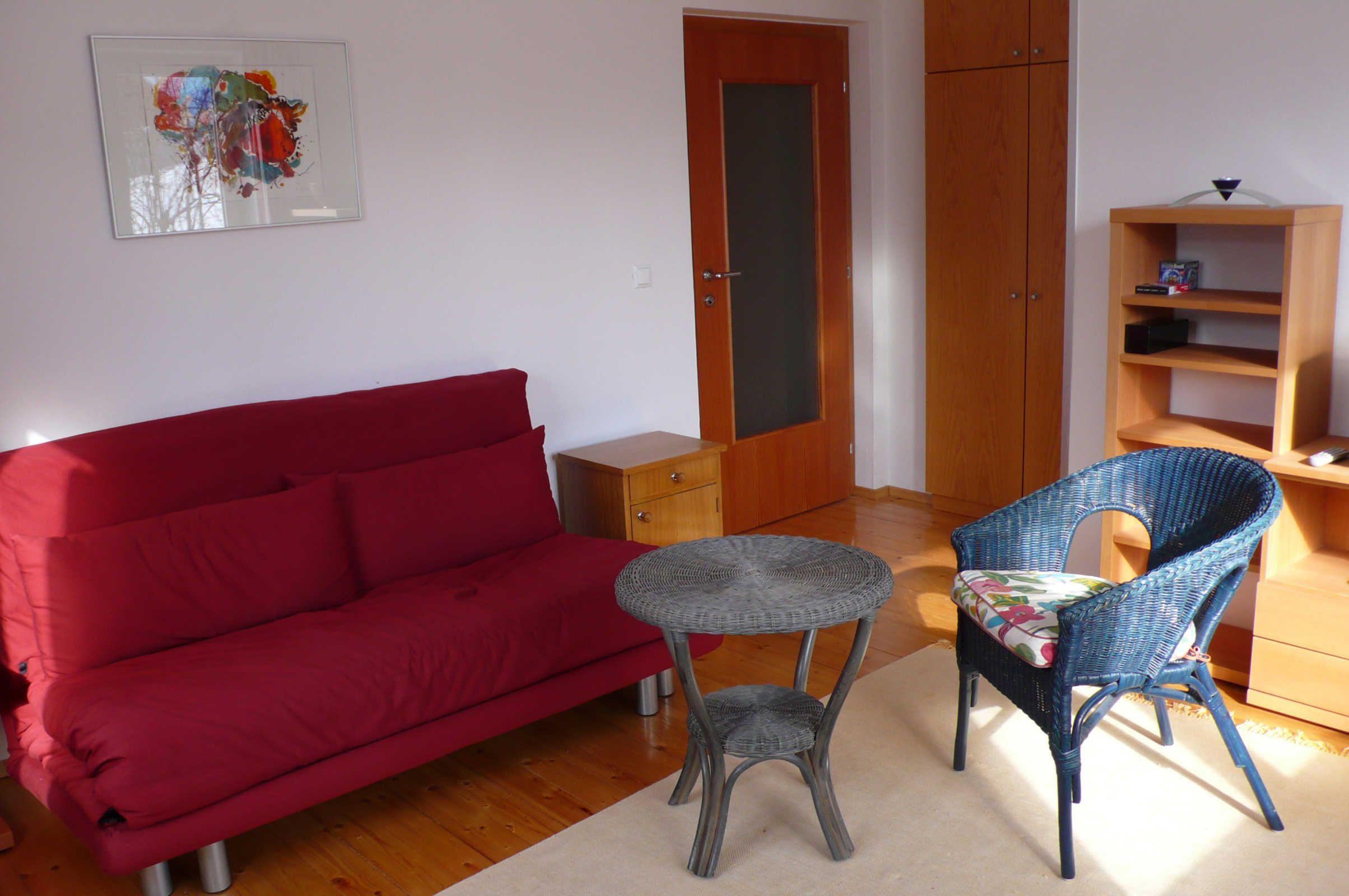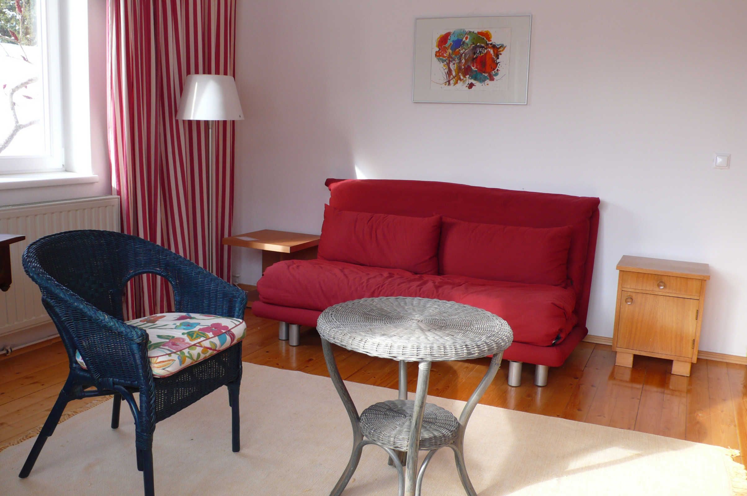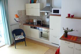 Wohnküche, Wohnraum, Schlafzimmer mit separater Toilette im Erdgeschoss mit Terrasse und direktem Zugang zum Garten. Im Wohnraum steht eine ausziehbare Schlafliege für weitere1 - 2 Personen zur Verfügung.