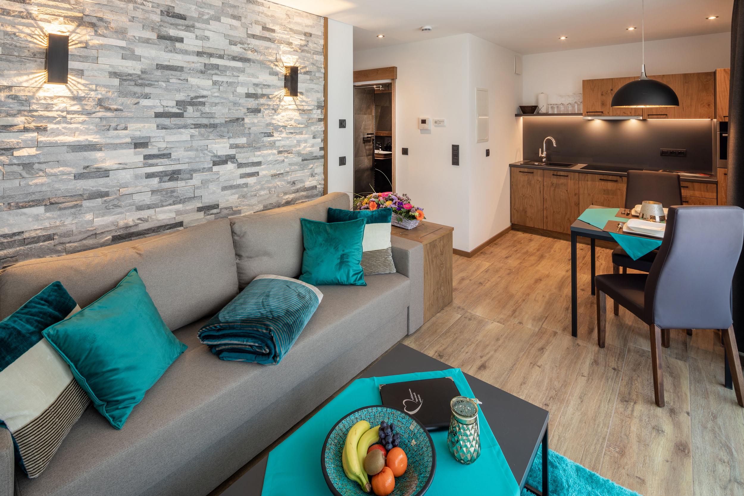2 Zimmer Appartement mit einem Wohnbereich und komplett ausgestatteter Küchenzeile, einem Doppelzimmer mit Boxspringbetten und SAT / TV, Wlan, externe Lüftungsanlage, Regendusche/WC, Föhn, Zimmersafe, Terrasse/Balkon und ohne, incl. Königscard.
