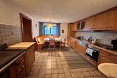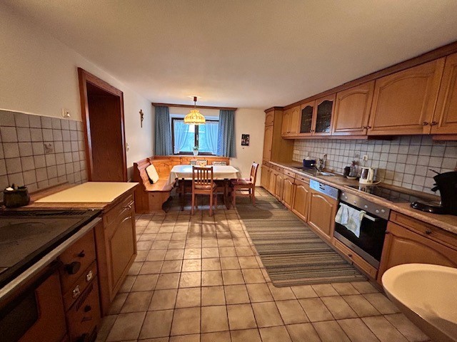 Küche mit Eckbank, ausgestattet mit Kühlschrank, Kochplatten, Backrohr, Geschirrspüler, Kaffeemaschine, Holzofen.