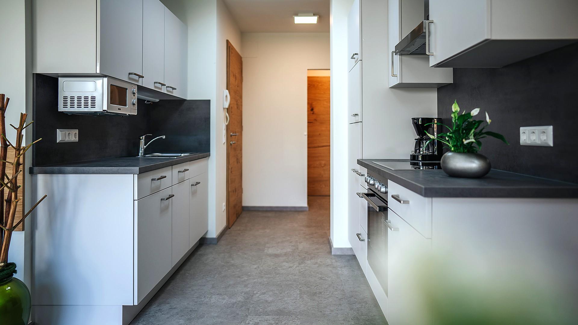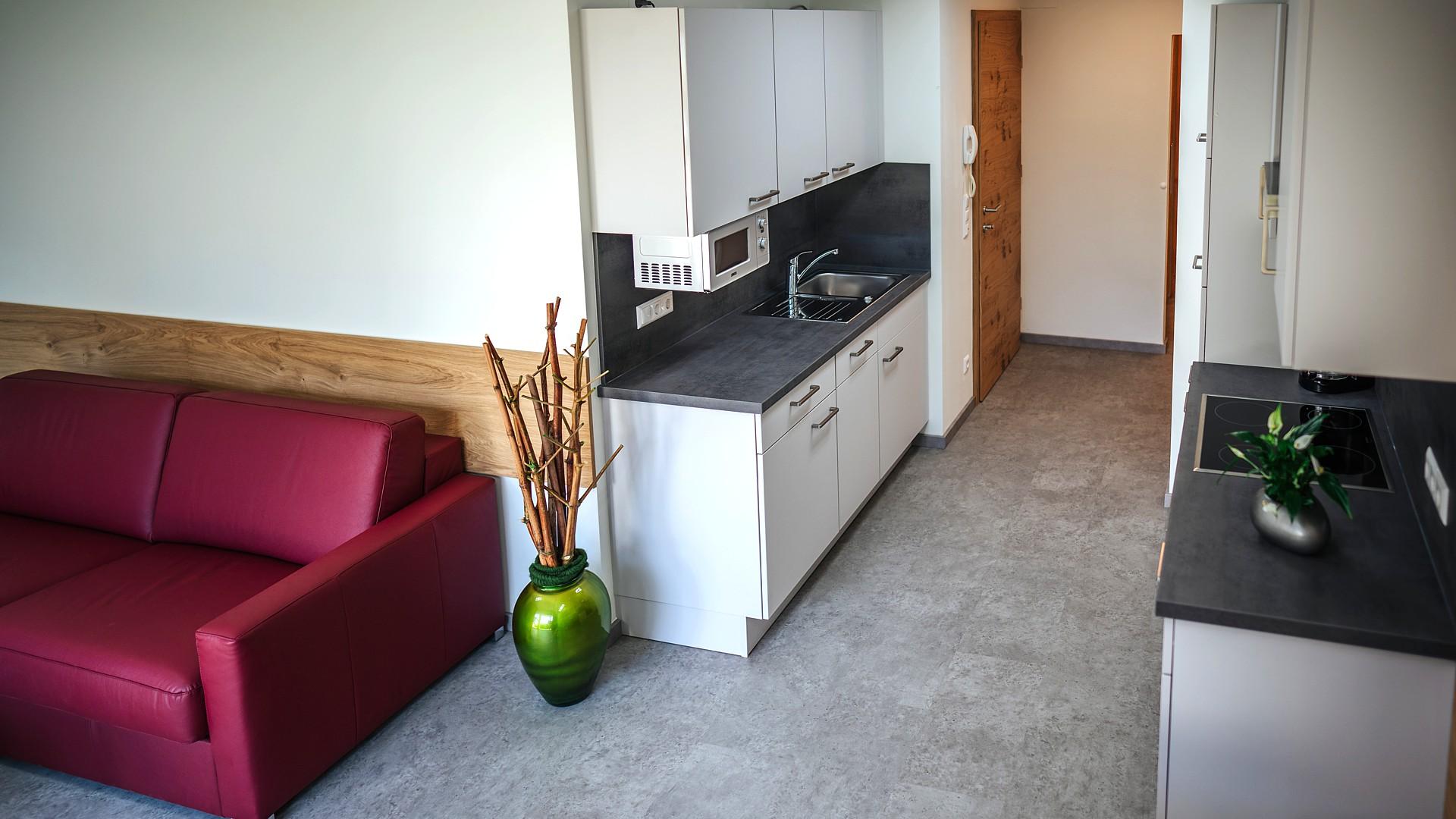 Diese komplett neue und moderne Wohnung (NEU – ab 2022) besteht aus einem Vorraum, Garderobe, Küche, Ess/Wohn- und Schlafraum, 2 separaten Schlafzimmern, Badezimmer (mit rollstuhlgerechter Dusche und WC), separatem WC und einer großen Südterrasse.