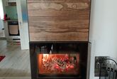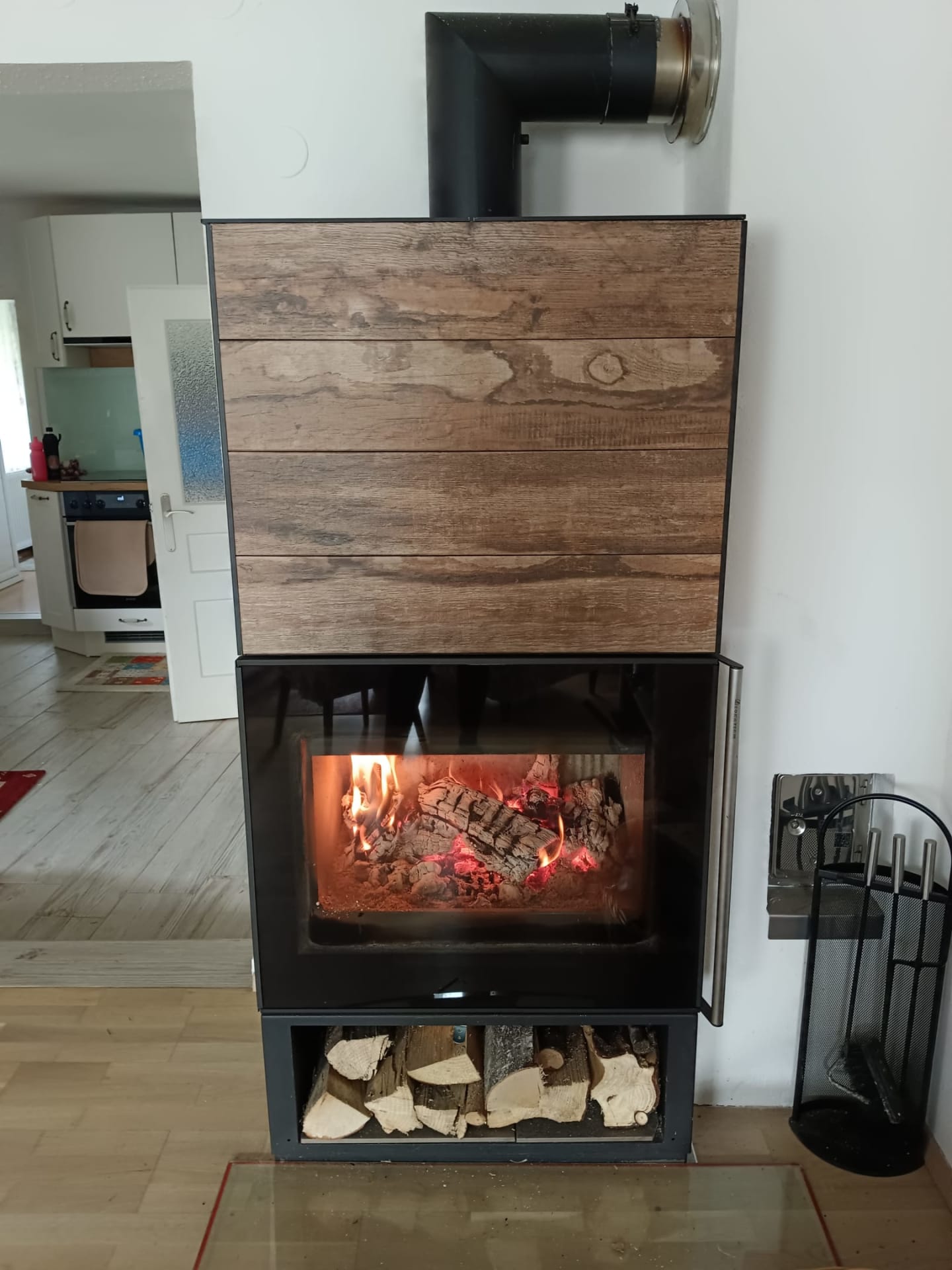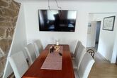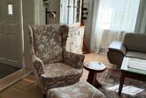 Lederbank - eventuell eine Möglichkeit zum Übernachten für eine 3. Person, Kaminofen, Esstisch mit Sessel, Ohrensessel, Fernseher