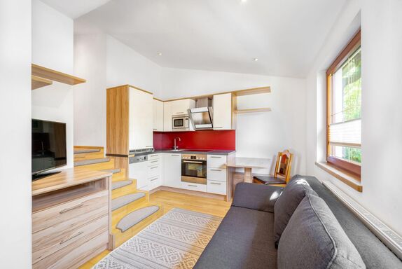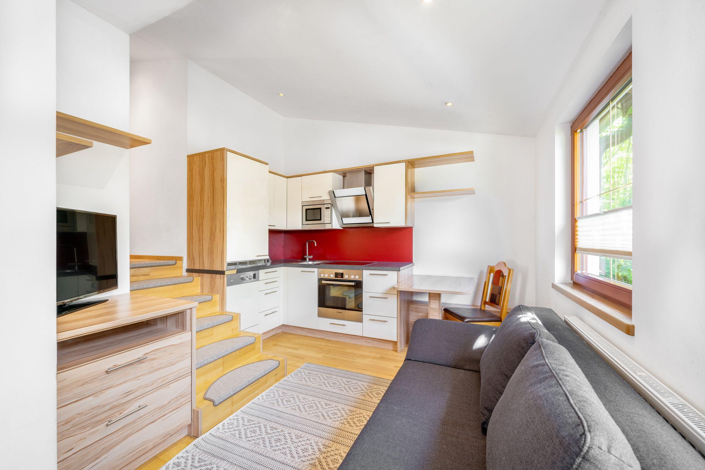 2-3 Personen, kleiner Wohnraum mit Küche, Schlafcouch (200 cm x 200 cm), Bad mit Dusche und WC, Doppelzimmer, Erdgeschoß mit eigenem Eingang, Südterrasse mit Mittagssonne