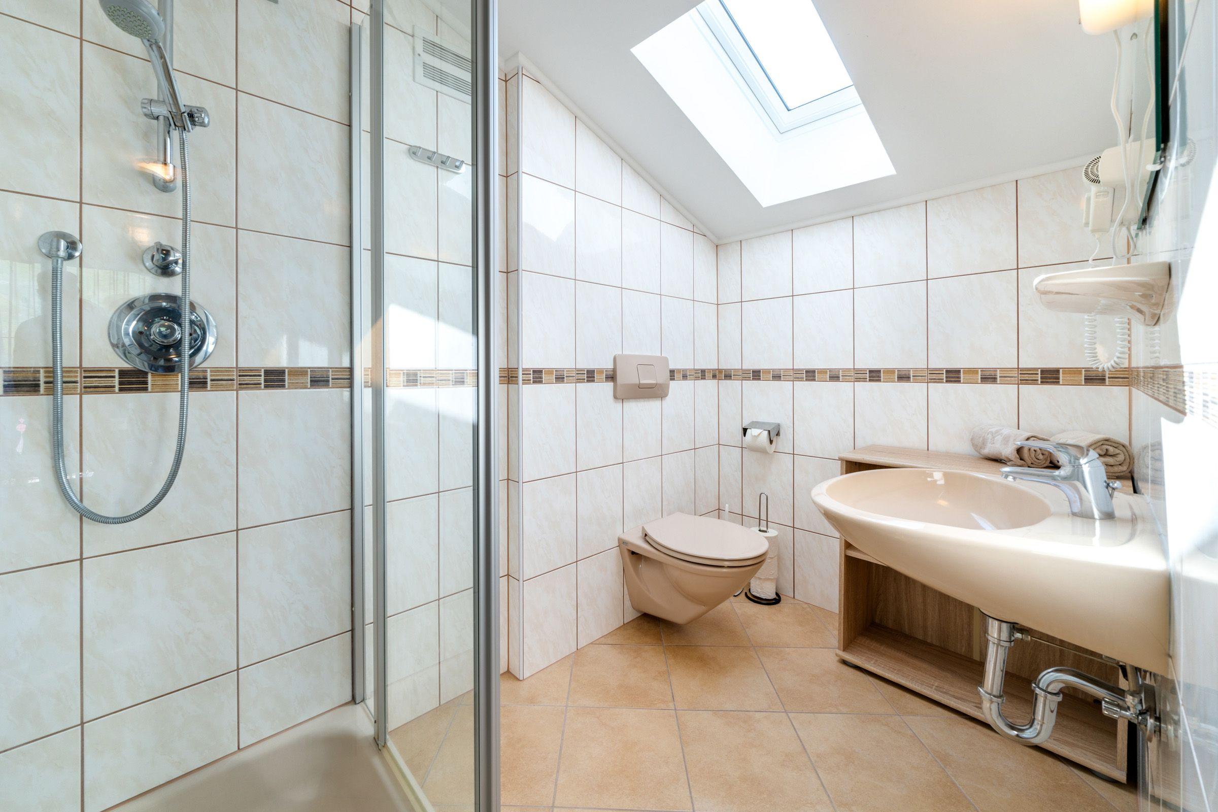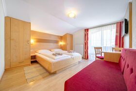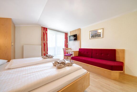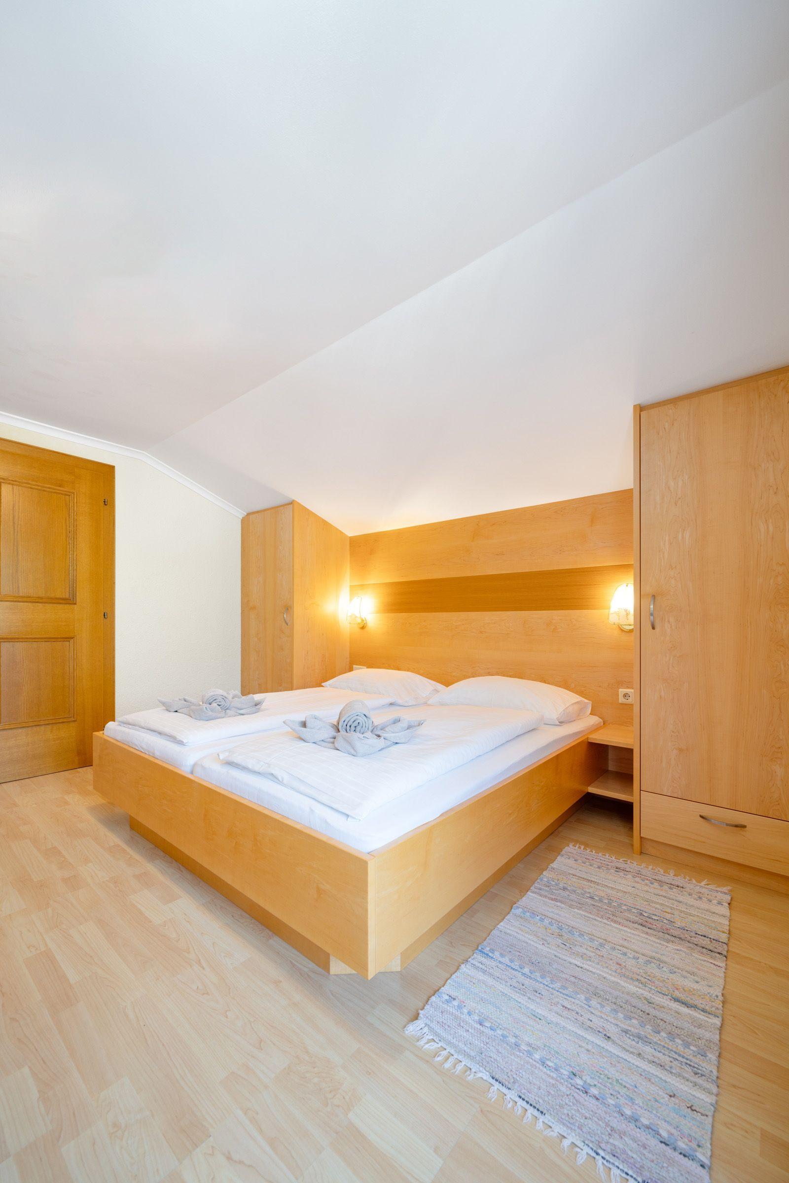 für 2-3 Personen, Sofa für 3. Person – Bett 180 cm lang, 90 cm breit, Sitzgelegenheit, Doppelbett, Bad mit Dusche und WC, 2. Stock, Südwestbalkon zur Sonnenseite mit traumhaften Garten- und Bergblick