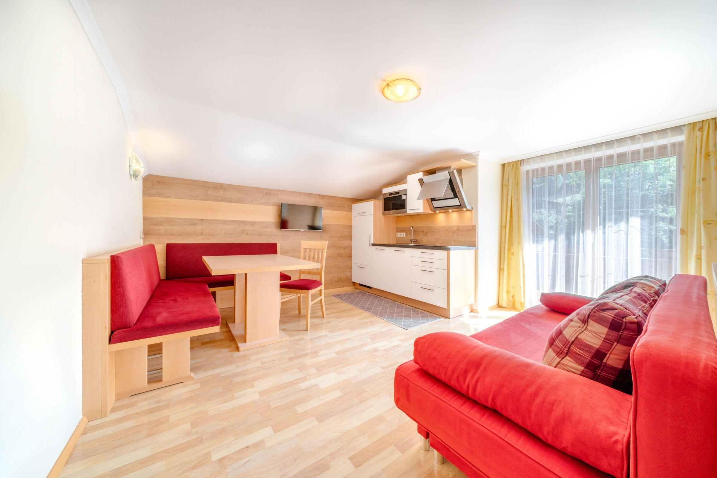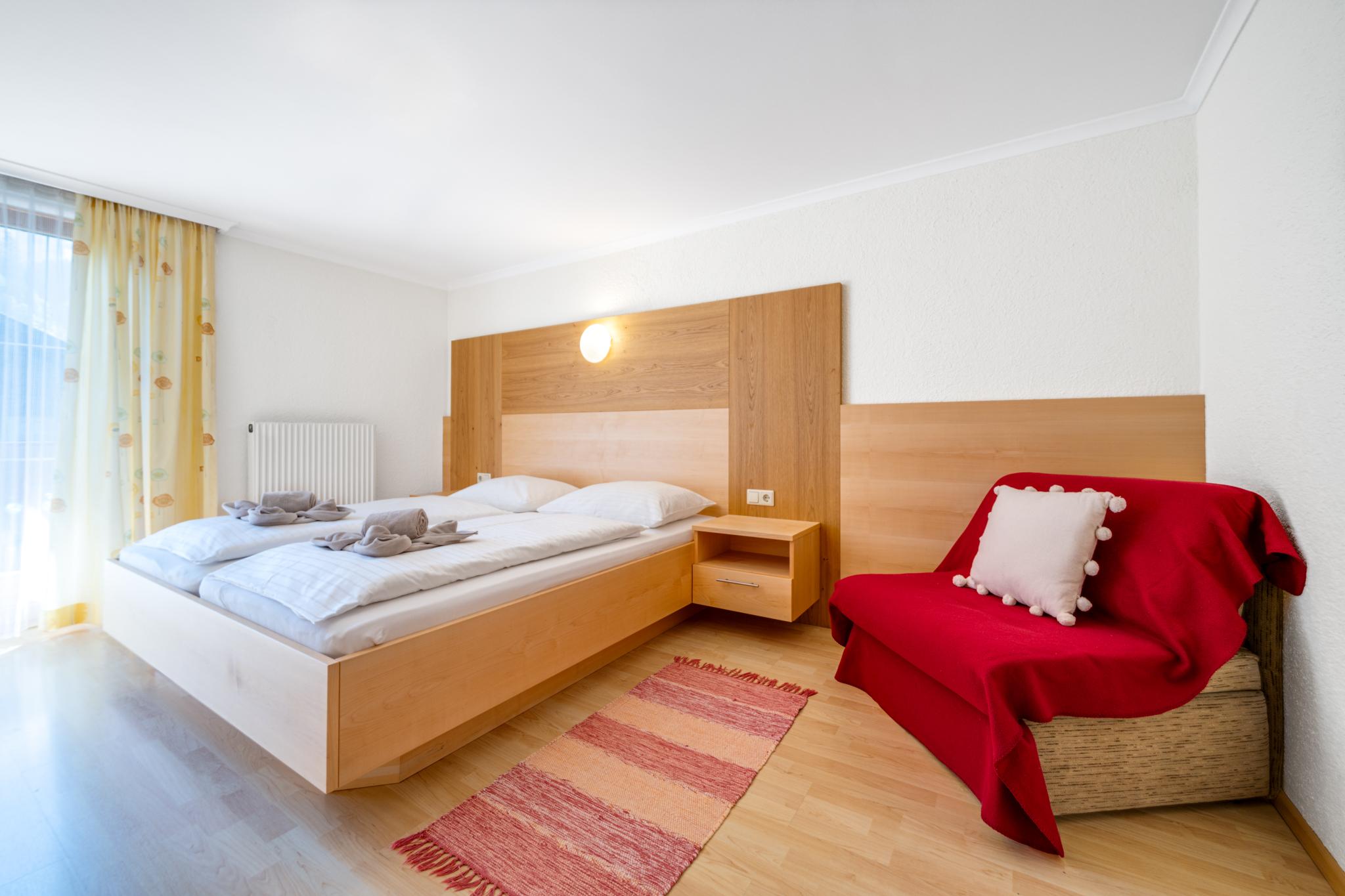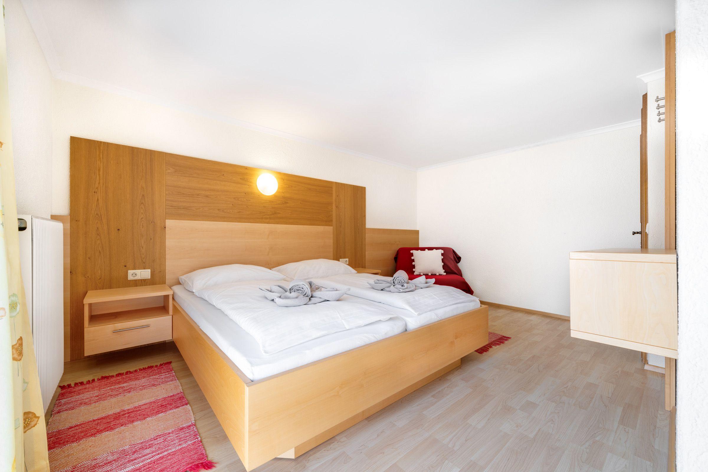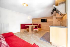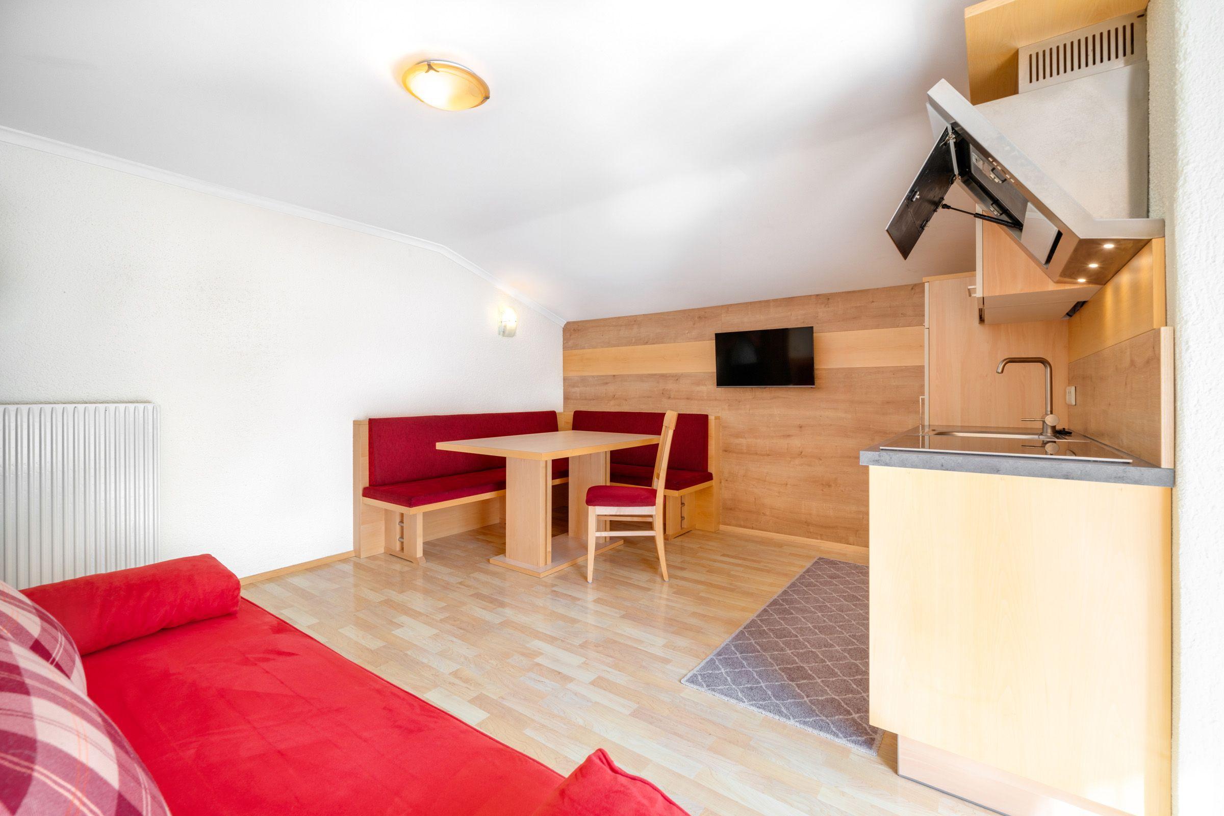 2-4 Personen, Wohnraum mit Küche, Sitzecke, Schlafcouch (200cm x 200cm), Bad mit Dusche und WC, Doppelzimmer mit kleinem ausziehbaren Couchsessel, 2. Stock, Ostbalkon mit Morgensonne