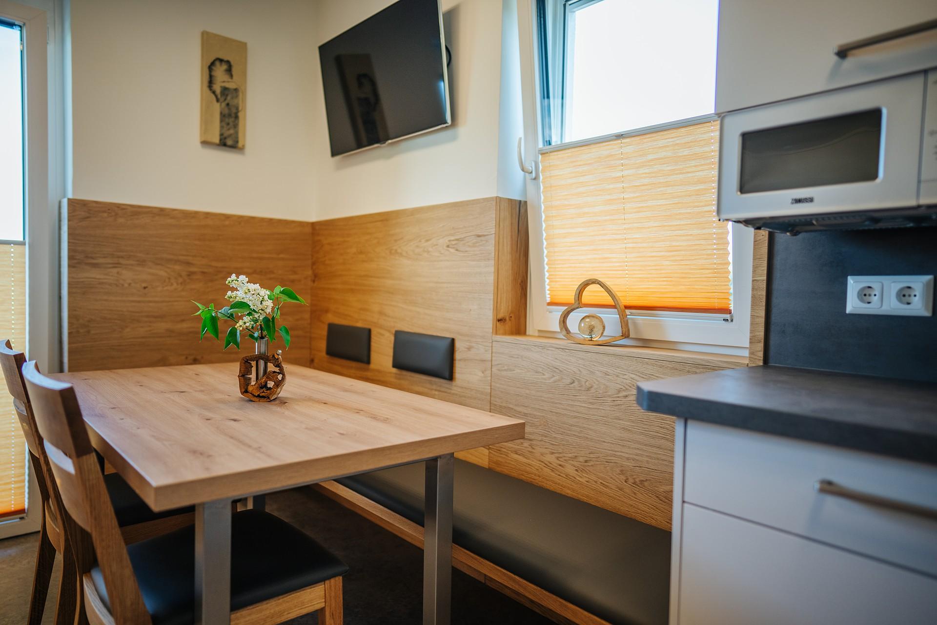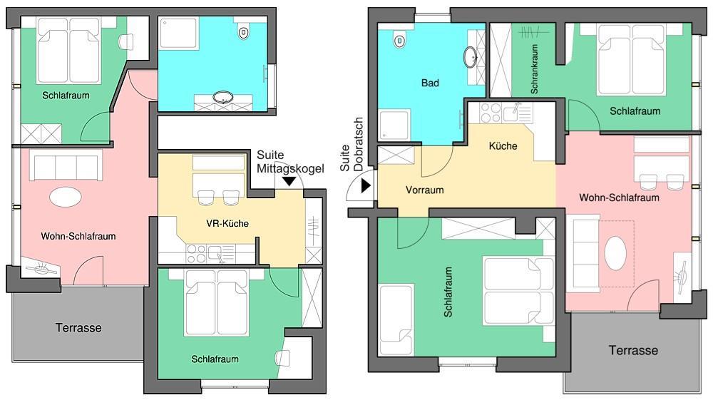 Diese komplett NEUEN und MODERNEN sowie rollstuhlgerechten/ barrierefreien Suiten bestehen aus je einem Vorraum mit Küche, Wohn/Schlafraum, zwei separaten Schlafzimmern, Badezimmer mit Dusche/WC und je einer herrlichen Dachterrasse Richtung Süden bzw. Südosten oder Südwesten.