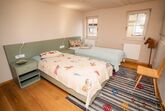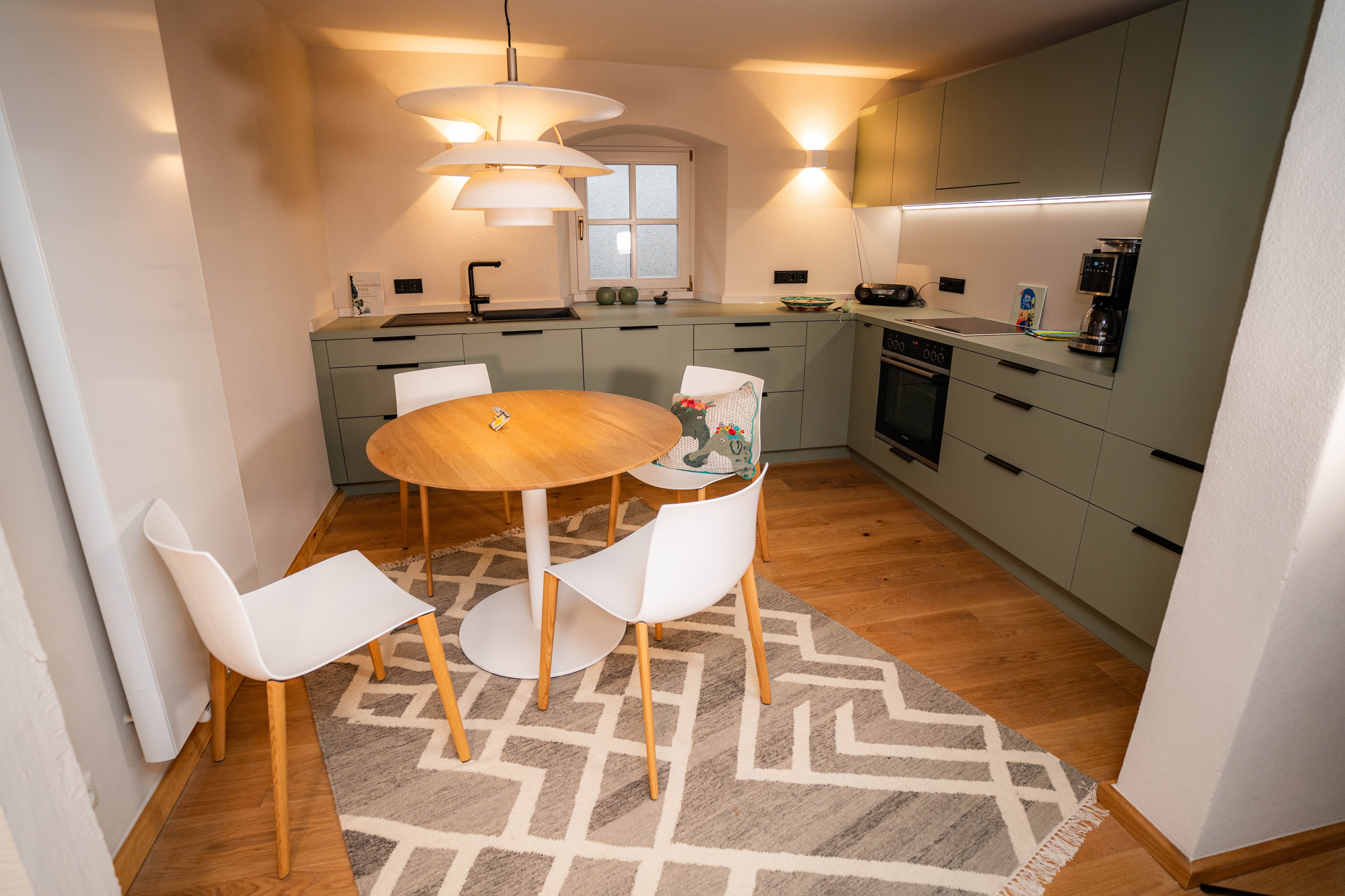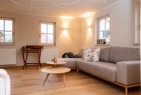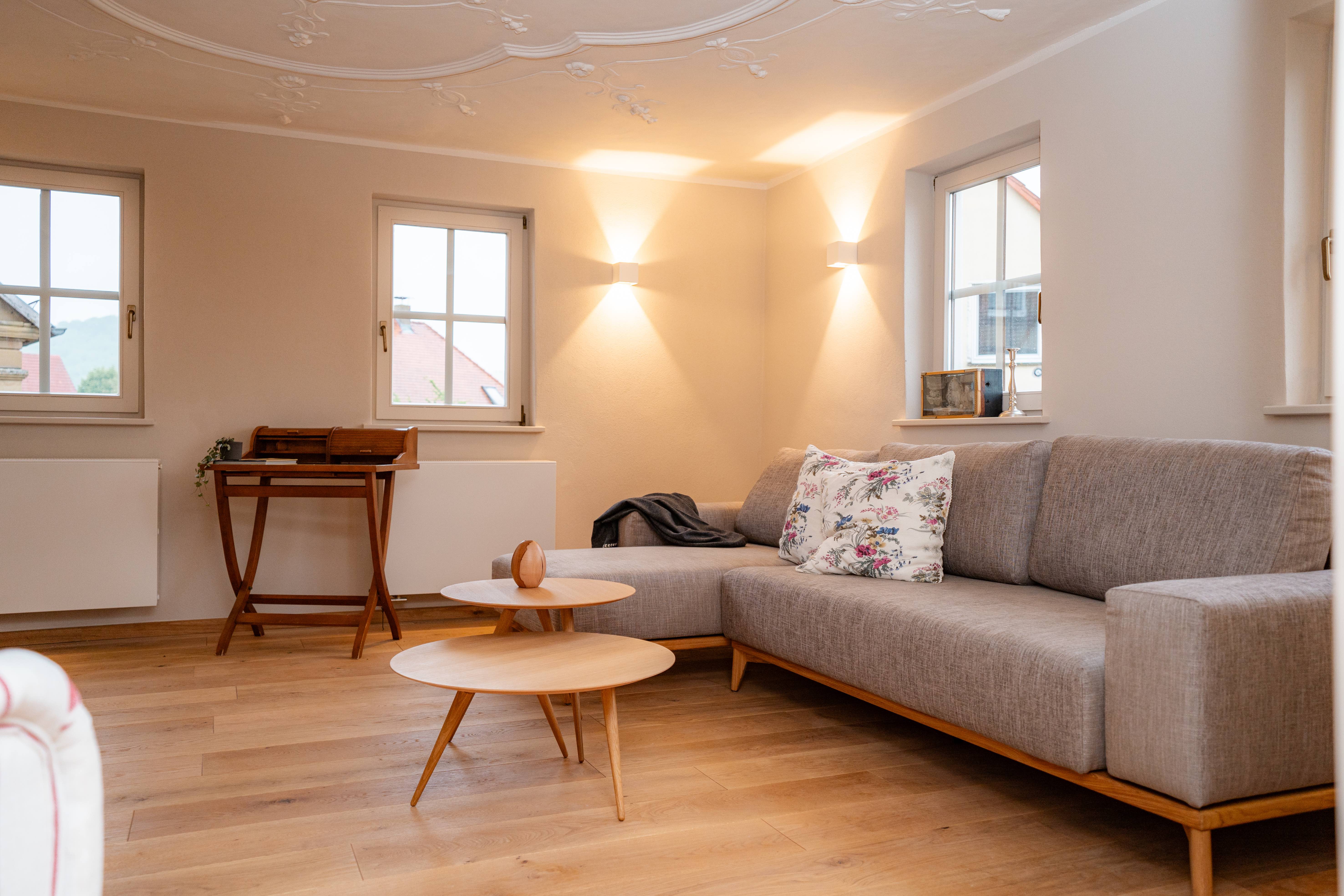 Diese wunderschöne Wohnung kann mit bis zu 6 Personen genutzt werden. Sie ist im Obergeschoss eines denkmalgeschützten Hauses mit zum Teil wunderbaren Stuckdecken. Es gibt 2 Schlafzimmer ein Wohnzimmer eine offene Küche mit Essplatz sowie ein Badezimmer und eine Toilette. Die Wohnung ist Exklusiv eingerichtet und es fehlt nichts zum Wohlfühlen. Am Abend könne Sie in einem Saunagarten mit holzbefeuerter Sauna entspannen. Unser Backhaus mit Kamin und Pizzaofen kann für einen gemütlichen Spieleabend genutzt werden.