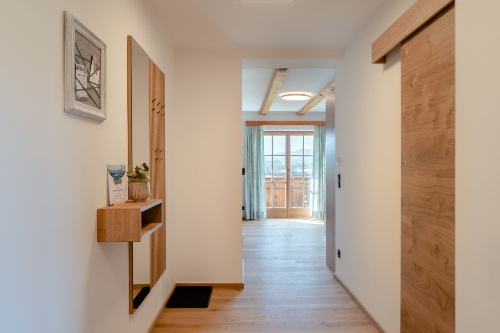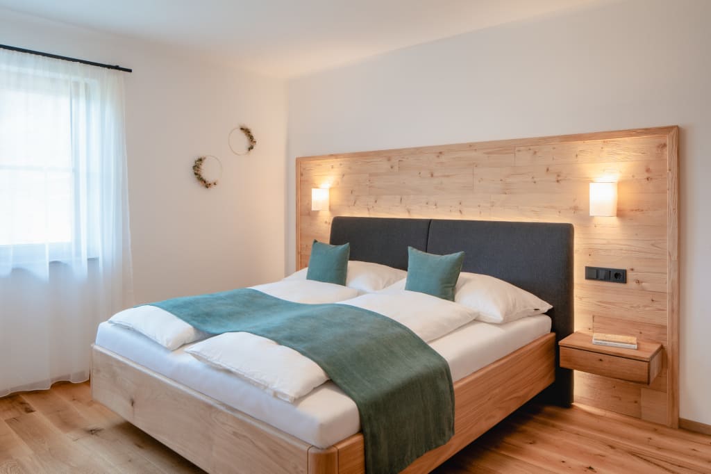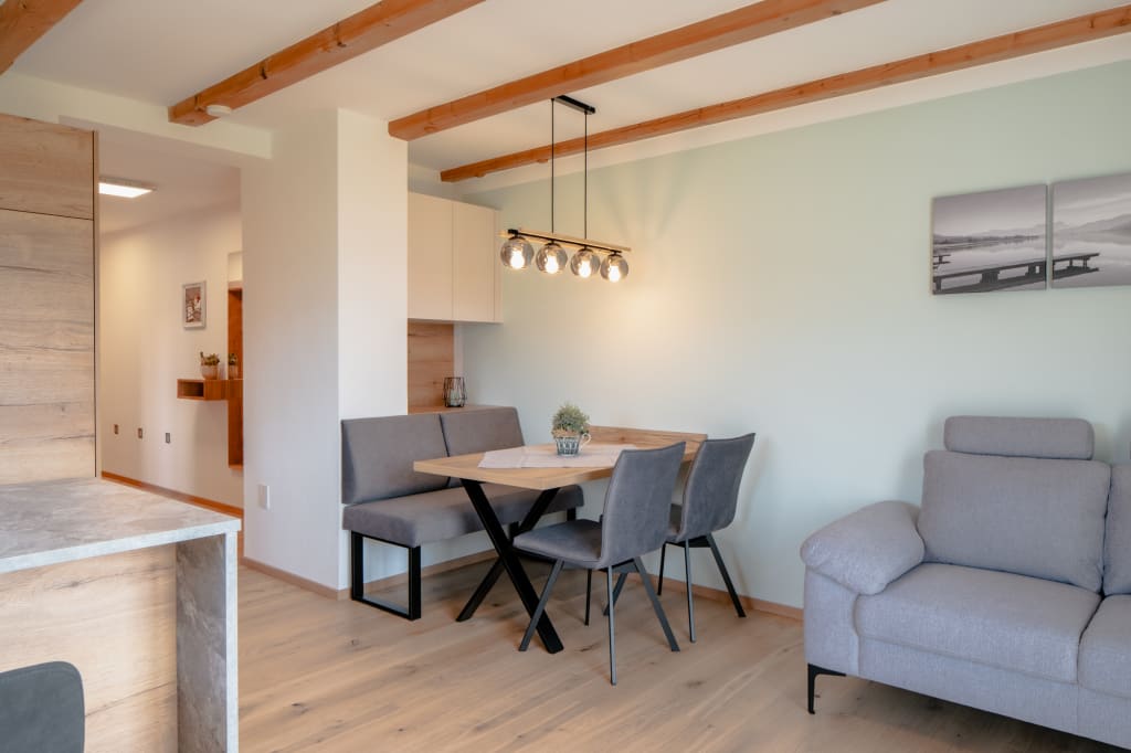 Die Einrichtung in der Ferienwohnung Abendsonne ist geprägt von natürlichen Materialien - Eiche und Fichte sind tonangebend und hochwertige Stoffe in ruhigen Farben runden das Erscheinungsbild harmonisch ab.