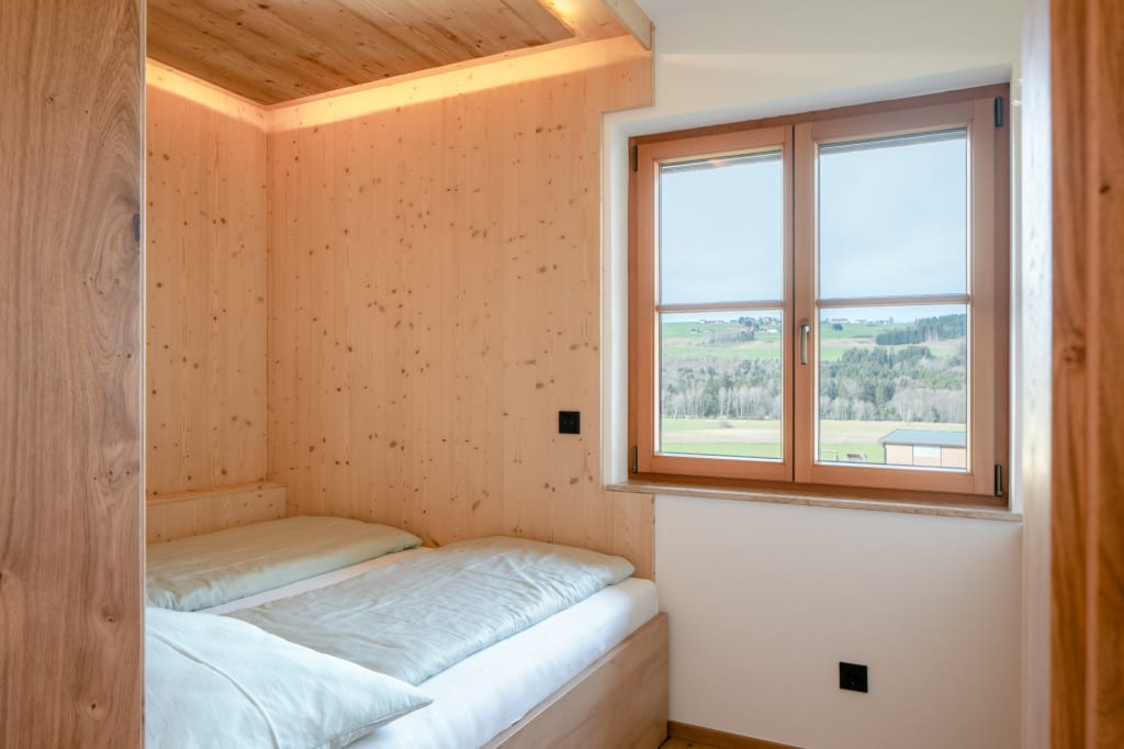 Das zweite Schlafzimmer, ideal als Kinderzimmer genutzt, ist kompakt und clever eingerichtet. Es verfügt über ein Ausziehbett, das in eine edle Fichtenholz-Schlafnische integriert ist. So entsteht eine gemütliche und funktionale Schlafgelegenheit in diesem Raum.