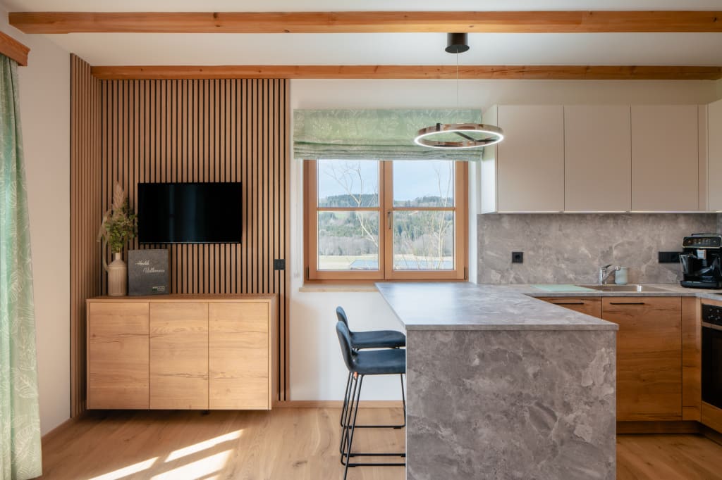 Die gut ausgestattete Küche lädt euch zum gemütlichen Pyjama-Frühstück ein. Zur Ausstattung der Küche zählen z.B.: ein großer Kühlschrank, Kaffeevollautomat, ein Wasserkocher sowie ein Kochfeld mit Backrohr.