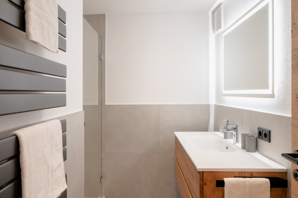 Das Badezimmer bietet ausreichend Platz für eure persönlichen Utensilien. Frische Handtücher und ein Haartrockner sind selbstverständlich vorhanden.