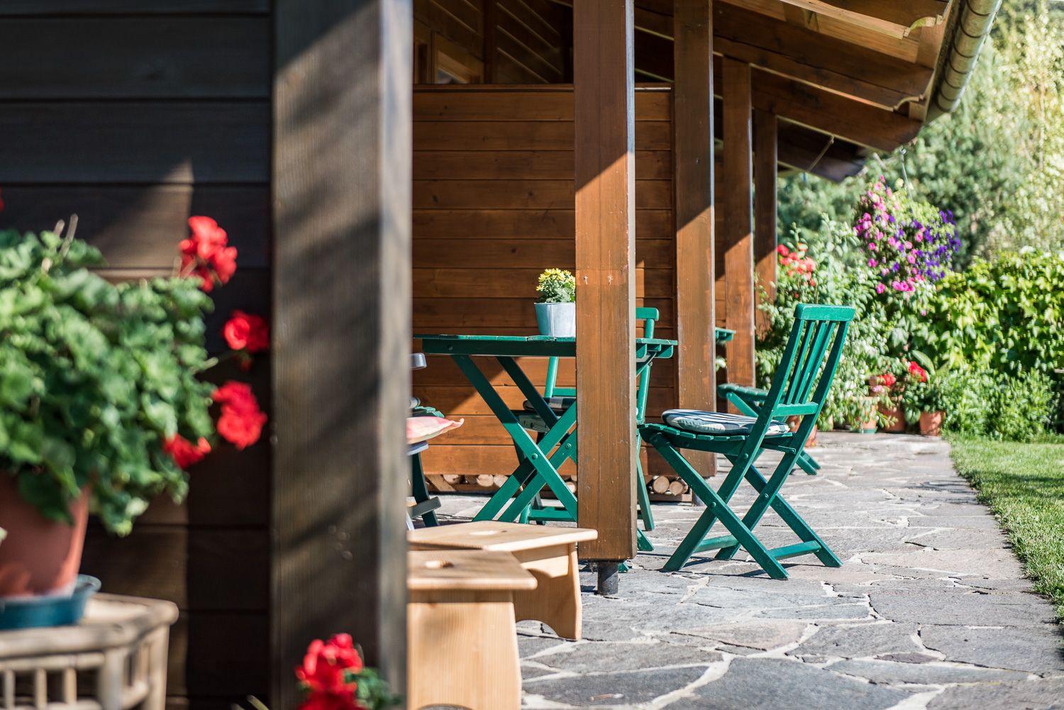 Tisch Sitzgelegenheiten schön geschützt vor Wind und Wetter mit herrlicher Aussicht in das Inntal