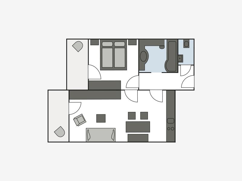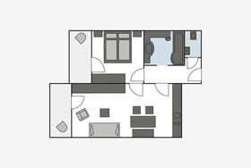 Balkon, 1 Schlafzimmer, 1 Wohnzimmer mit Sitzecke (2 – 3 Couchbetten möglich), Küchenzeile, Essecke, Bad mit Wanne/Dusche, sep. WC, TV, Telefon, Safe, WLAN, Ipad