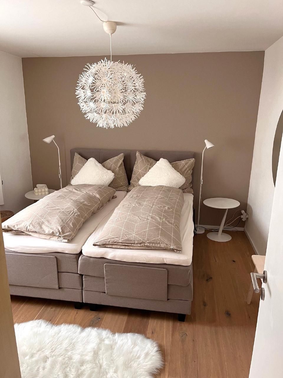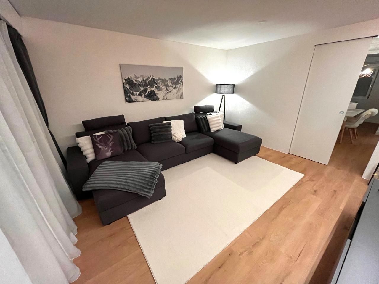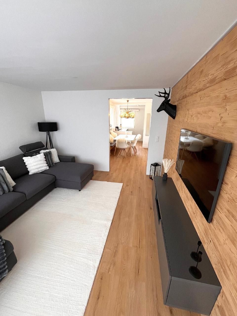 Helle freundliche Wohnung mit Entrée, offene Küche zum Esszimmer, getrenntes Wohnzimmer, ein Schlafzimmer mit Boxspringbett, grossem dreitürigen Kleiderschrank mit viel Stauraum.