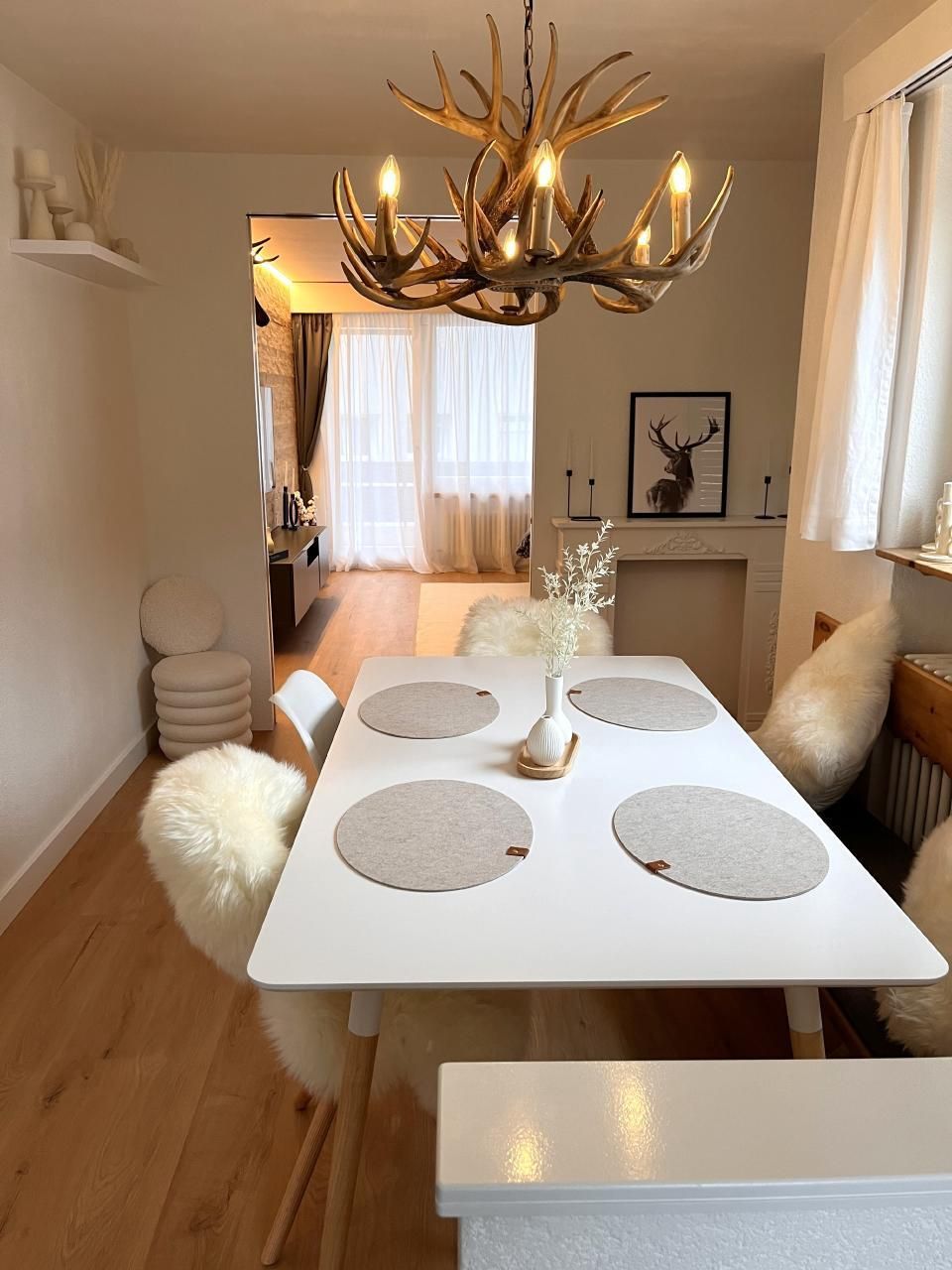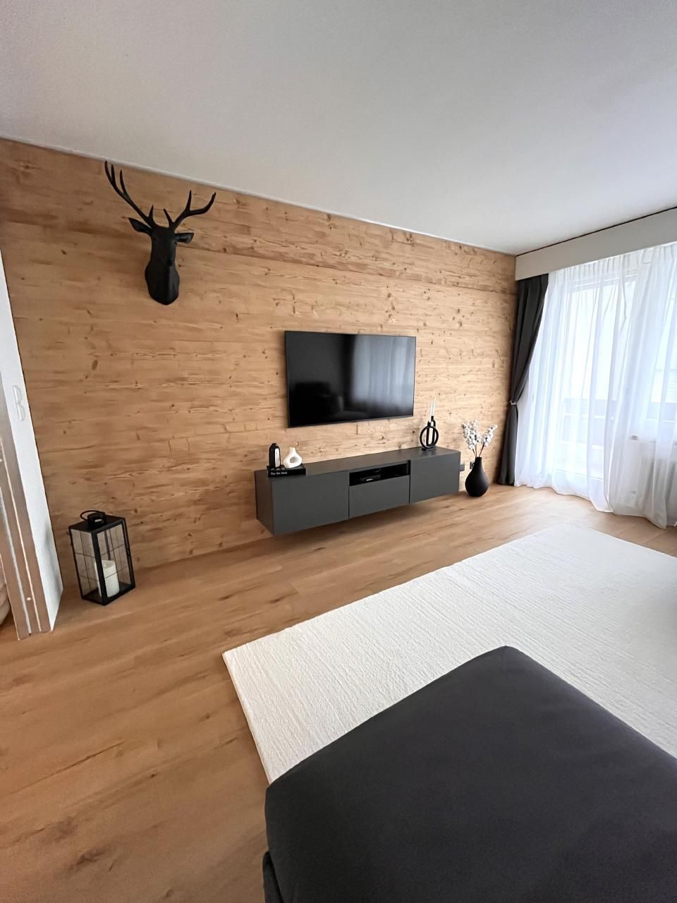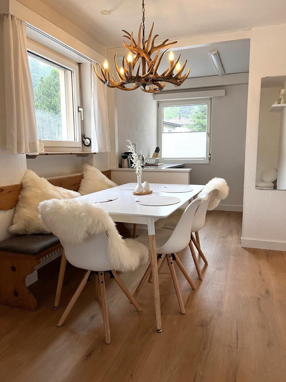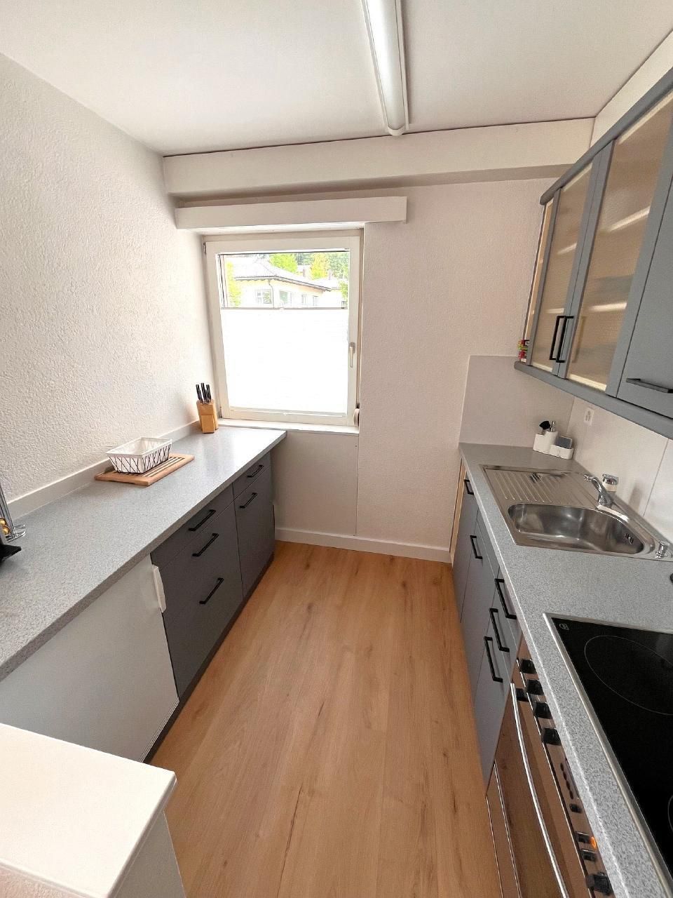 Helle freundliche Wohnung mit Entrée, offene Küche zum Esszimmer, getrenntes Wohnzimmer, ein Schlafzimmer mit Boxspringbett, grossem dreitürigen Kleiderschrank mit viel Stauraum.