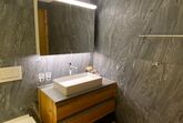 Zwei Badezimmer, eines mit Badewanne/Dusche und einmal nur mit Dusche, jeweils mit WC und Waschbecken. Wohnzimmer