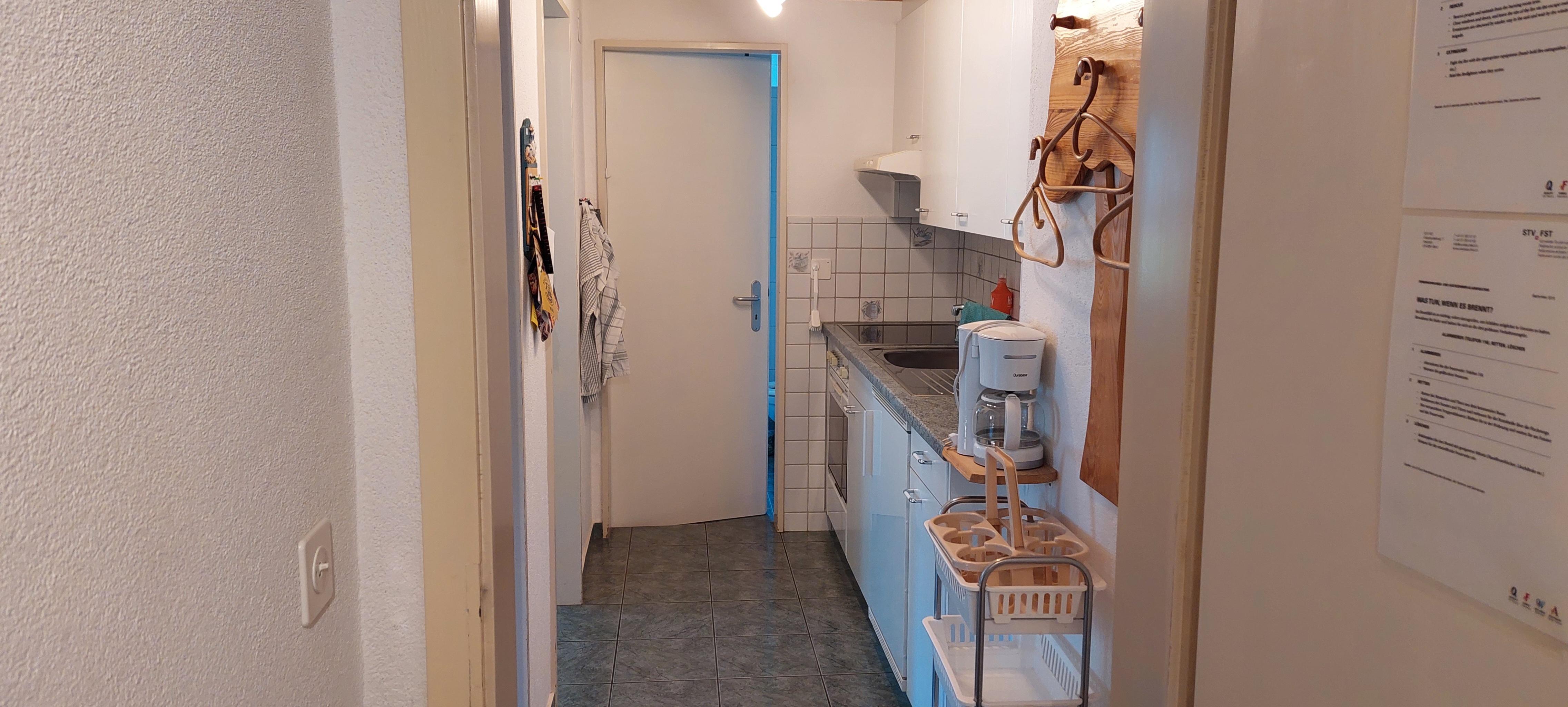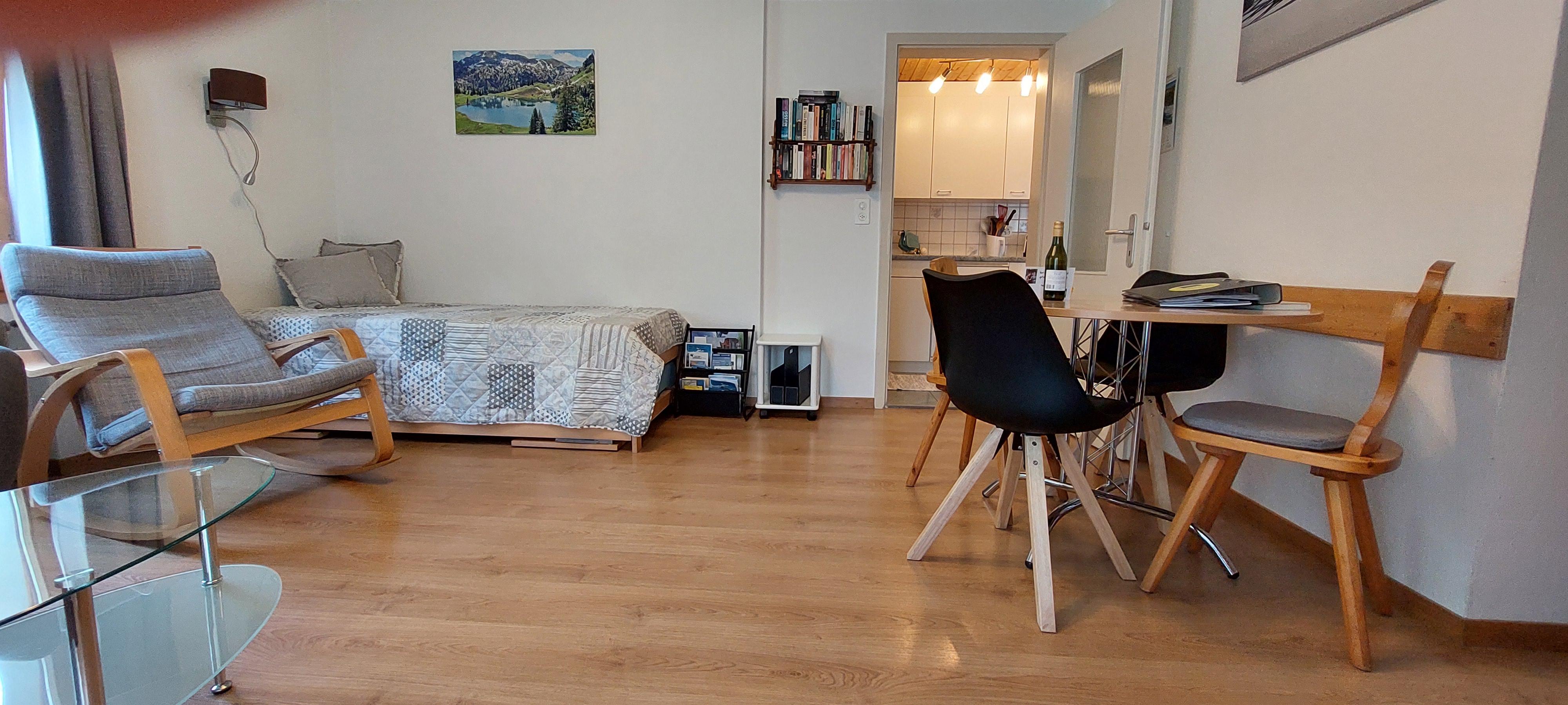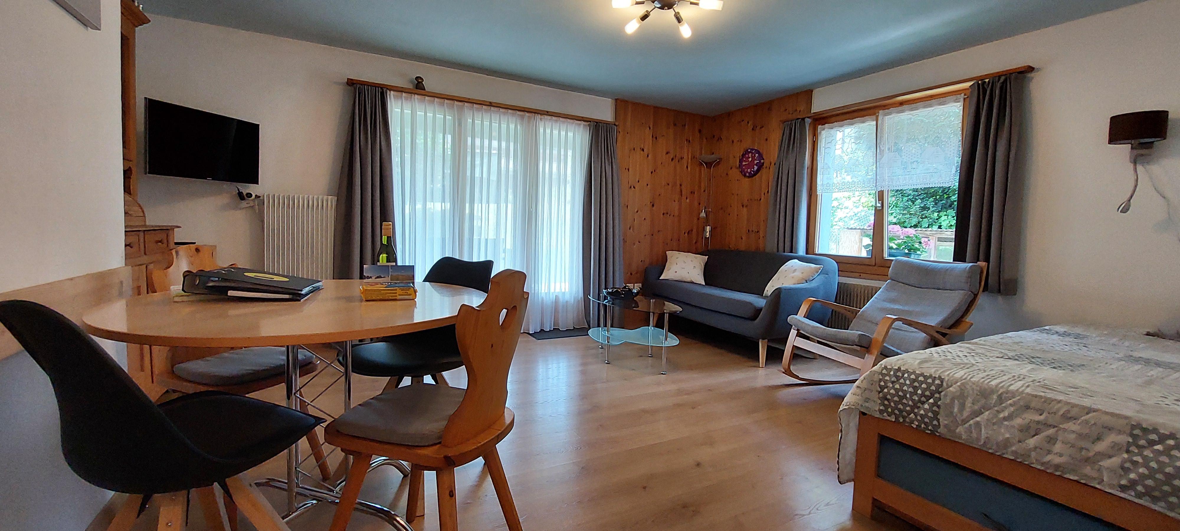 1 Schlafzimmer mit 1 Doppelbett (180x200cm). Wohn-/Esszimmer mit 1 Einzelbett und 1 Unterziehbett für 2 Personen, separate Küchenzeile mit Mikrowelle, Nespresso-Kaffeemaschine sowie Filterkaffeemaschine, Fondue- und Raclette-Set. Dusche/WC. WLAN. Kinderbett (60x120cm) inkl. Bettwäsche und Kinderhochstuhl vorhanden.