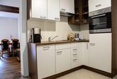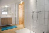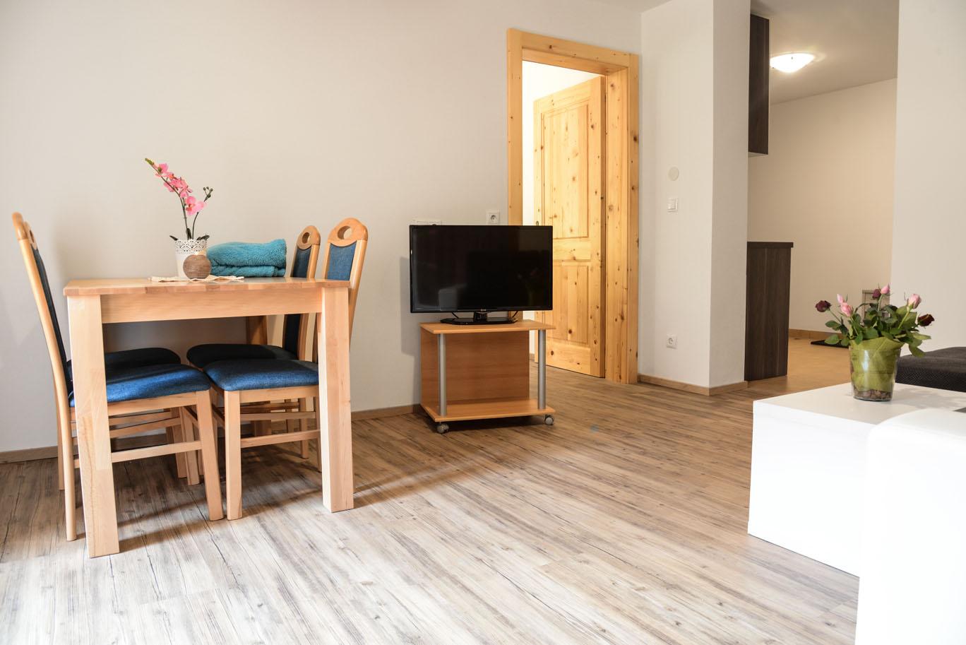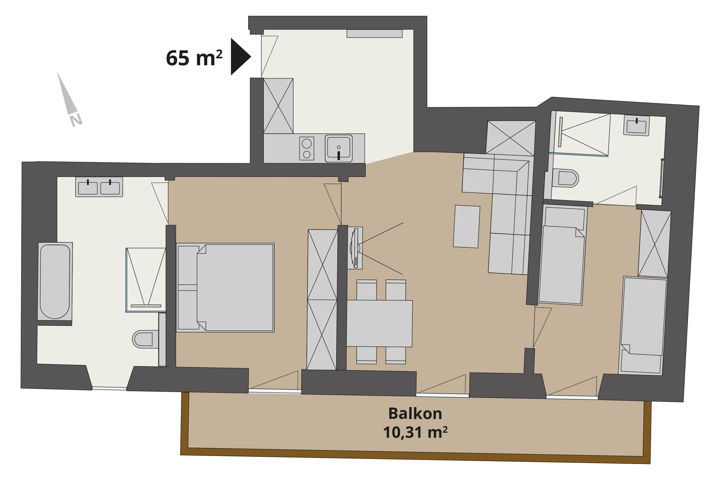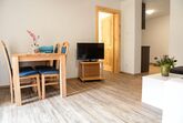Das Appartement mit eigenem Balkon bietet auf 65m² Platz für 2-5 Personen. Es besteht aus einer geräumigen Küche, einem gemütlichen Wohnbereich mit Eck-Sofa und Essplatz, zwei Schlafzimmern mit jeweils eigenem Bad mit WC.