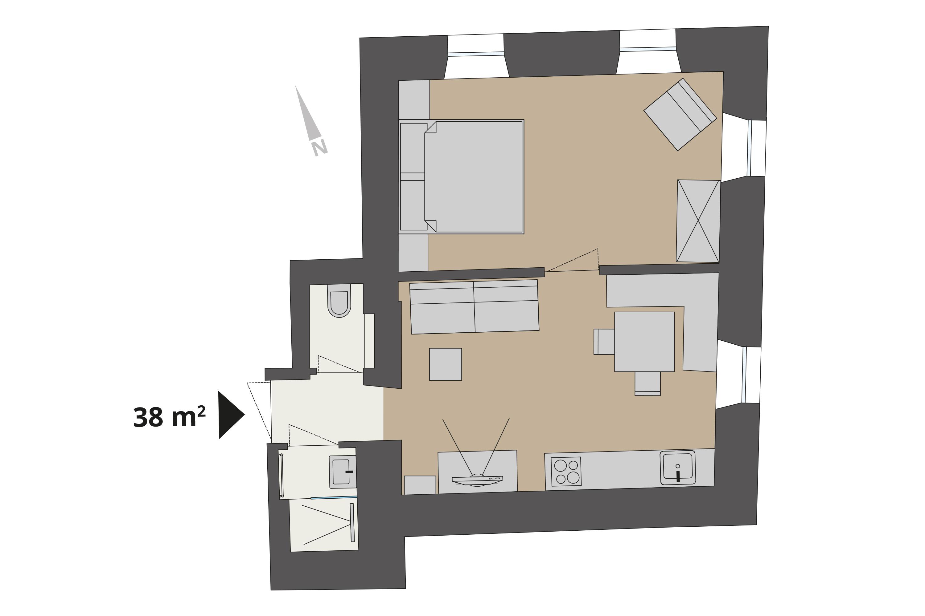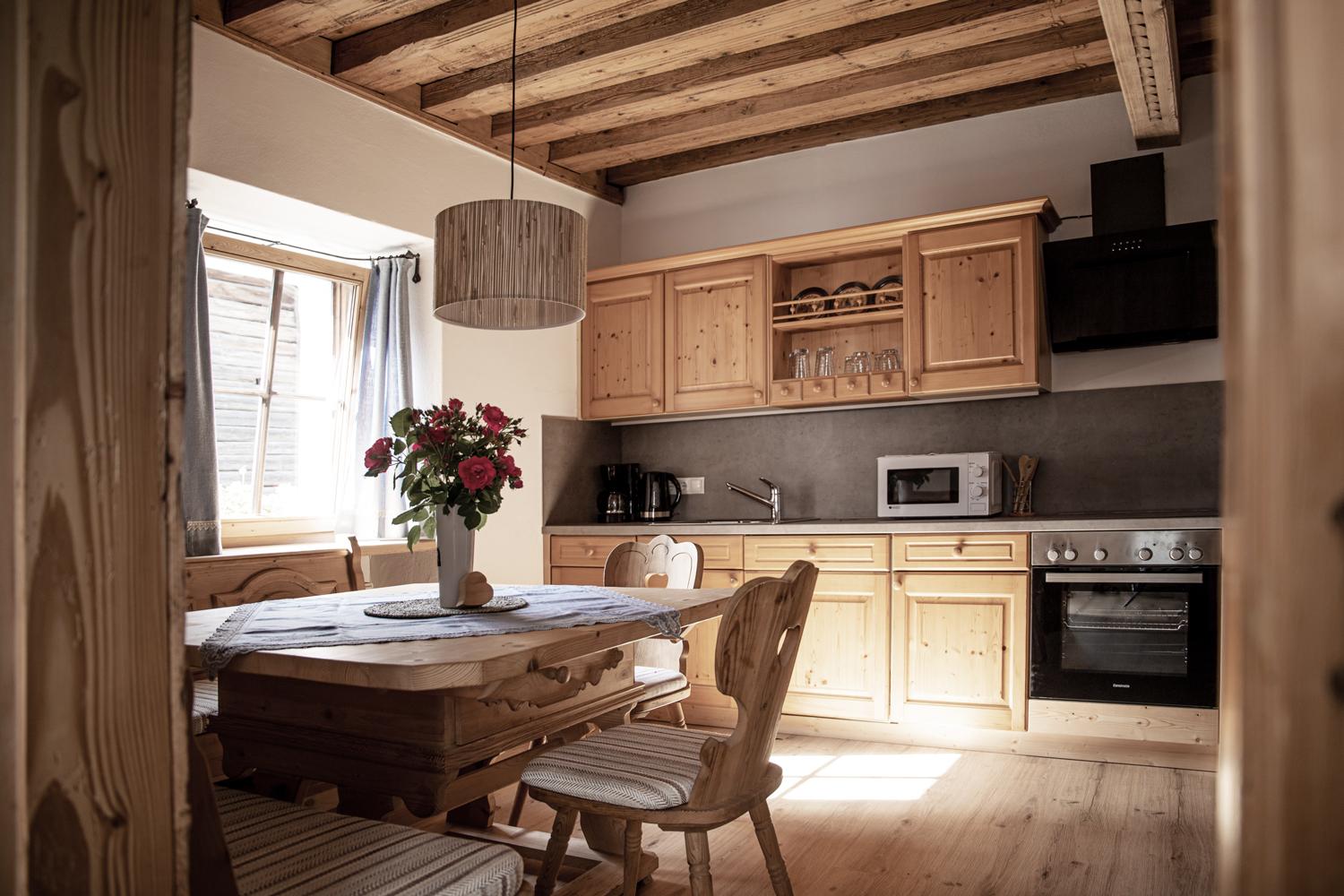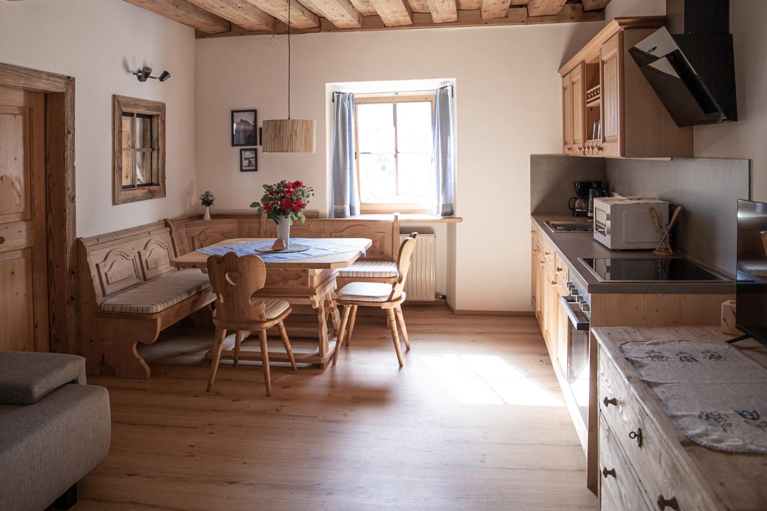Das urige Appartement mit jahrhunderte alter Holzbalken-Decke bietet auf 38m² Platz für 2-5 Personen. Es besteht aus einer familiären Wohnküche mit liebevollen Details, einer gemütlichen Eckbank für bis zu 5 Personen, einem Sofa, TV, einem großzügigen Schlafzimmer mit Platz für ein Gitterbett und einem ausziehbaren Schlafsessel, einem Bad mit Dusche und separatem WC.