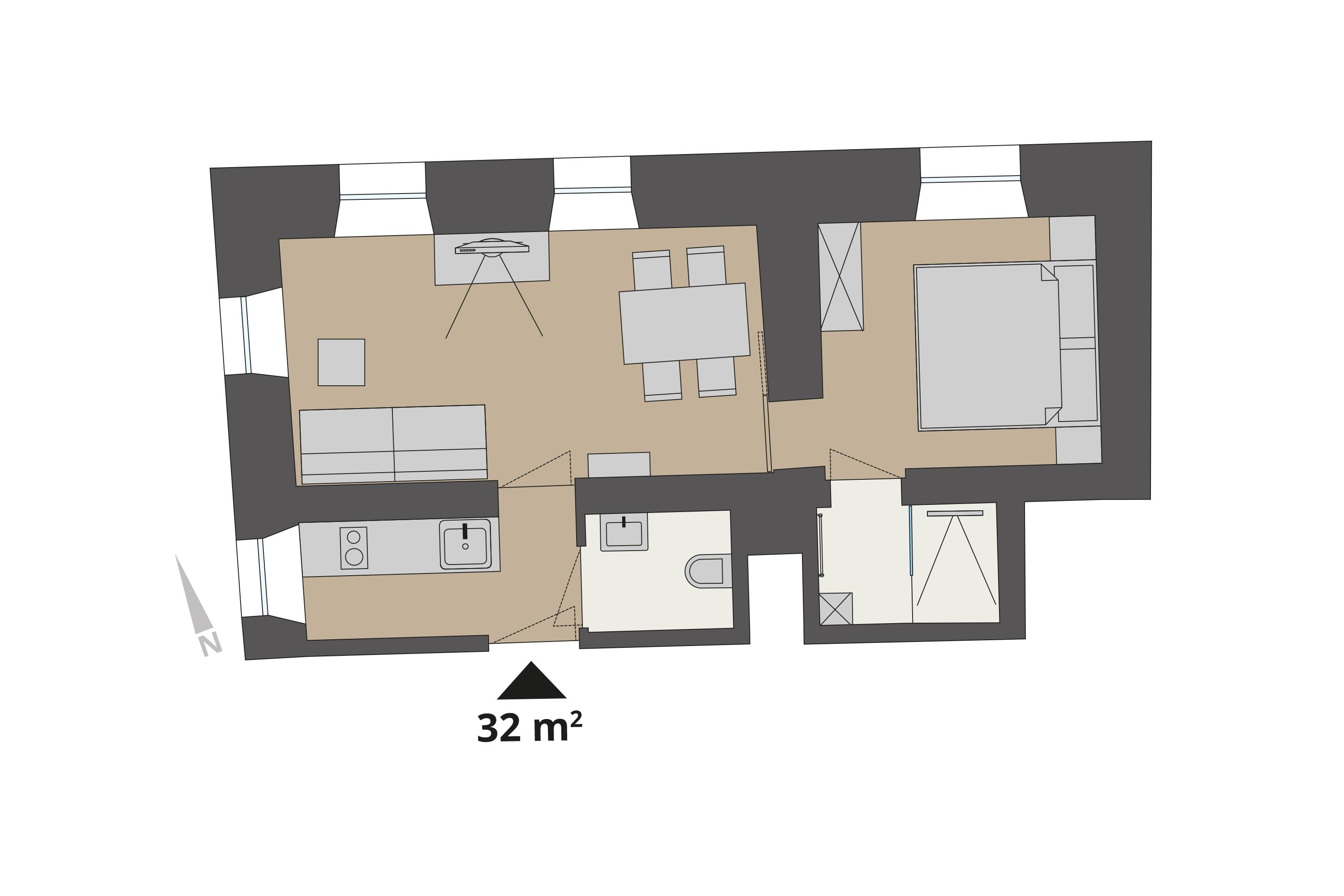 Das gemütliche Appartement bietet auf 32m² Platz für 2-4 Personen. Es besteht aus einem hellen, freundlichen Wohnraum mit Sofa, TV und Essplatz, einer separaten, voll eingerichteten Küche, einem behaglichen Schlafzimmer mit großem Bett, einem Bad mit Dusche und einem geräumigen WC mit Waschbecken.