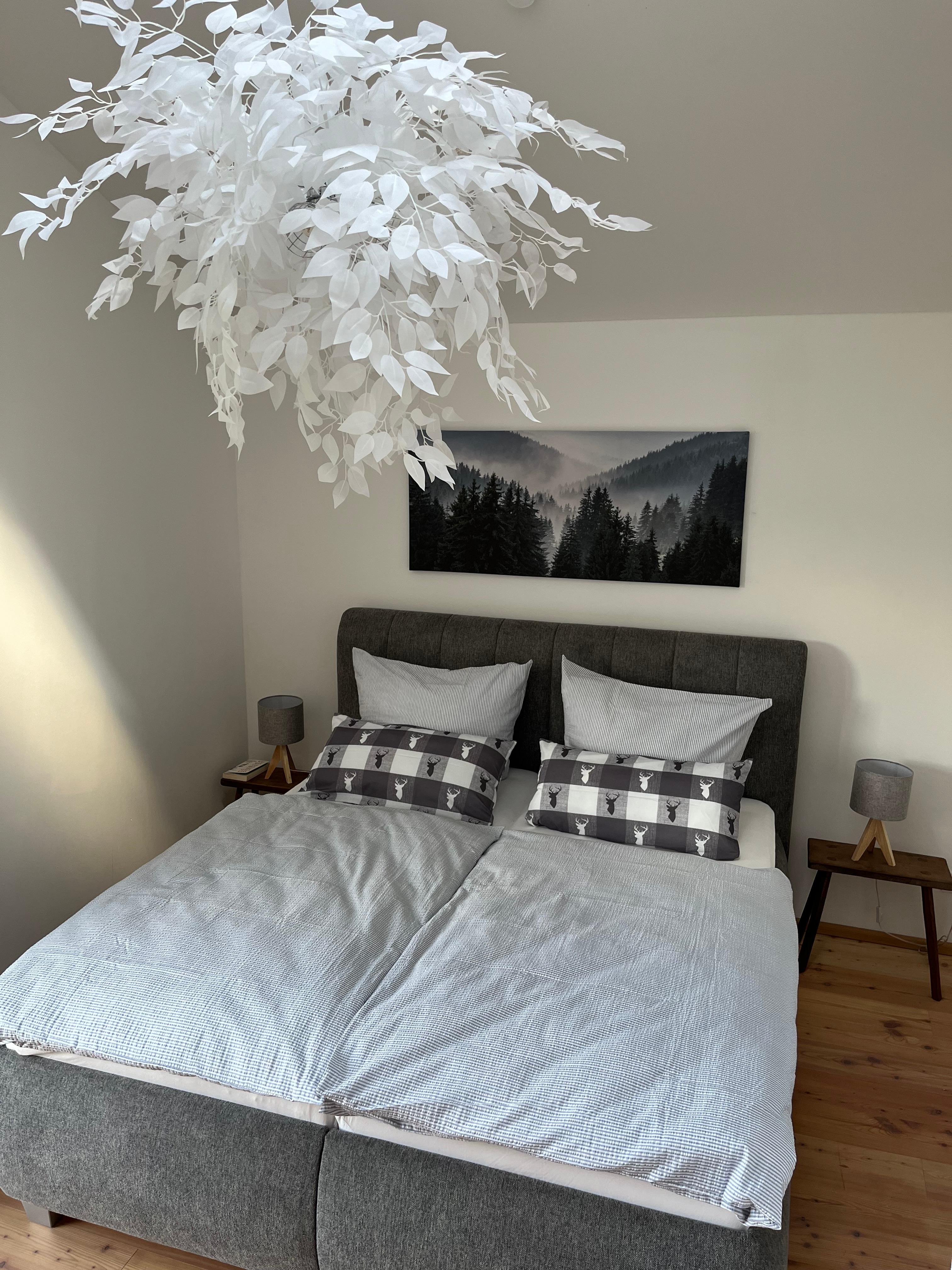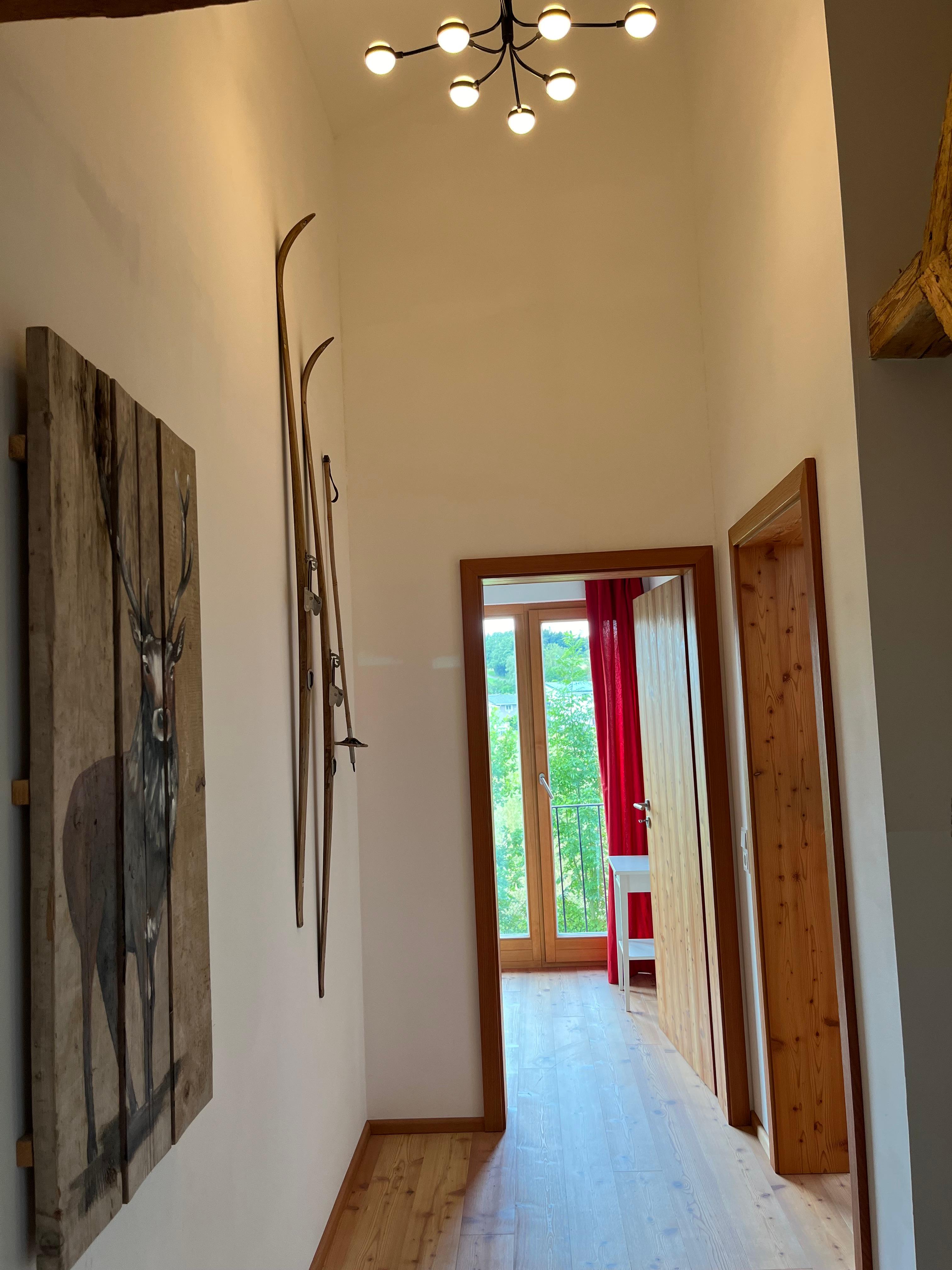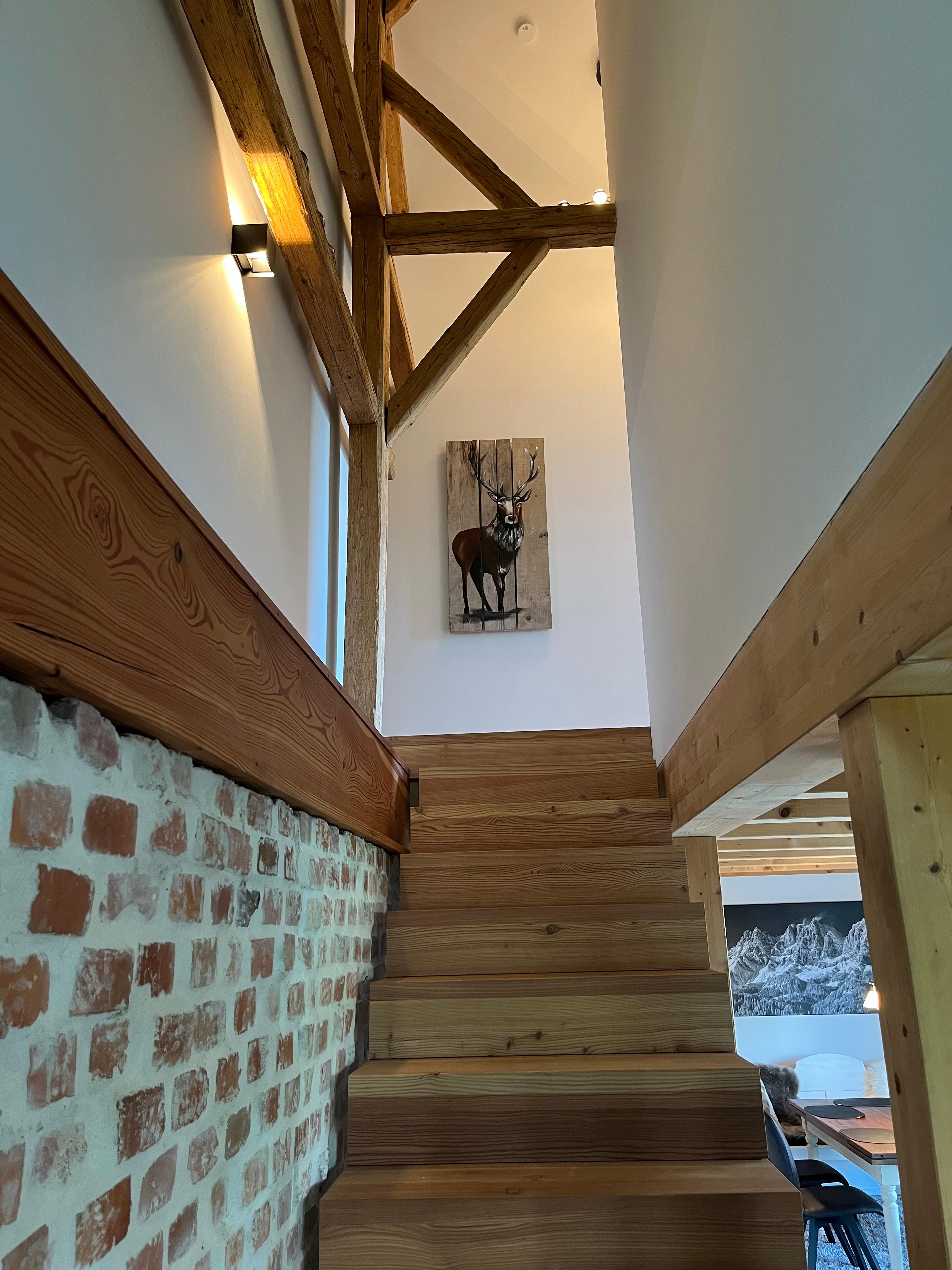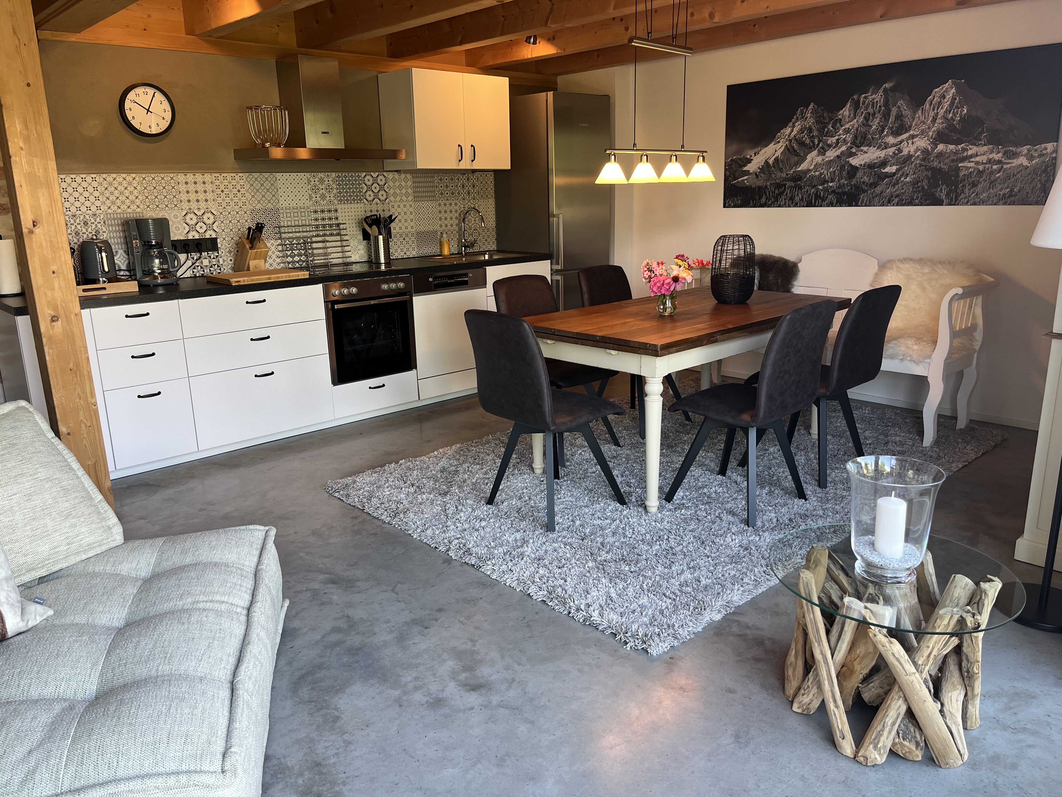 Die Suite verbindet modernen Komfort mit rustikalem Charme und ist mit allem ausgestattet, was Sie für einen erholsamen Aufenthalt benötigen. Von einem geräumigen Wohnbereich mit Kaminofen über eine voll ausgestattete Küche bis hin zu einem komfortablen Schlafzimmer sowie zwei weiteren gemütlich-eleganten Zimmern, von denen eines über eine Galerie zum Schlafen, Lesen und in die Wolkenschauen verfügt. Die Verwendung von nachhaltigen und ökologischen Baumaterialien wie Holz, Naturstein, Lehmputz und warme Ziegeln sorgen für ein angenehmes und gesundes Raumklima. Das in Weiß, Grau und Schwarz gehaltene Badezimmer mit großformatigen Natursteinfliesen am Boden verfügt über eine vollautomatische Waschmaschine und einen Wäschetrockner - alles ist darauf ausgelegt, Ihren Aufenthalt angenehm und entspannt zu machen.