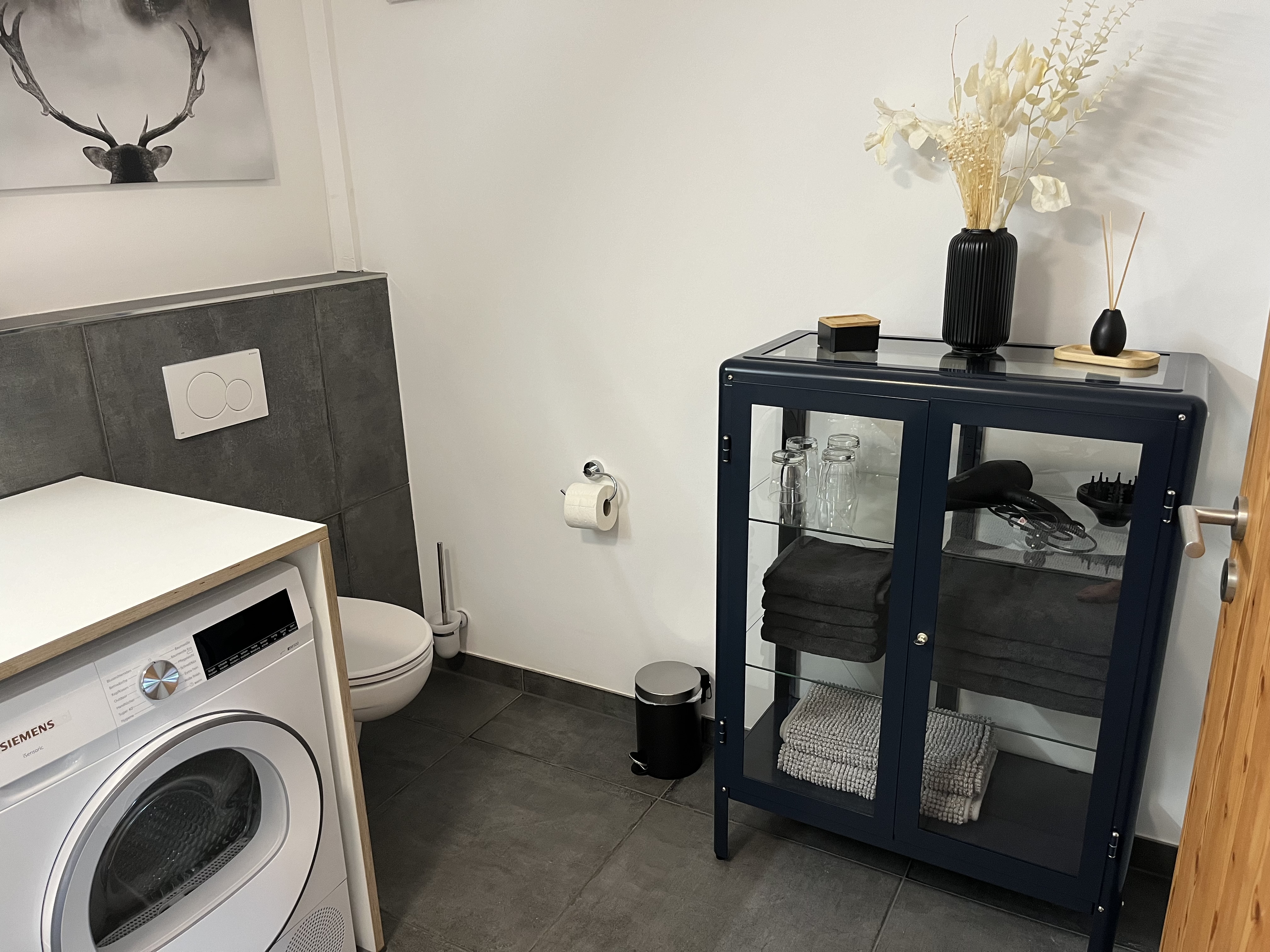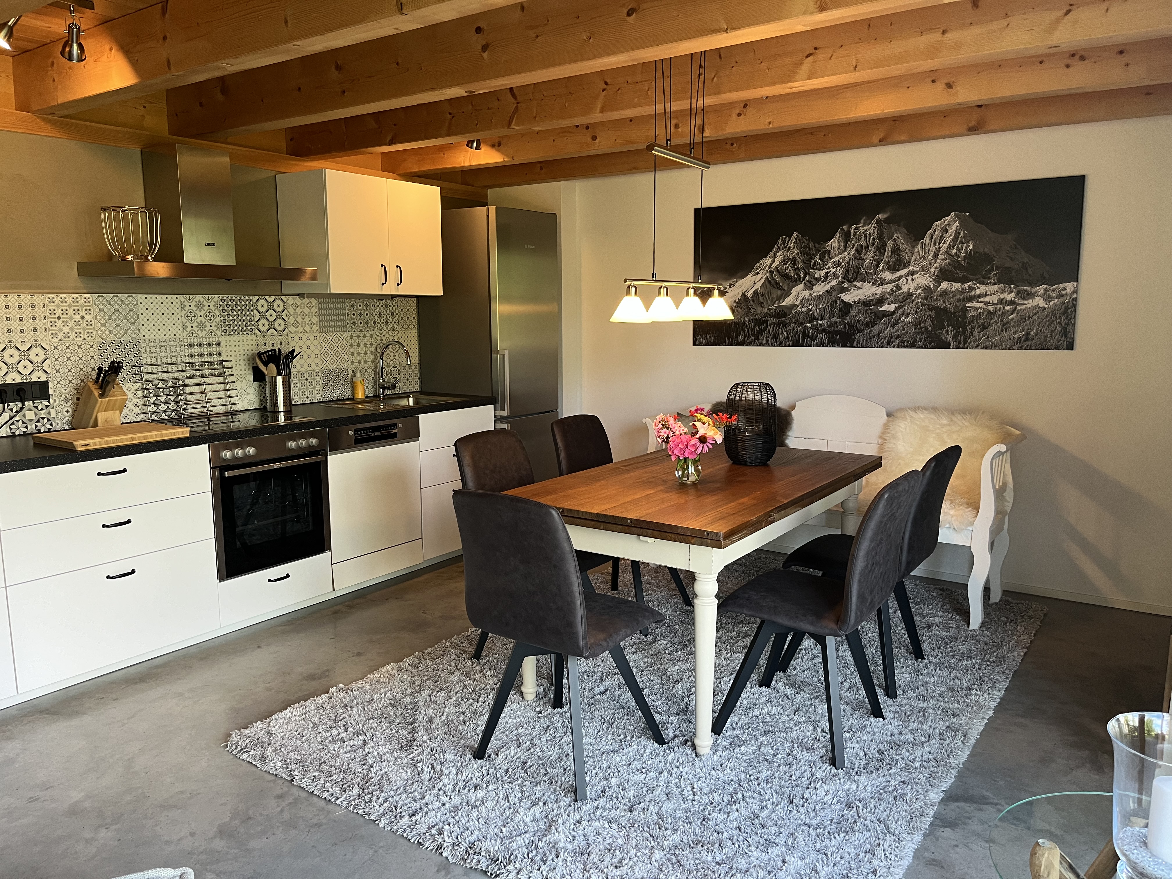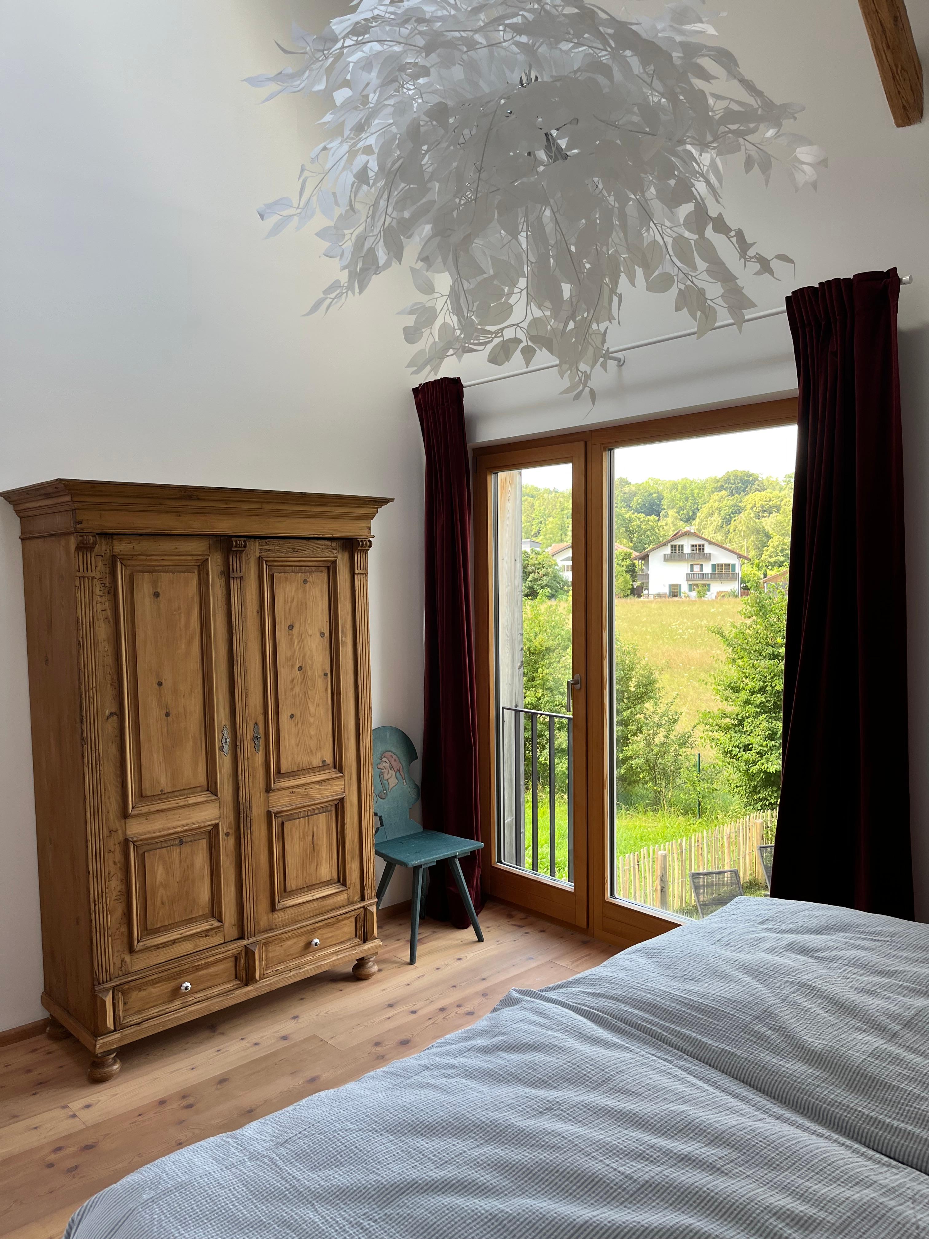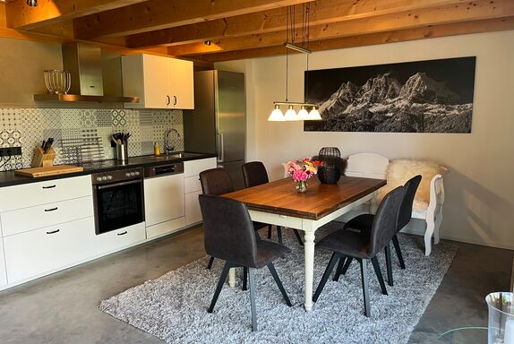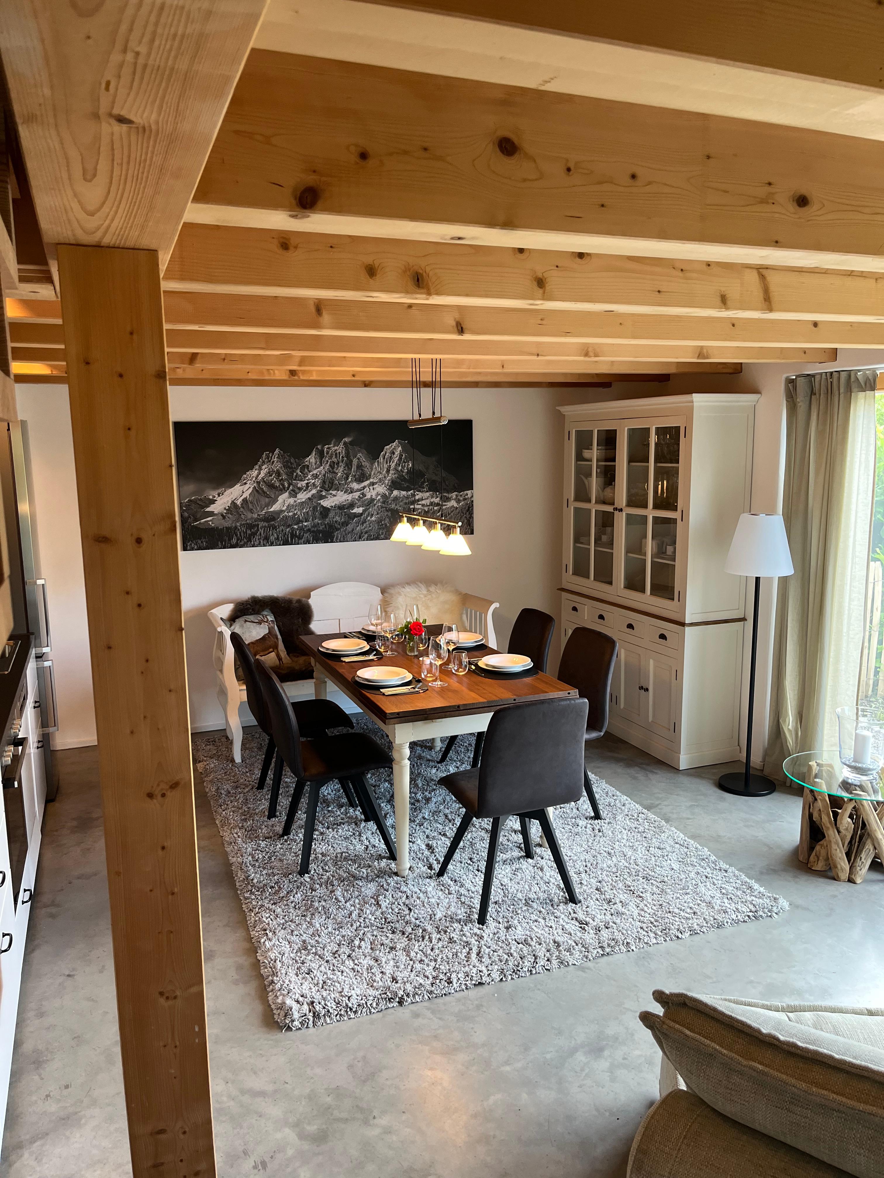 Die Suite verbindet modernen Komfort mit rustikalem Charme und ist mit allem ausgestattet, was Sie für einen erholsamen Aufenthalt benötigen. Von einem geräumigen Wohnbereich mit Kaminofen über eine voll ausgestattete Küche bis hin zu einem komfortablen Schlafzimmer sowie zwei weiteren gemütlich-eleganten Zimmern, von denen eines über eine Galerie zum Schlafen, Lesen und in die Wolkenschauen verfügt. Die Verwendung von nachhaltigen und ökologischen Baumaterialien wie Holz, Naturstein, Lehmputz und warme Ziegeln sorgen für ein angenehmes und gesundes Raumklima. Das in Weiß, Grau und Schwarz gehaltene Badezimmer mit großformatigen Natursteinfliesen am Boden verfügt über eine vollautomatische Waschmaschine und einen Wäschetrockner - alles ist darauf ausgelegt, Ihren Aufenthalt angenehm und entspannt zu machen.