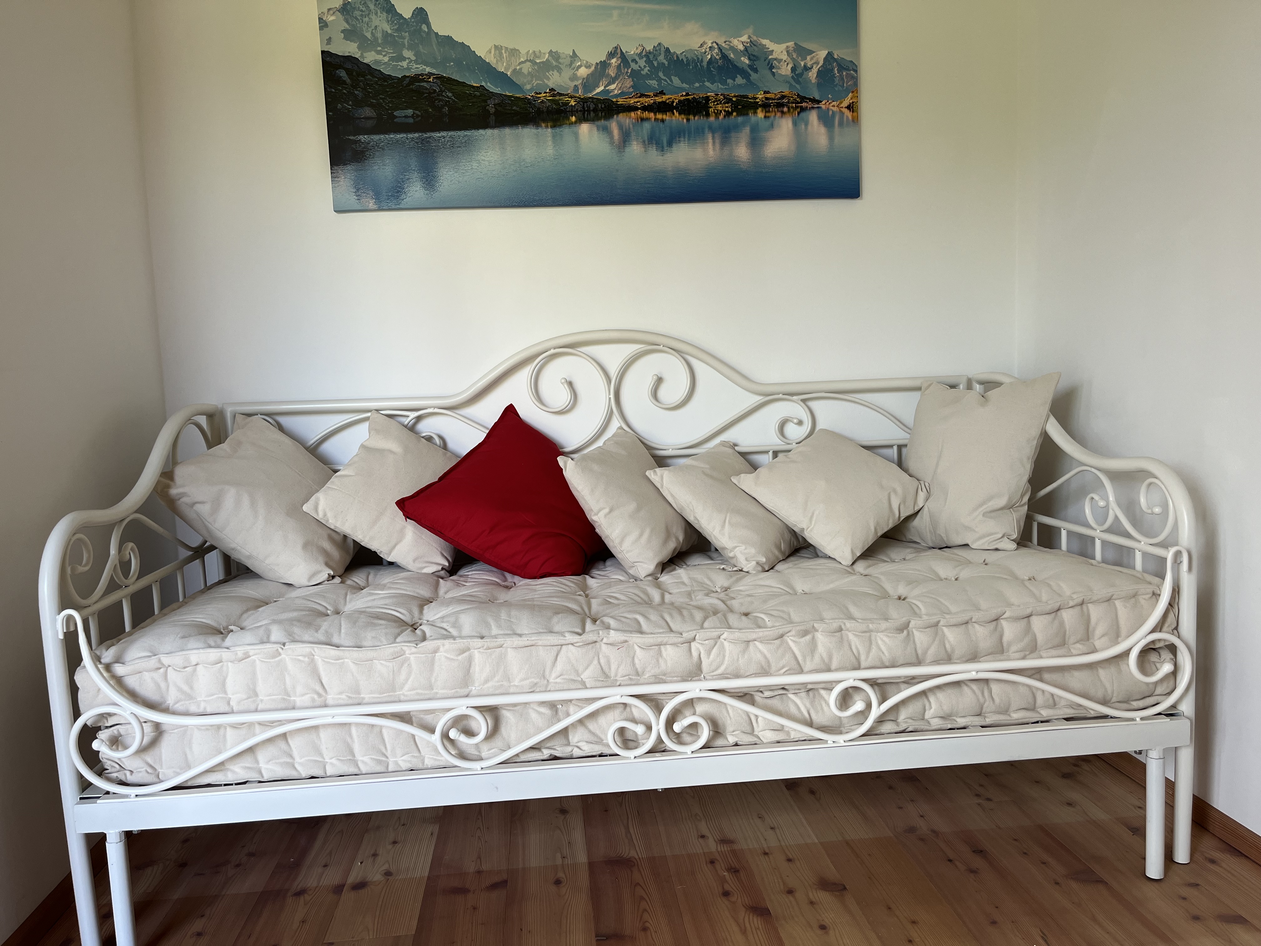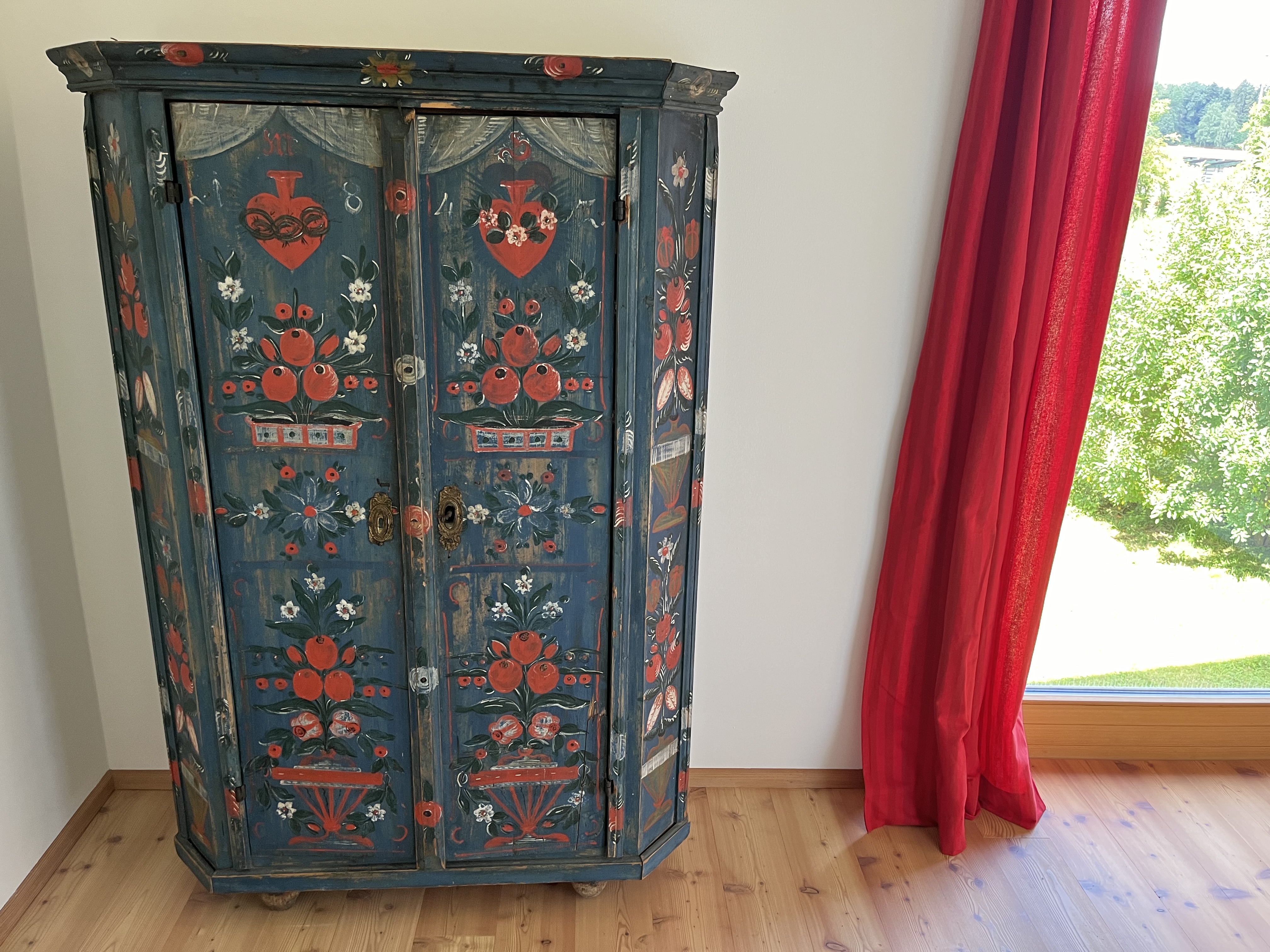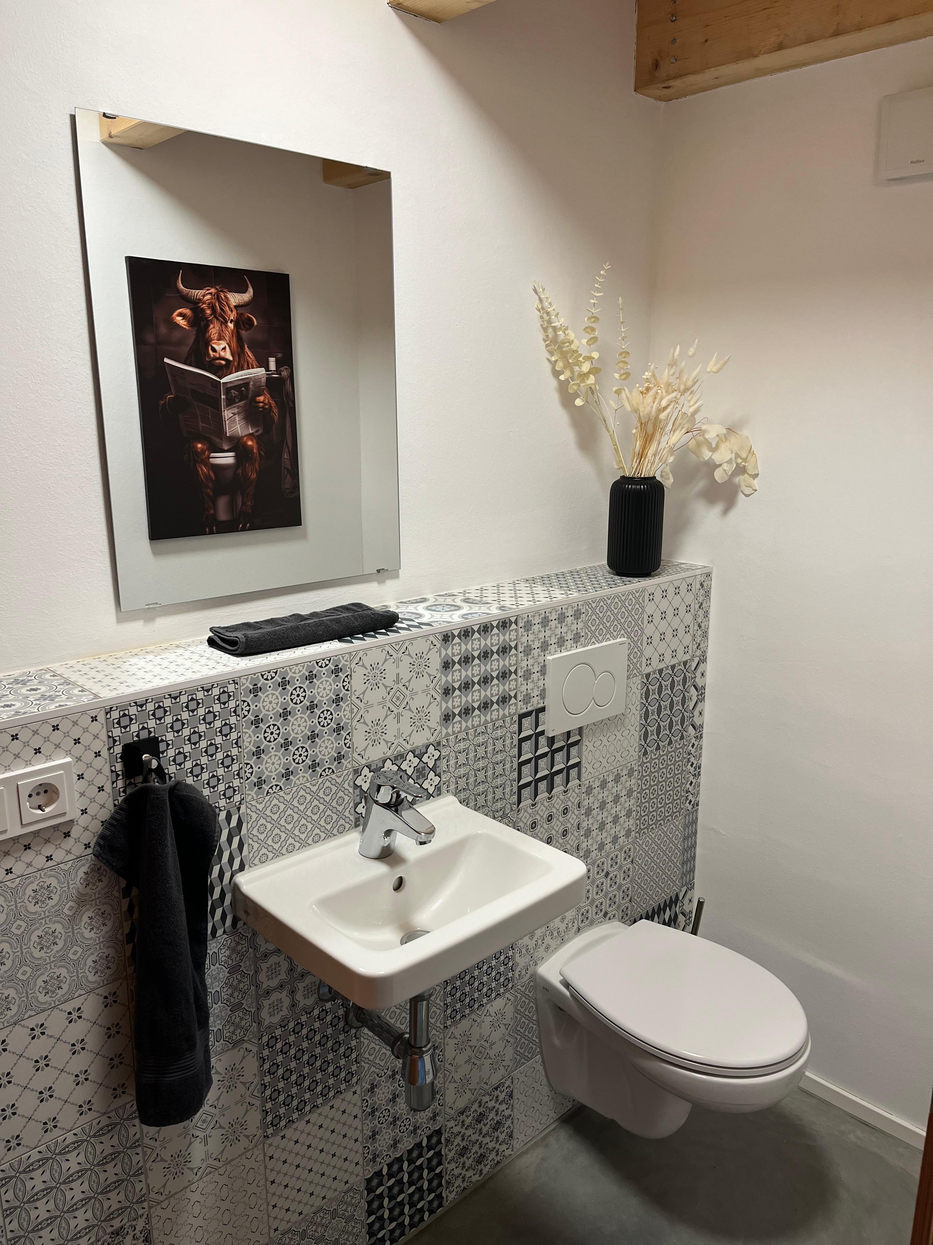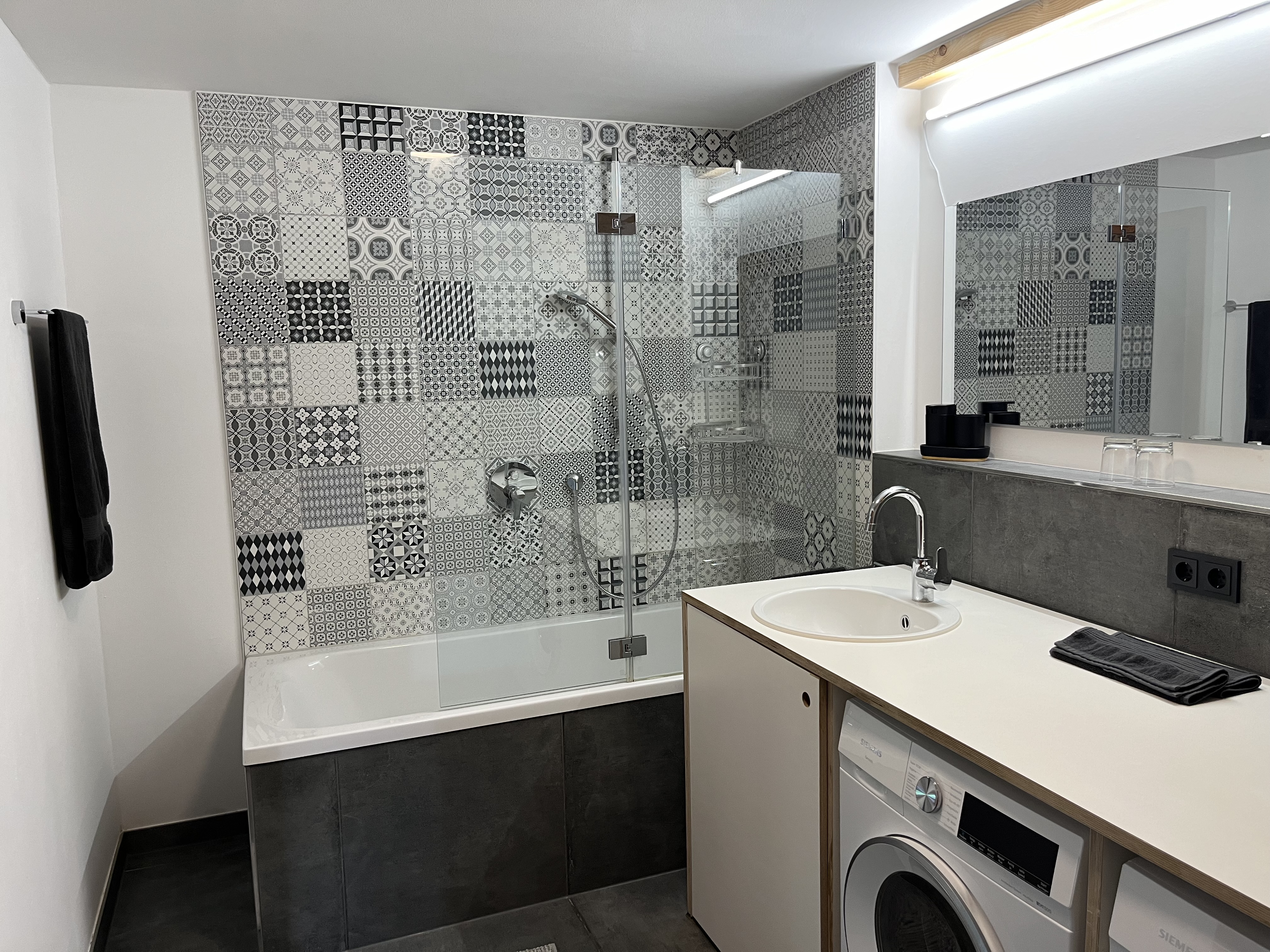 Die Suite verbindet modernen Komfort mit rustikalem Charme und ist mit allem ausgestattet, was Sie für einen erholsamen Aufenthalt benötigen. Von einem geräumigen Wohnbereich mit Kaminofen über eine voll ausgestattete Küche bis hin zu einem komfortablen Schlafzimmer sowie zwei weiteren gemütlich-eleganten Zimmern, von denen eines über eine Galerie zum Schlafen, Lesen und in die Wolkenschauen verfügt. Die Verwendung von nachhaltigen und ökologischen Baumaterialien wie Holz, Naturstein, Lehmputz und warme Ziegeln sorgen für ein angenehmes und gesundes Raumklima. Das in Weiß, Grau und Schwarz gehaltene Badezimmer mit großformatigen Natursteinfliesen am Boden verfügt über eine vollautomatische Waschmaschine und einen Wäschetrockner - alles ist darauf ausgelegt, Ihren Aufenthalt angenehm und entspannt zu machen.