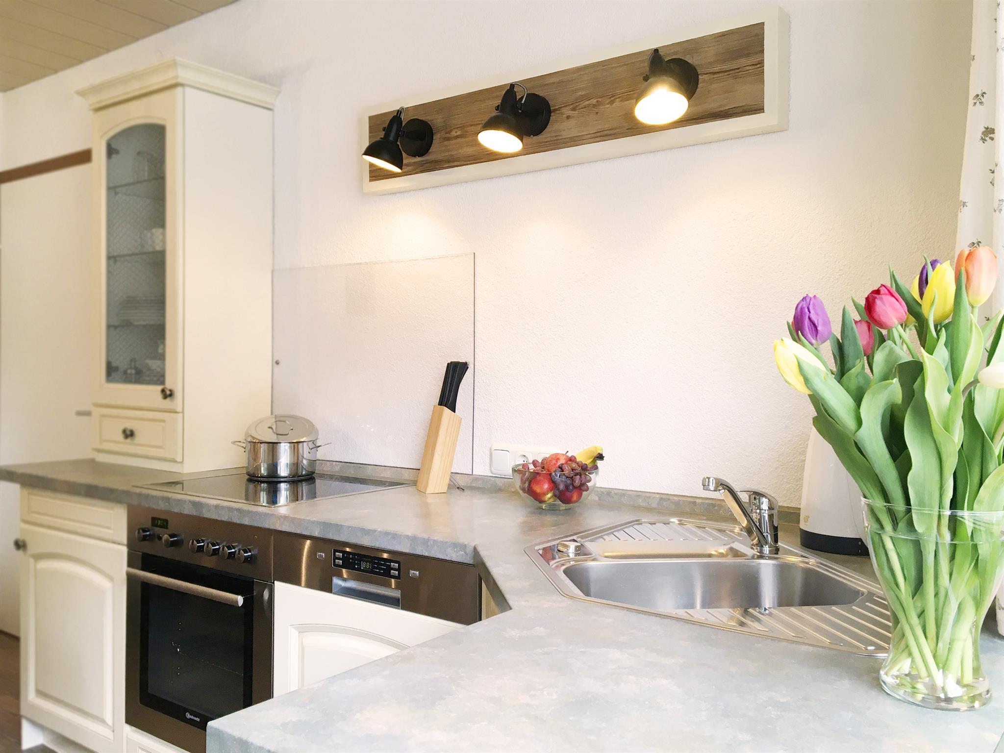 helle, geräumige Wohnung mit großer Sonnenterrasse, 1 Doppelzimmer mit Zusatzbett, abgeschlossene Küche, Geschirrspülmaschine, Kaffeemaschine, Dusche/WC, Vorraum, Sat-TV, Internetanschluss, Gitterbett, Hochstuhl