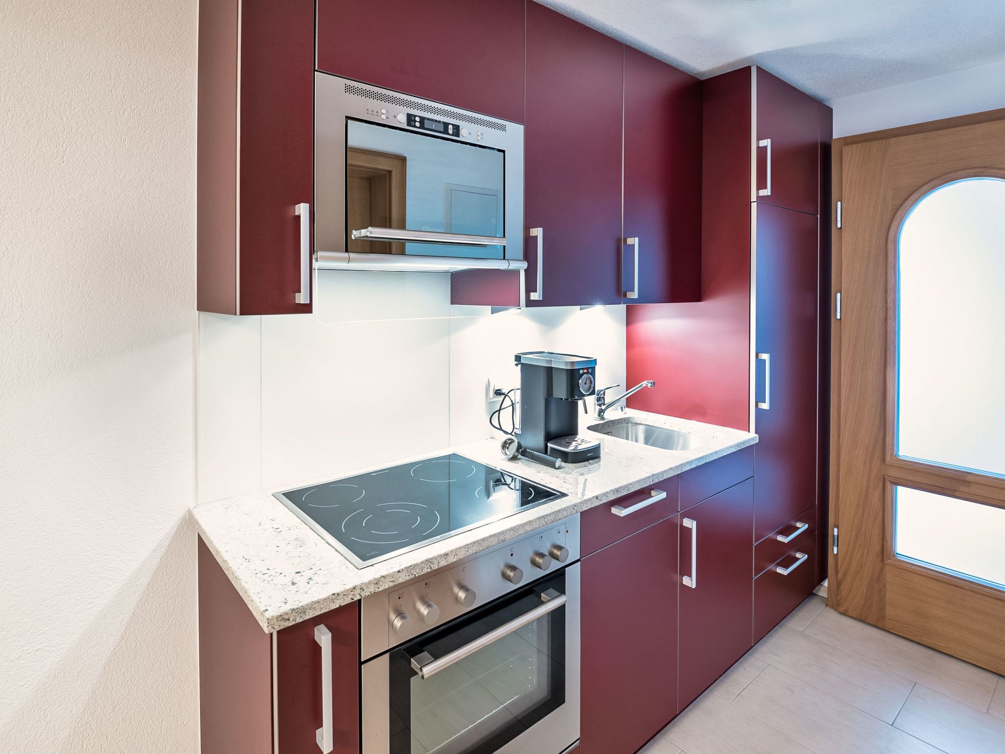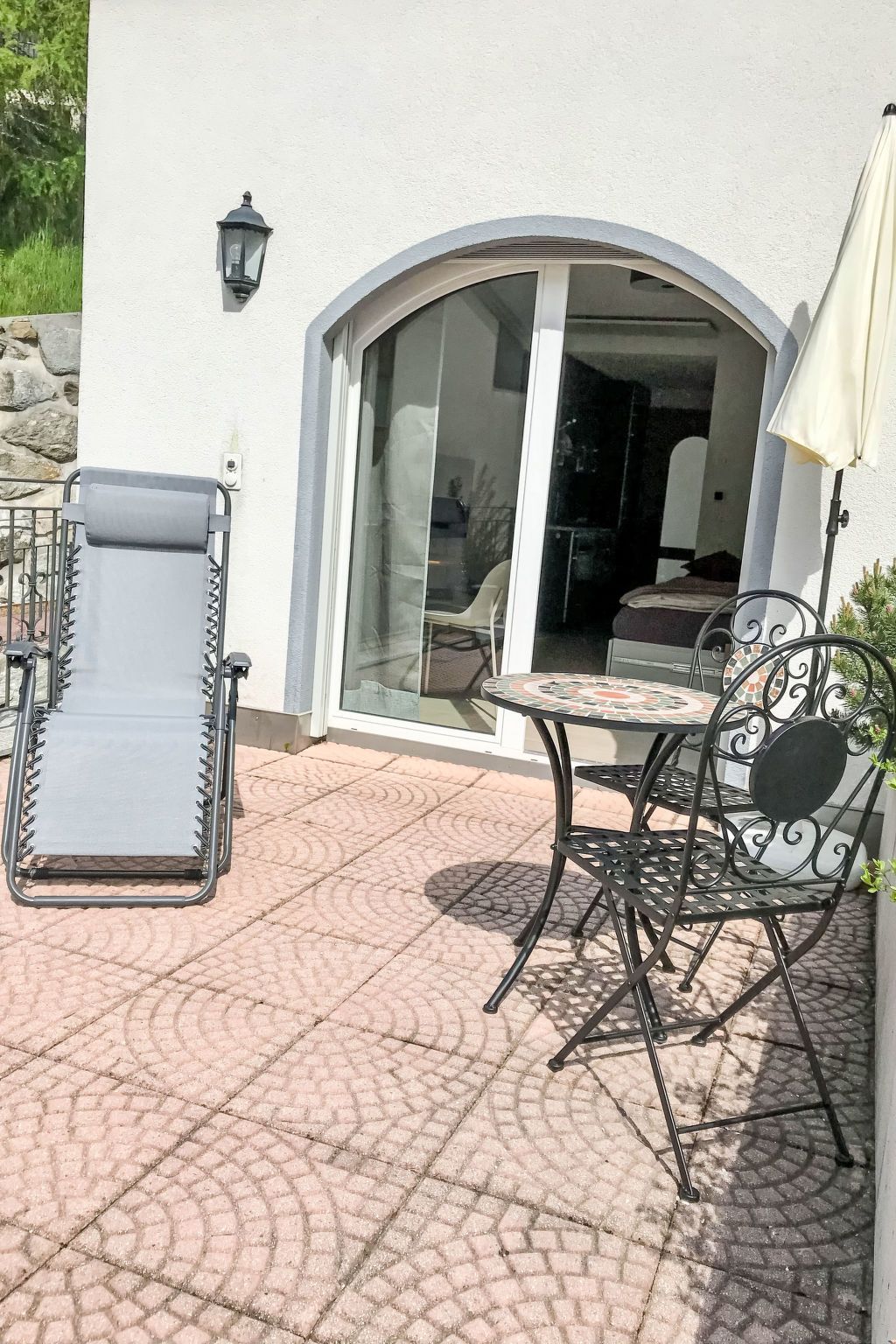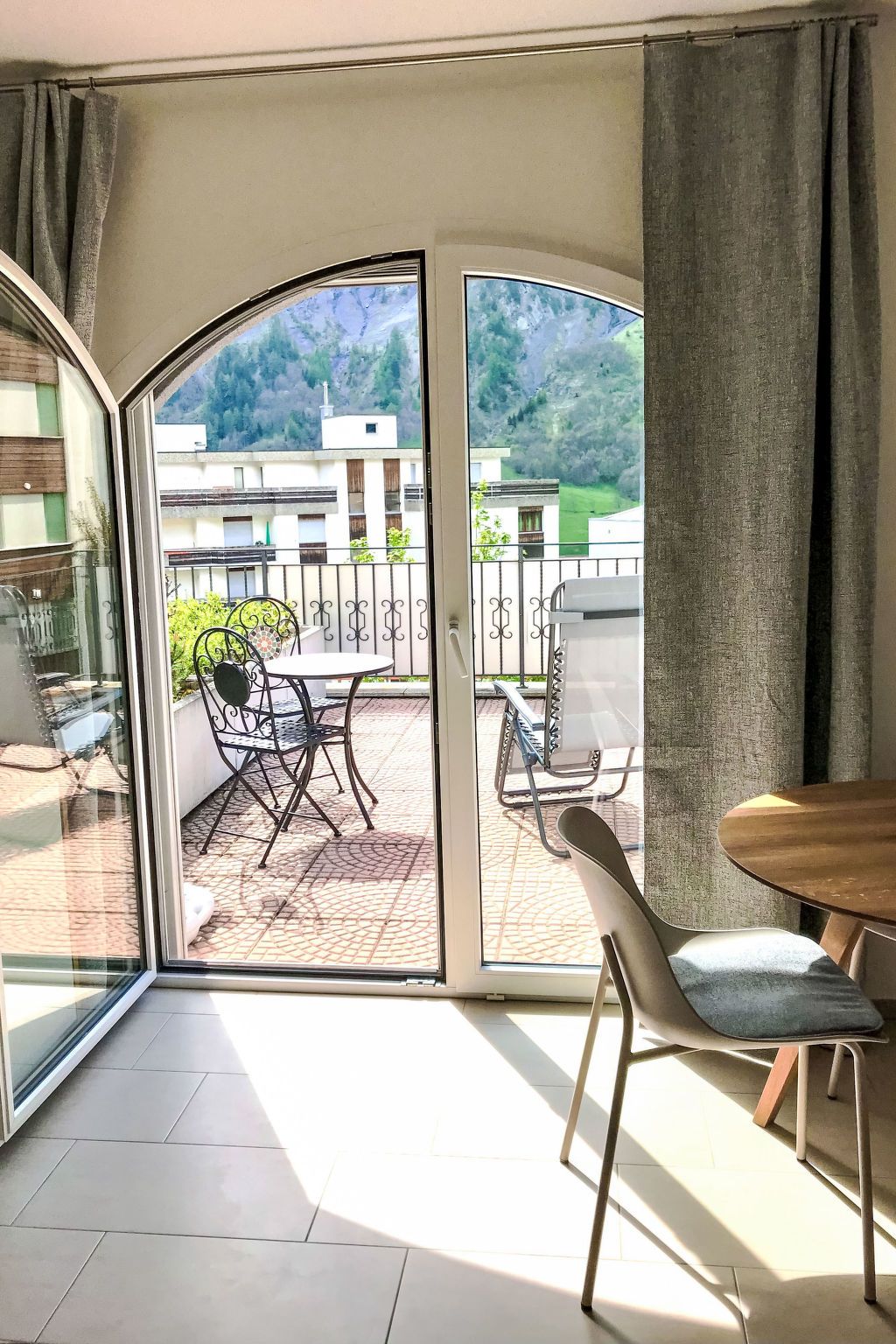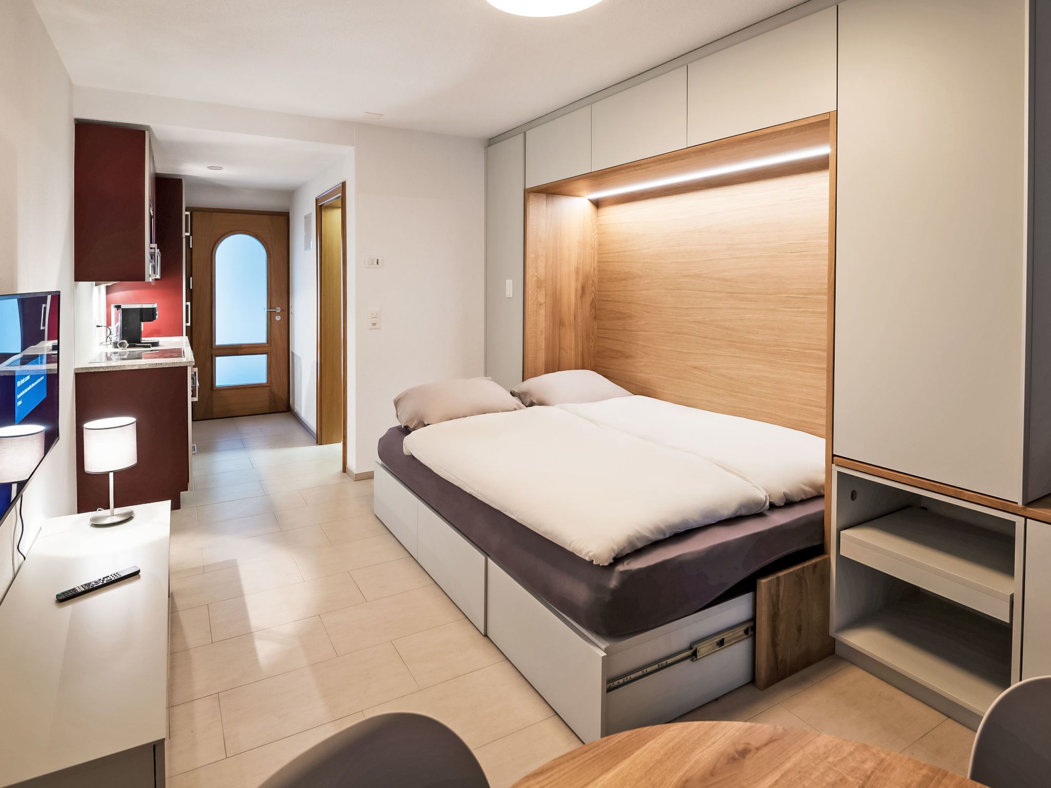 B01, 1-Zimmer-Wohnung 28 m2, im Erdgeschoss. Komfortabel und modern eingerichtet: Wohn-/Schlafzimmer mit 1 Doppelbett (160 cm, Länge 200 cm), Esstisch und Sat-TV (Flachbildschirm). Ausgang zur Terrasse. Offene Küche (Backofen, Geschirrspüler, 4 Glaskeramikplatten, Toaster, Mikrowelle, elektrische Kaffeemaschine, Racletteofen, Fondue Set (Käse)). Dusche/WC. Grosse Terrasse. Terrassenmöbel. Schöne Sicht auf die Berge und die Landschaft. Zur Verfügung: Internet (Wireless LAN, gratis). Parkplatz (überdacht). Bitte beachten: Nichtraucher-Unterkunft.
