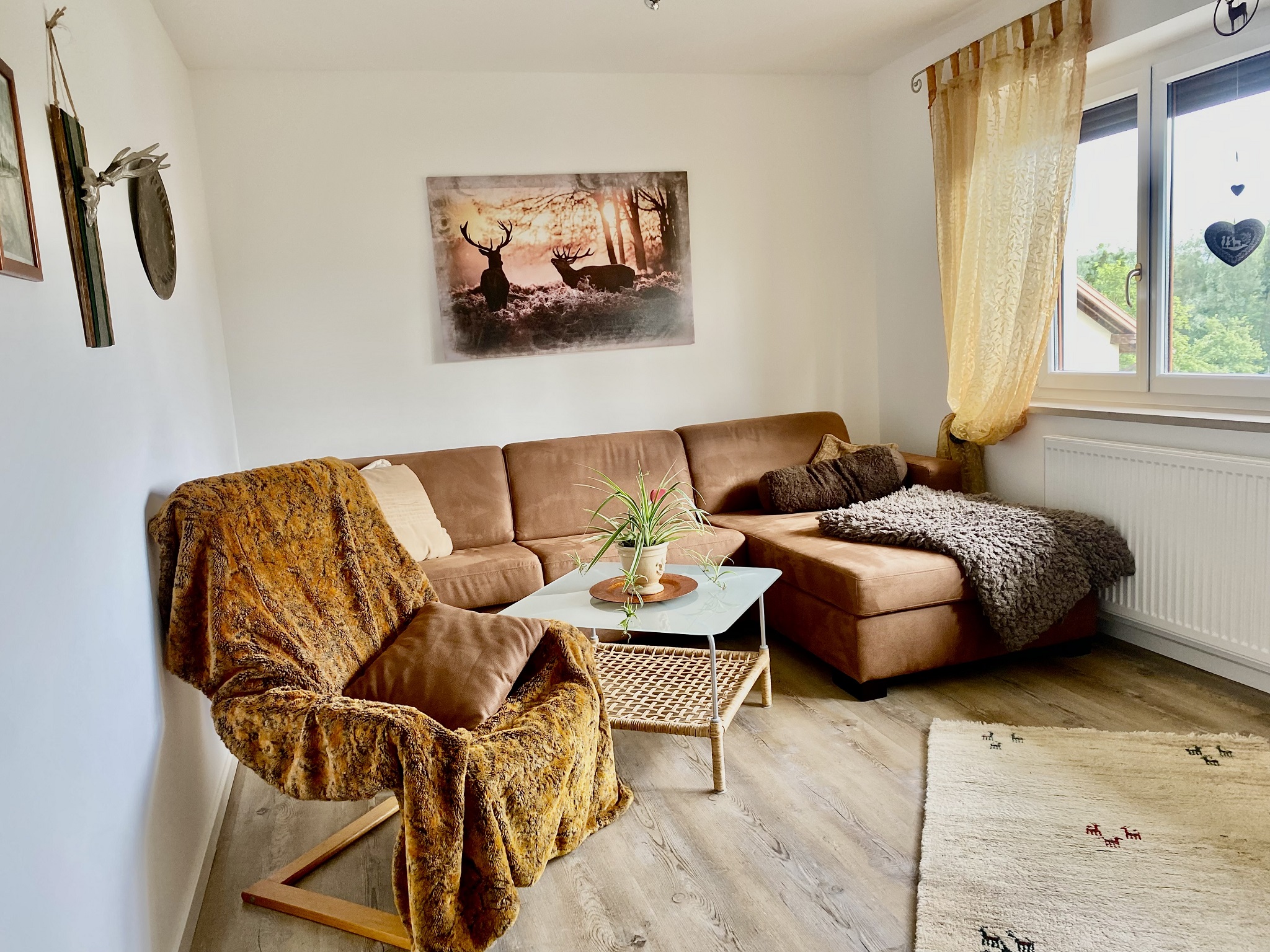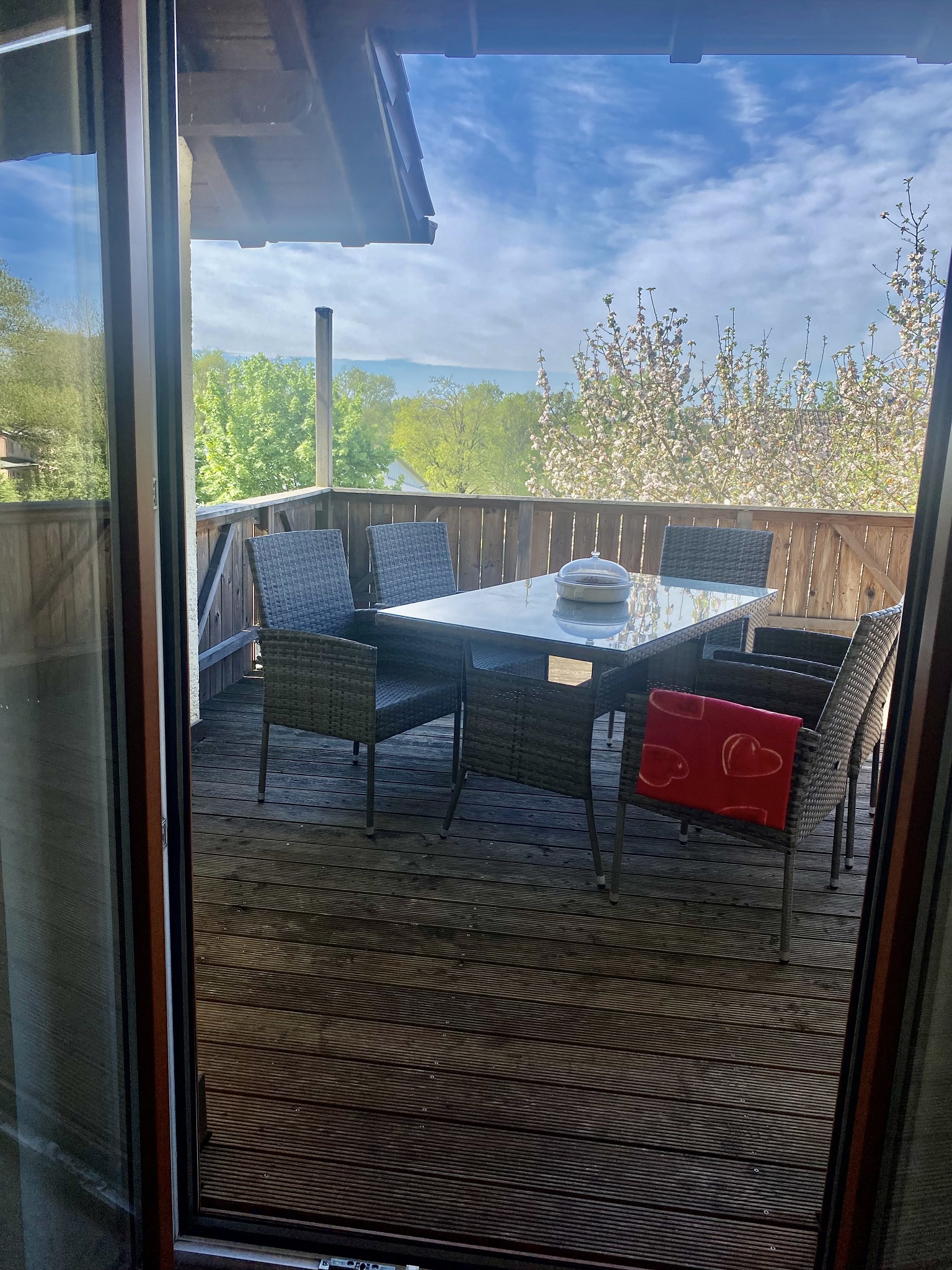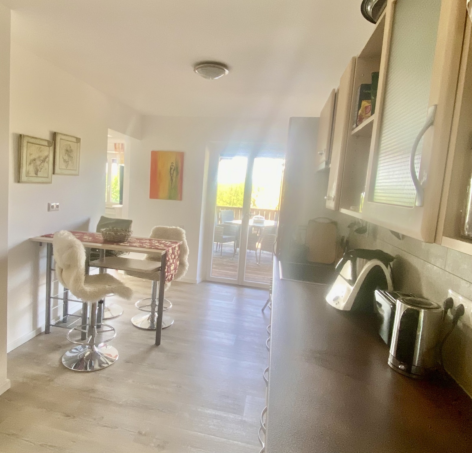 Die freundliche Küche lädt ein zum gemeinsamen Kochen und gemütlichen beisammen sein. Im Sommer, draußen auf der großen Dachterrasse auf einer 6er Sitzgelegenheit mit großem Tisch. Der Ausblick bezaubert auf die Aulandschaft oder den hauseigenen Garten.