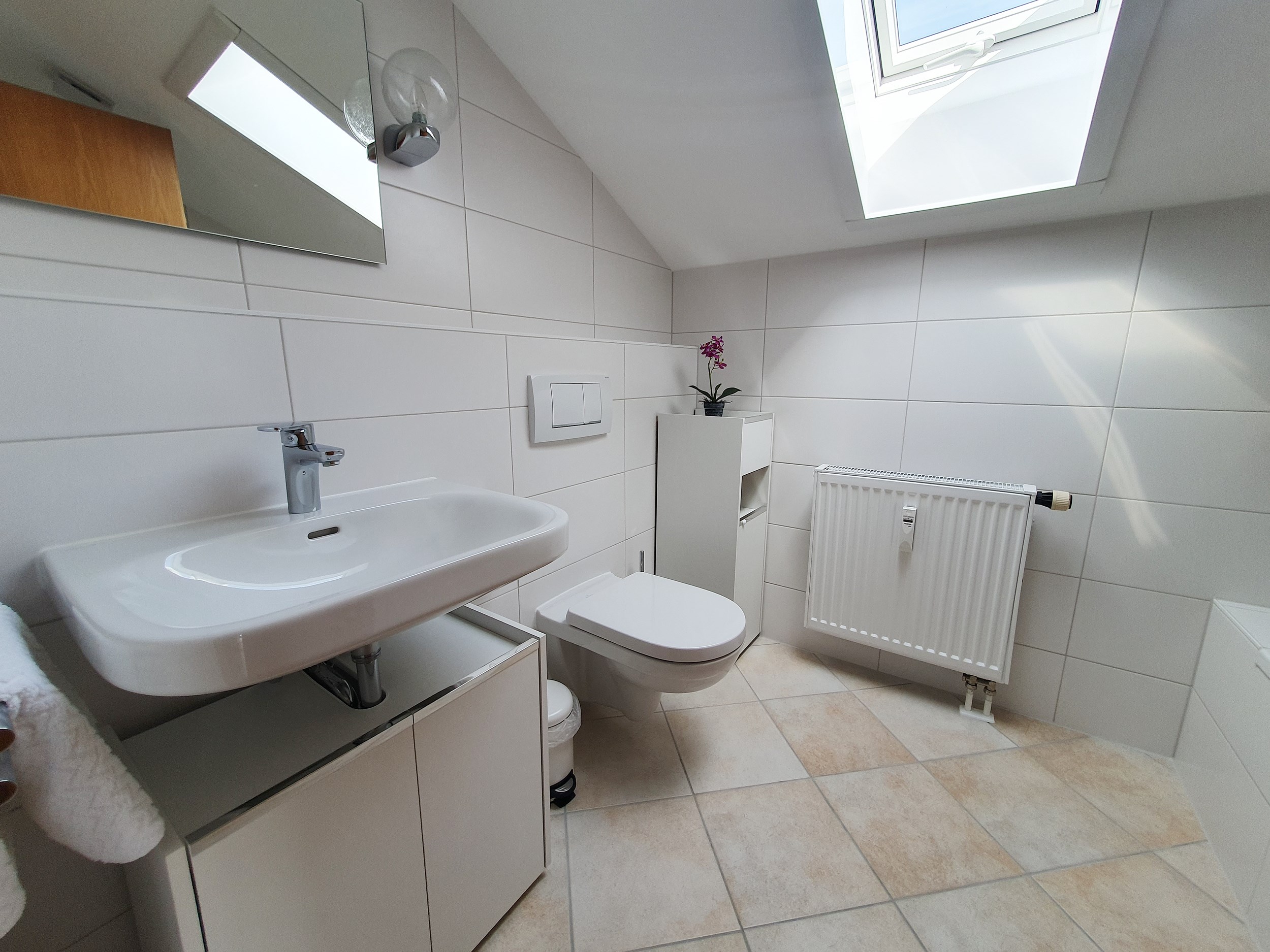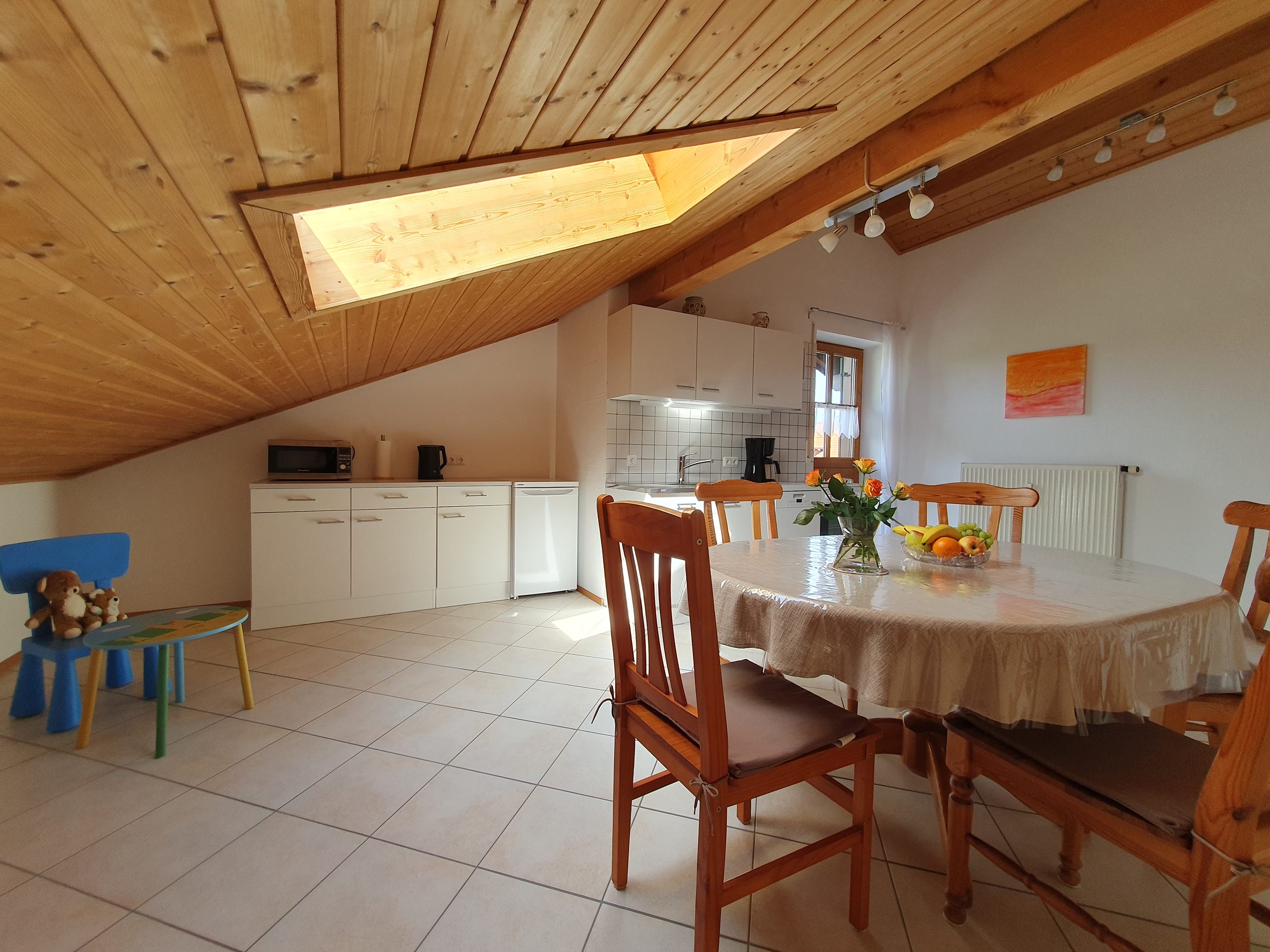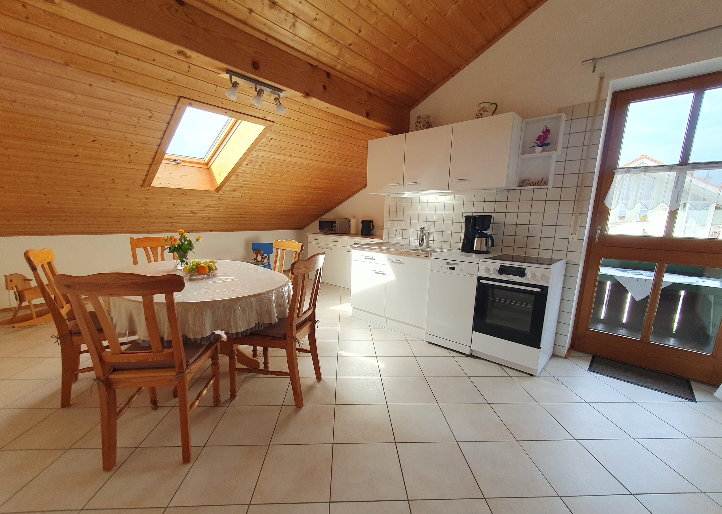 Es erwartet Sie eine großzügig geschnittene Wohnung mit 90m² im Dachgeschoss, die reichlich Platz für einen erholsamen Urlaub bietet. Starten Sie Ihren Tag mit einem gemütlichen Frühstück und genießen Sie den herrlichen Blick auf die Chiemgauer Berge vom schönen Westbalkon aus. Die Ferienwohnung verfügt über zwei Schlafzimmer, eines davon mit einem Ostbalkon. Bei Bedarf kann ein Zustellbett aufgestellt werden. Im Wohnzimmer befindet sich eine gemütliche Sitzgruppe mit Sat-TV. Die funktionelle Küche ist ausgestattet mit einem Herd, Backofen, Kühlschrank, Wasserkocher, Geschirrspülmaschine, Kaffeemaschine, Toaster, Mikrowelle und einem gemütlichen Essbereich. Das neu renovierte Badezimmer verfügt über eine Badewanne/Dusche und ein WC. Im großen Abstellraum haben Sie die Möglichkeit, Ihr Gepäck zwischenzulagern. Ein Hauseigener Parkplatz wird Ihnen kostenfrei zur Verfügung gestellt. Kostenfreies WLAN ist in der Wohnung vorhanden. Haustiere sind nicht erlaubt. Für mitgebrachte Fahrräder steht Ihnen eine abschließbare Garage zur Verfügung.