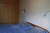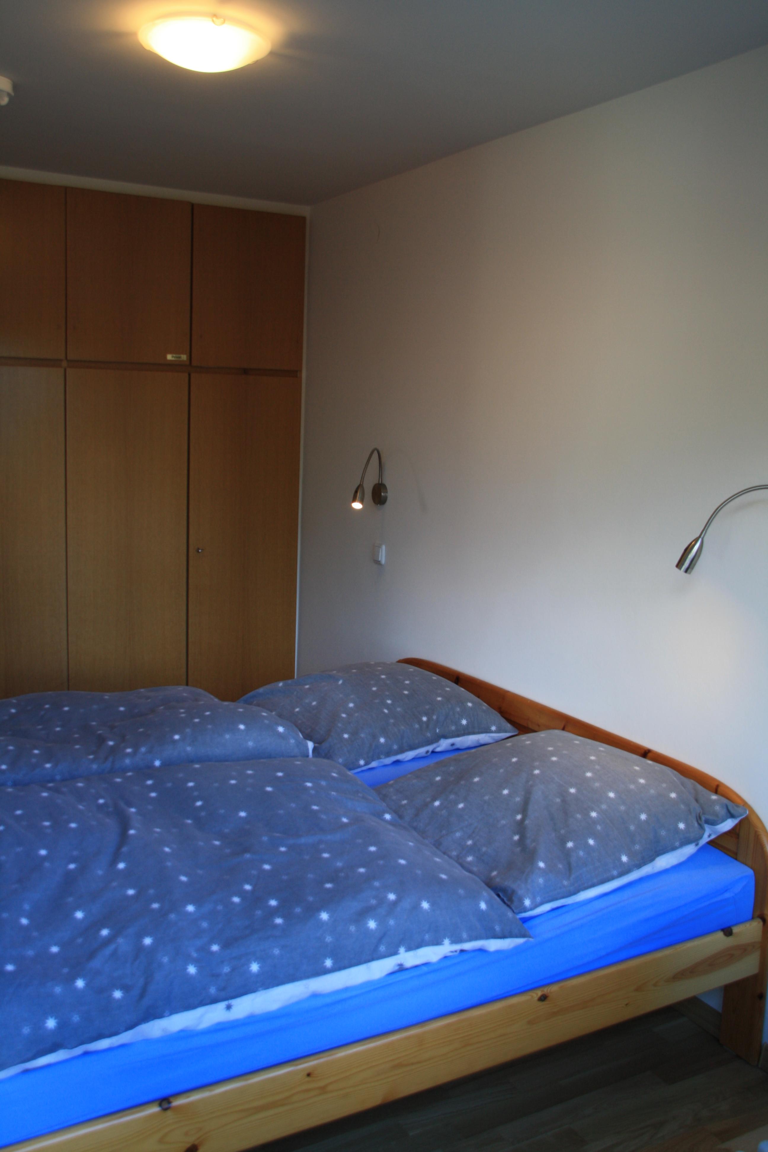 * Schlafzimmer (Parkett), abgetrennt durch Wand mit Durchgängen, Doppelbett, dimmbare Leselampen, deckenhoher Schrank