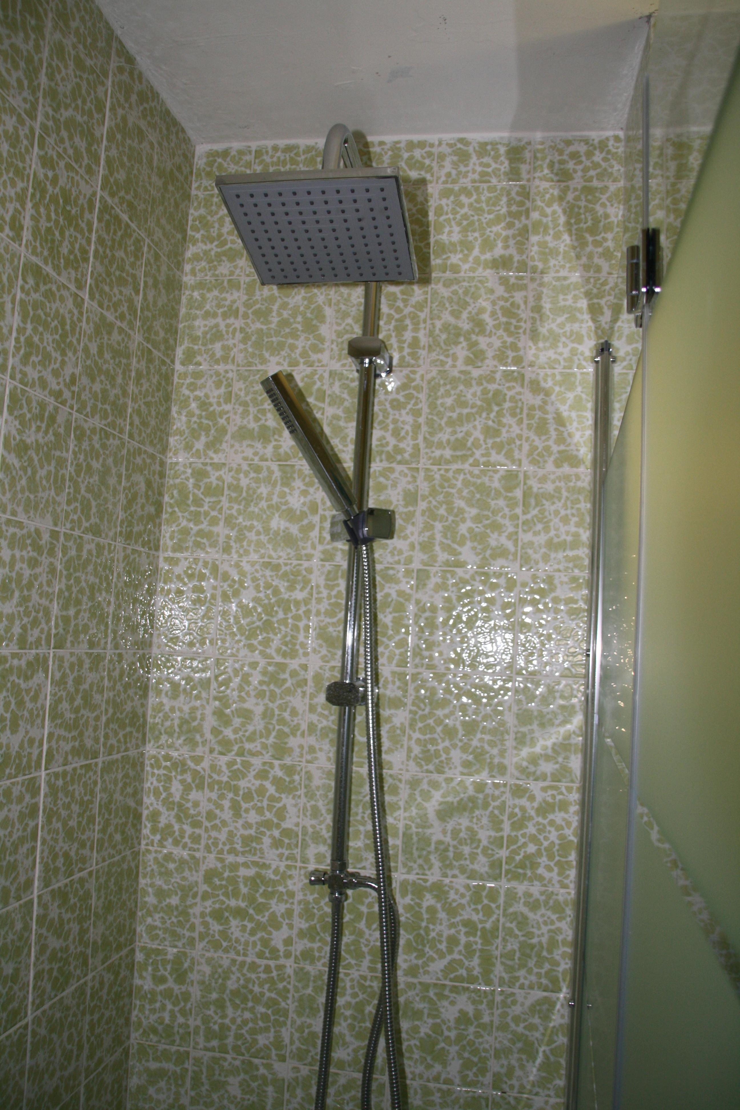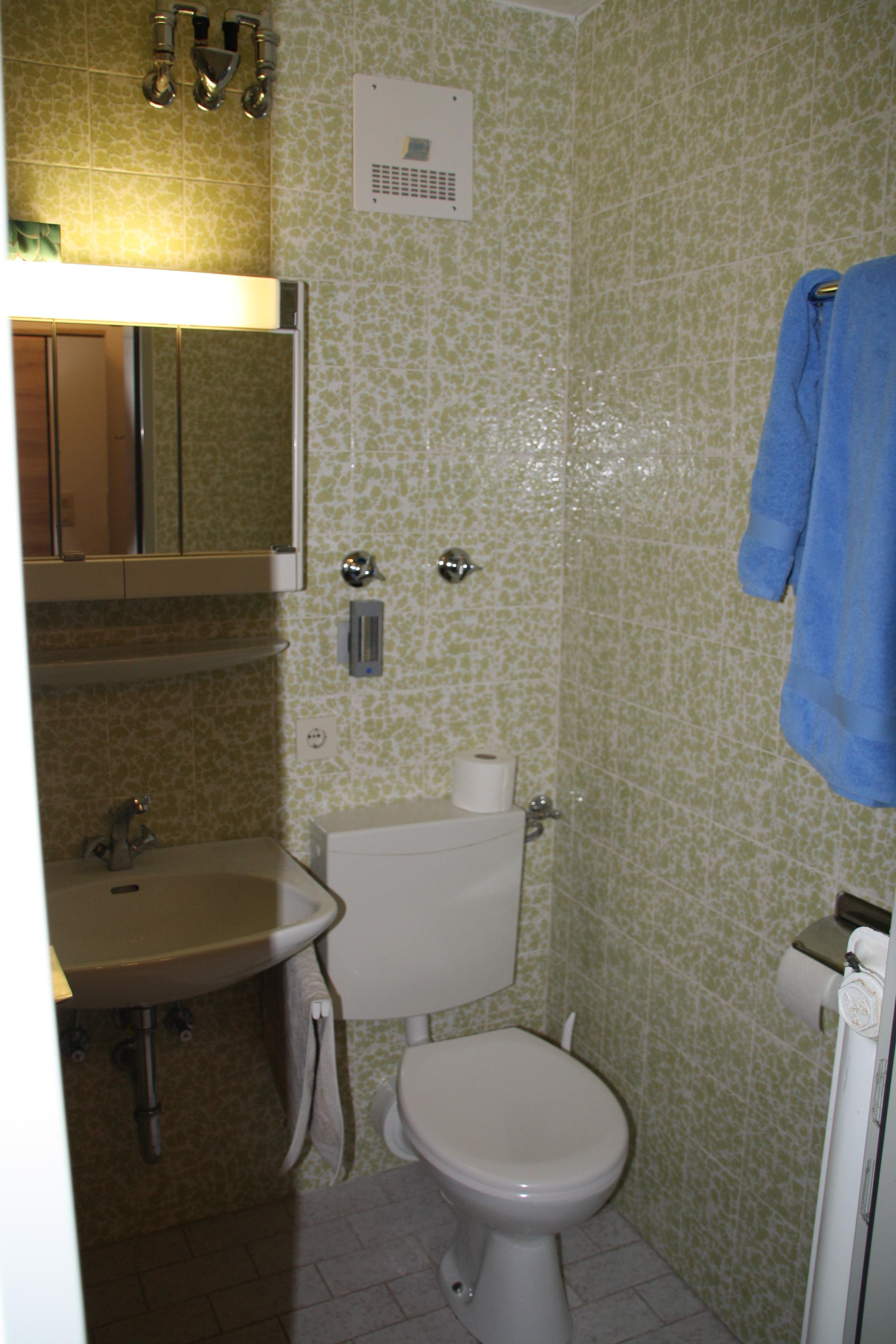 * Bad mit Charme der Siebzigerjahre: Badewanne mit Regendusche, Waschbecken, Badschrank, Toilette