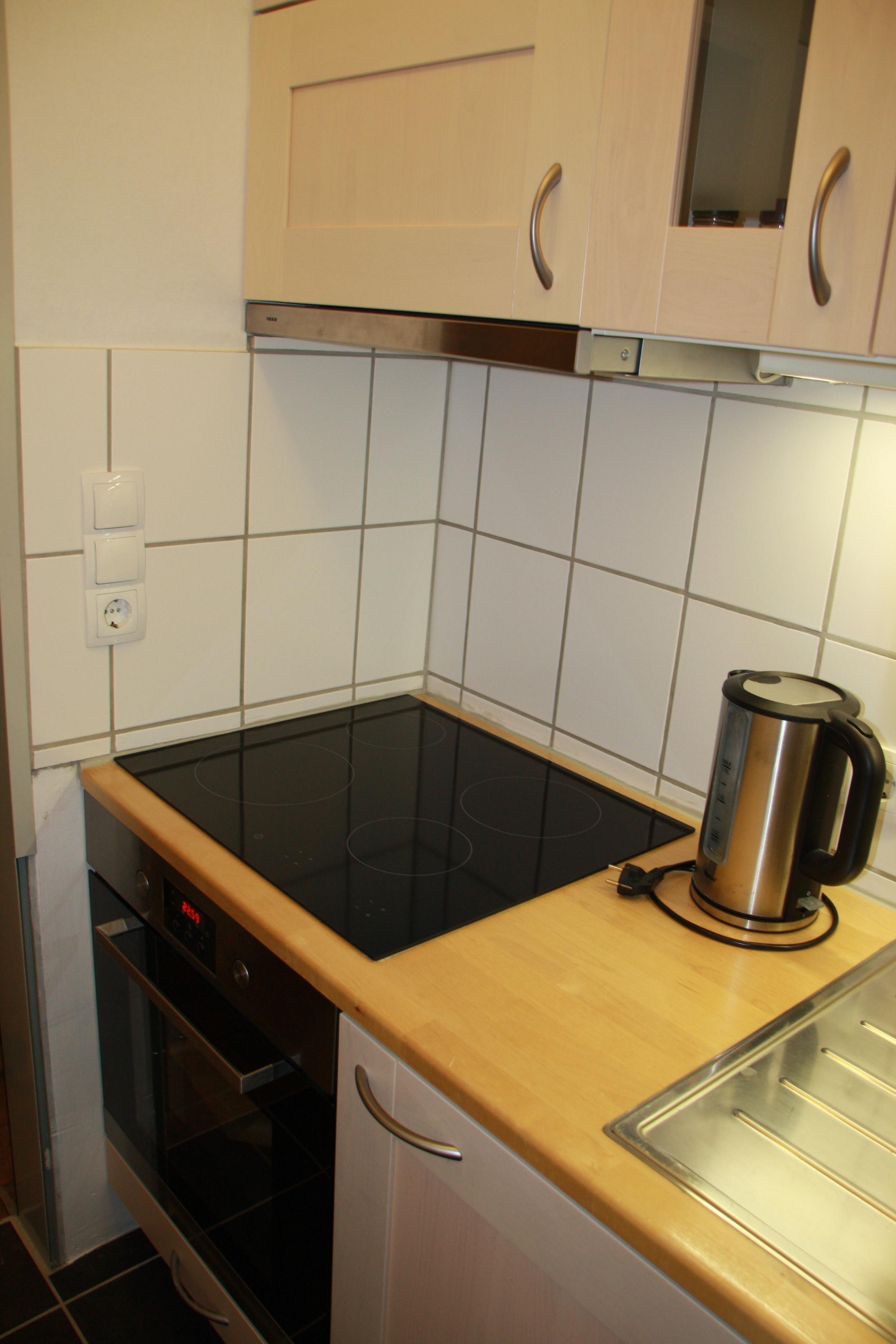 * Küche: Herd mit vier Kochplatten, Backofen, Dunstabzugshaube, Spüle, Kühlschrank mit Eisfach, Wasserkocher, Toaster, Eierkocher, Frenchpress, Geschirr, Kochutensilien