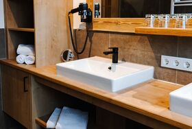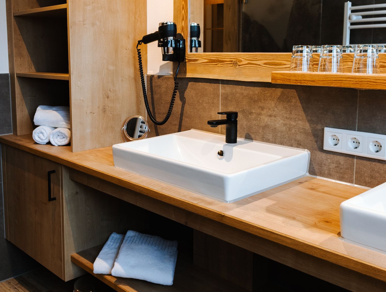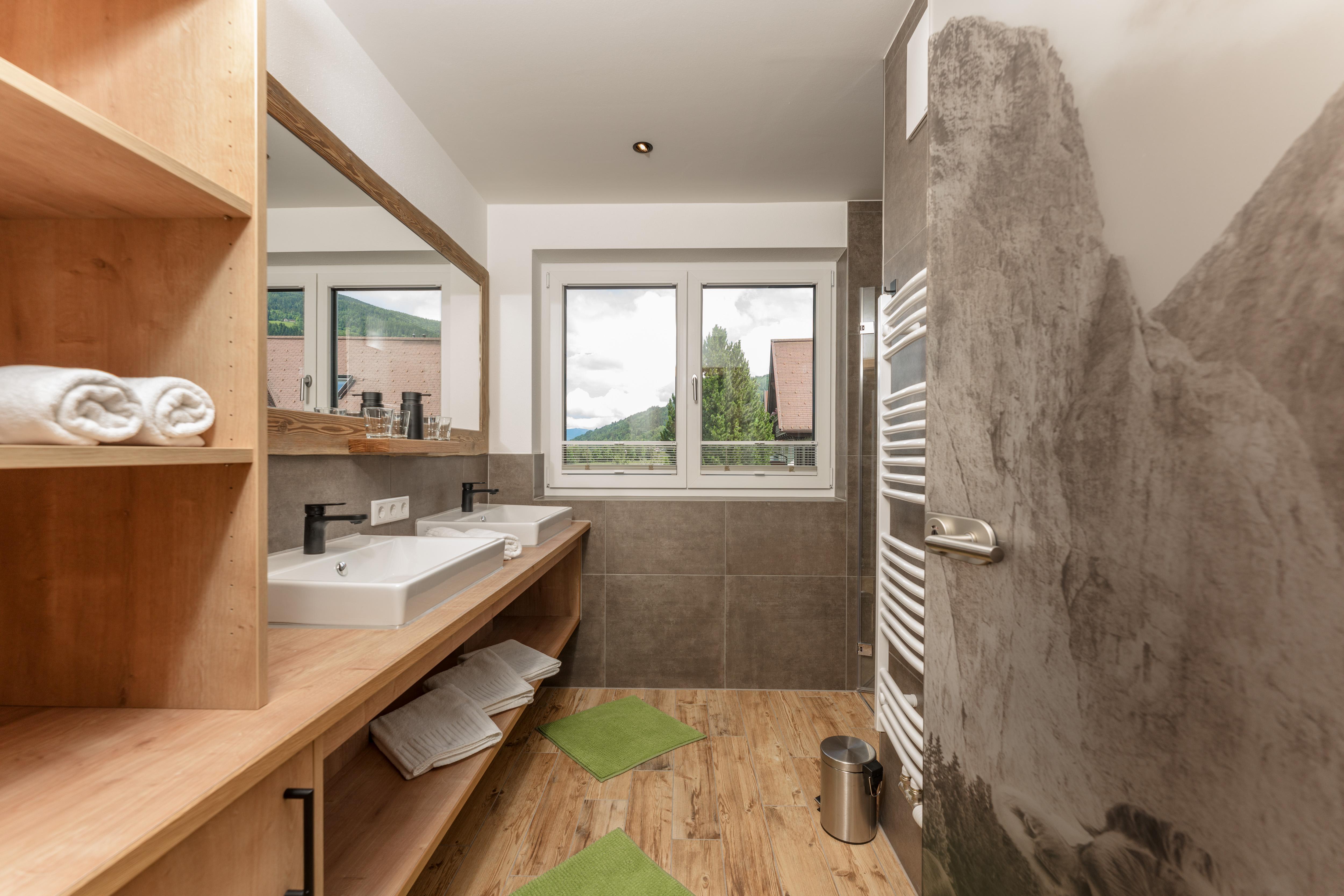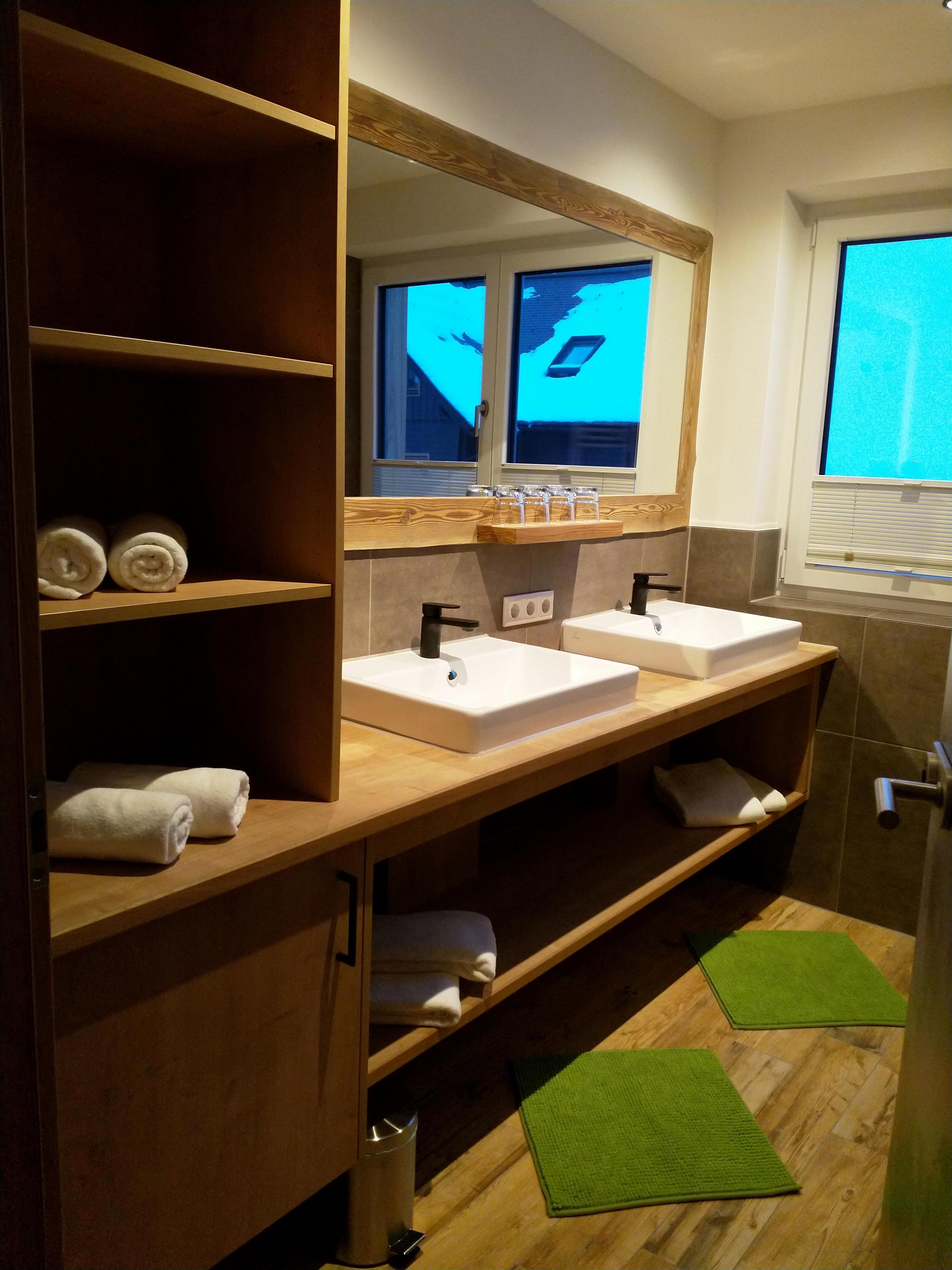 • Badezimmer mit Doppelwaschtisch und Regendusche