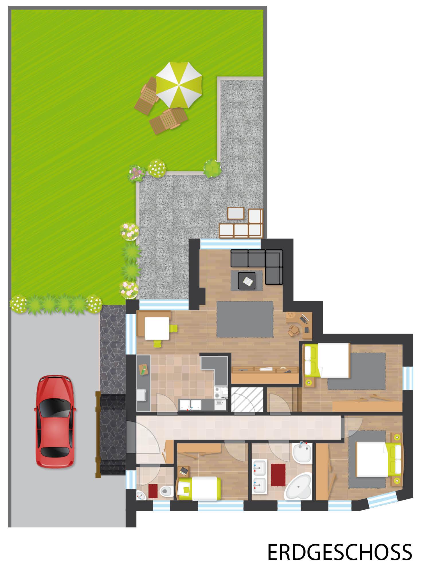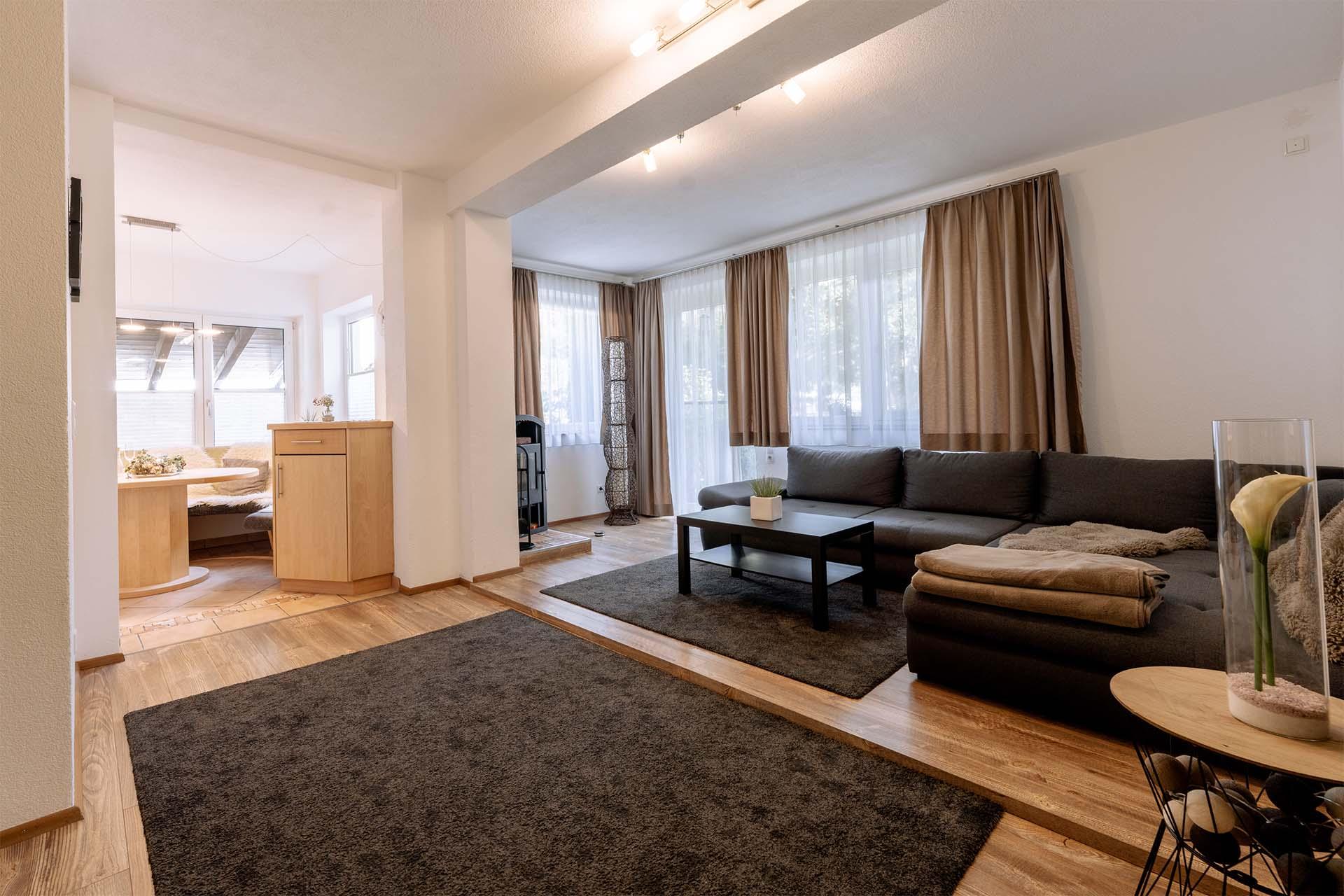 Unser Apartment Steindl (ca. 95m²) besteht aus 2 Doppelzimmern inkl. TV, 1 Einzelzimmer inkl. TV, 1 Badezimmer mit Badewanne und Dusche/WC inkl. Haarföhn, extra WC separat, einem gemütlichen Wohnzimmer inkl. TV (Schlafmöglichkeit für die 6. Person), einer Küche mit Essbereich mit 4 Cerankochfeldern, Backofen, Geschirrspüler, Kühlschrank inkl. Gefrierfach, Mikrowelle, Kapselmaschine (Nespresso), Wasserkocher, Toaster. Mit Terrasse.