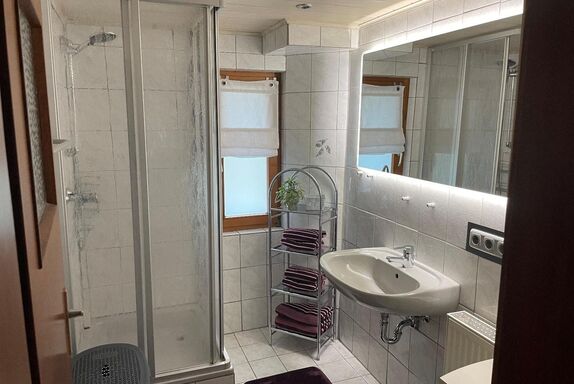 Im Badezimmer ist eine Dusche und ein großer Spiegel mit Beleuchtung und ein Föhn. Das WC ist in einem separatem Raum.