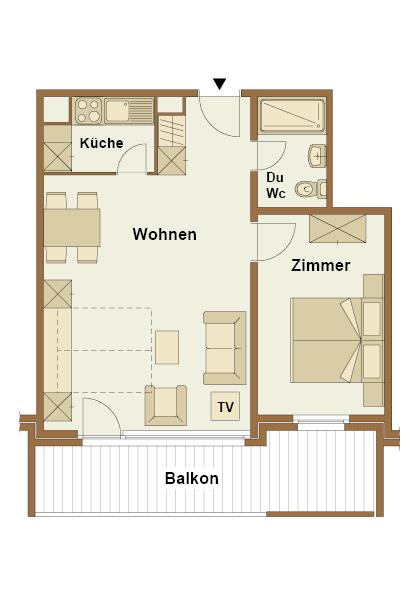 Die im Süden des Gebäudes gelegene Wohnung bietet mit ihrem grossen Balkon einen hervorragenden Ausblick in die Berge. Die Wohnung bietet auf 51m2 Platz für 4 Personen. Sie verfügt über ein Schlafzimmer mit Doppelbett und einen Ess- und Wohnraum mit einem Schrankbett/Doppelbett. Dusche/WC (neu renoviert) und Küche (neu renoviert) sind abgetrennt. Die Wohnung eignet sich sowohl für eine Familie mit 2 Kindern als auch für 4 Erwachsene.
