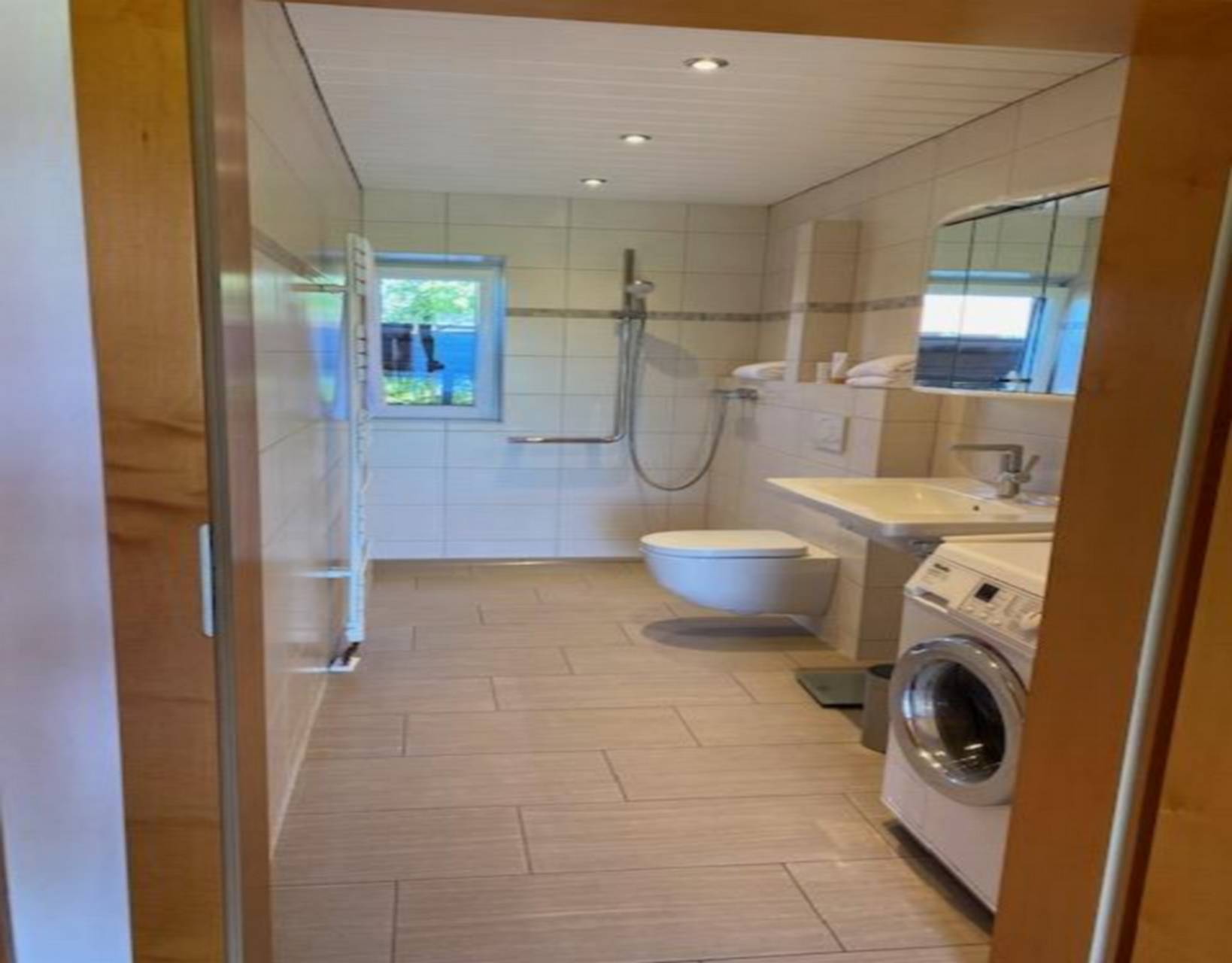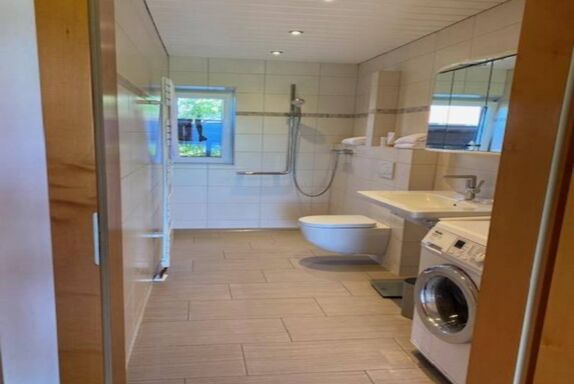 Im Badezimmer befindet sich neben der Toilette und einem Waschbecken auch eine Dusche, sowie eine Waschmaschine, welche gerne von unseren Gästen einaml in der Woche benutzt werden kann. Handtücher sind natürlich auch vorhanden.